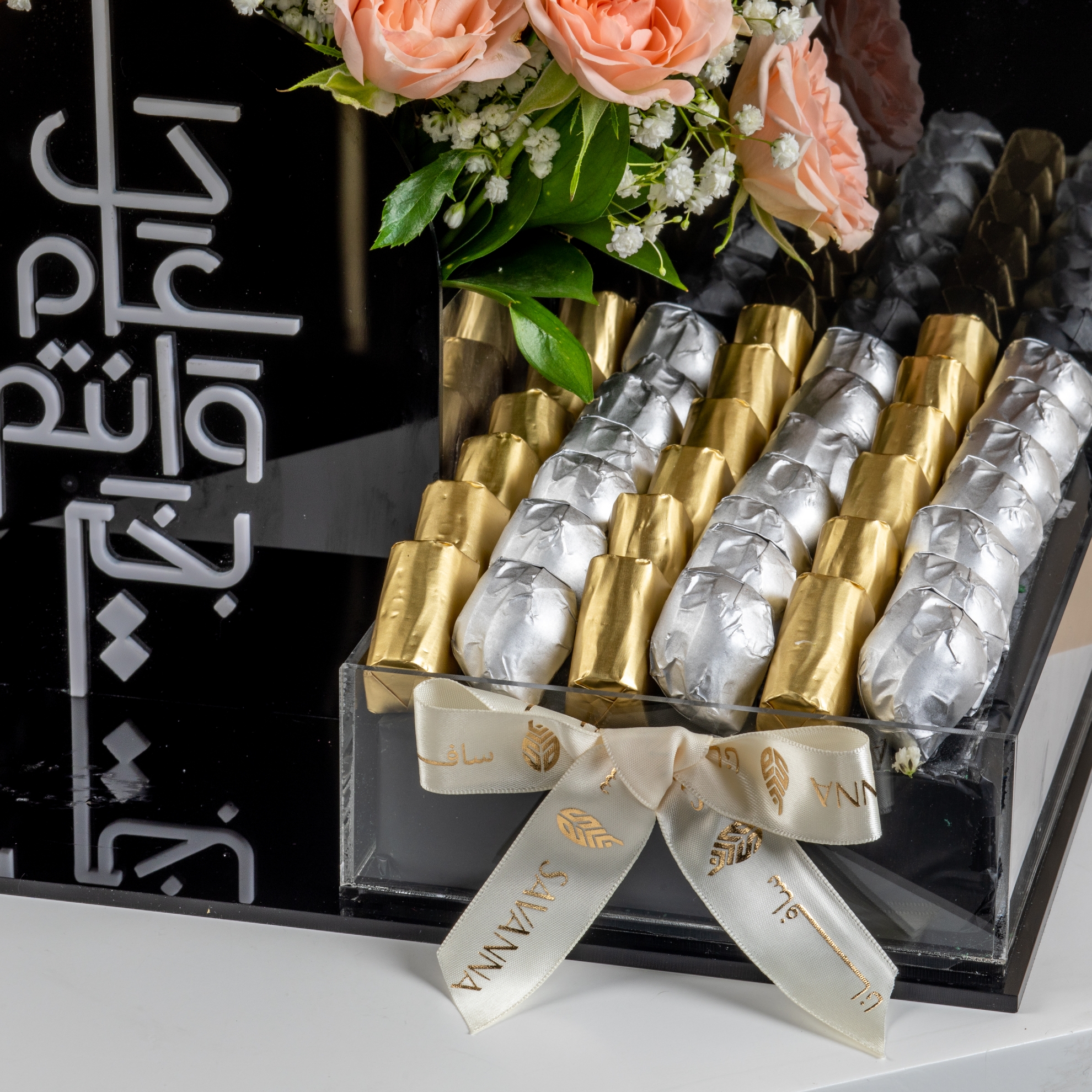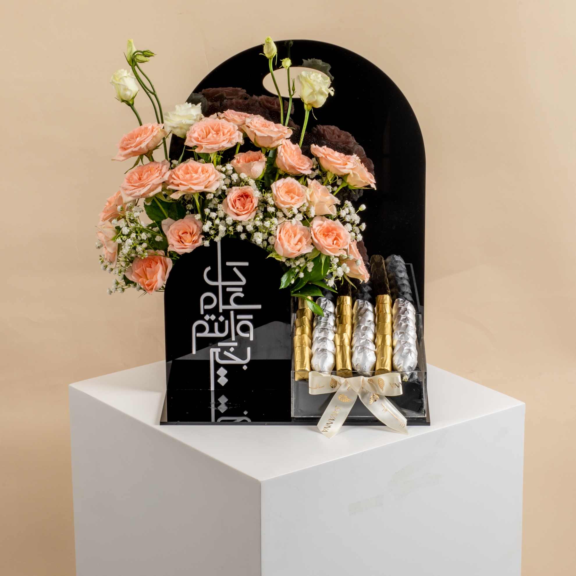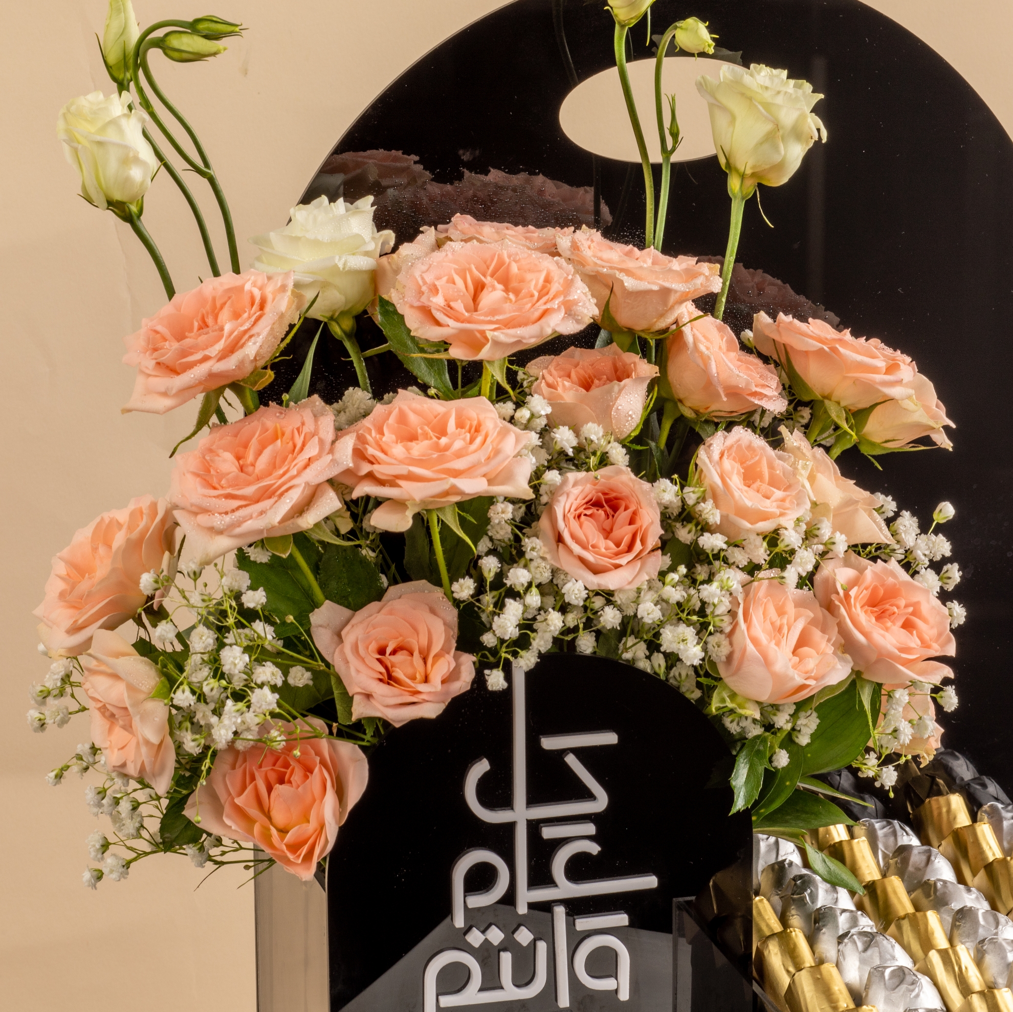 Celebrate Eid with elegance—this tray includes 39 premium chocolates with pistachio, almond, and coconut fillings, paired with a delicate floral touch of baby roses, peach gypsophila, and white eustoma. A perfect gift for sweet moments and warm wishes.