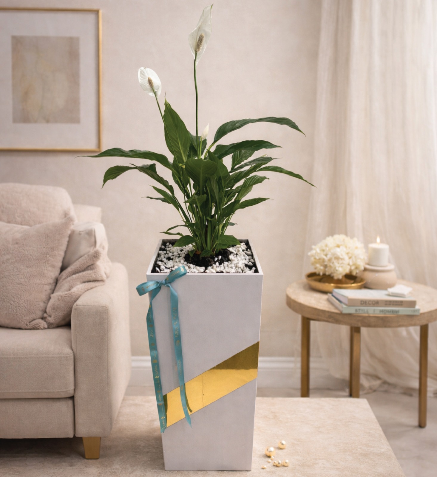 Peace Lily in Premium MDF Designer PotAdd a touch of elegance and freshness to any interior with this beautiful Peace Lily (Spathiphyllum), thoughtfully placed in a premium MDF designer pot. Known for its graceful white blooms and lush green foliage, the Peace Lily is a timeless indoor plant that enhances both modern and classic décor.The sturdy MDF pot features a sleek contemporary finish with refined detailing, making it perfect for living rooms, offices, bedrooms, or gifting occasions. Easy to maintain and visually soothing, this plant brings natural charm while improving indoor ambience.Key Features:Plant Type: Peace Lily (Spathiphyllum)Pot Material: High-quality MDF (Premium Finish)Placement: Indoor (Living room, office, bedroom, reception area)Light Requirement: Low to bright indirect lightWatering: Moderate; water when topsoil feels dryAir Purifying: Helps improve indoor air qualityMaintenance Level: EasyWhy Choose This Plant?Elegant white blooms with glossy green leavesStylish MDF pot for a premium décor lookIdeal for home décor, corporate spaces, and giftingLow maintenance and beginner-friendly
