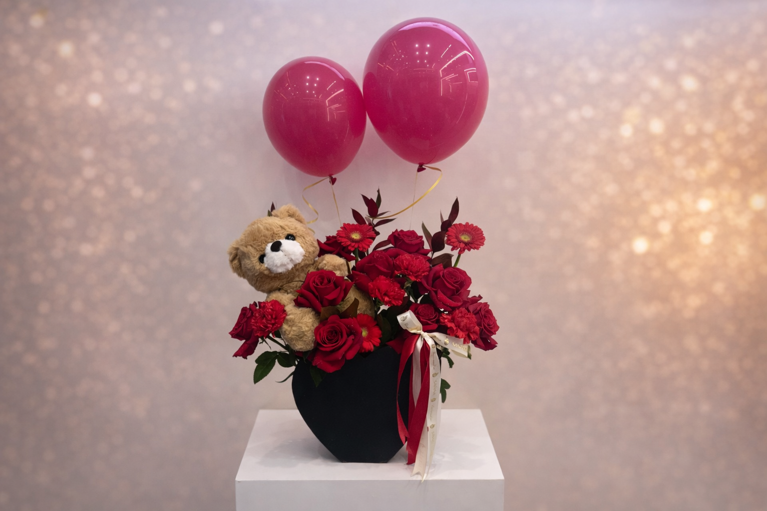 Red Flowers Box | Teddy Bear | Balloons