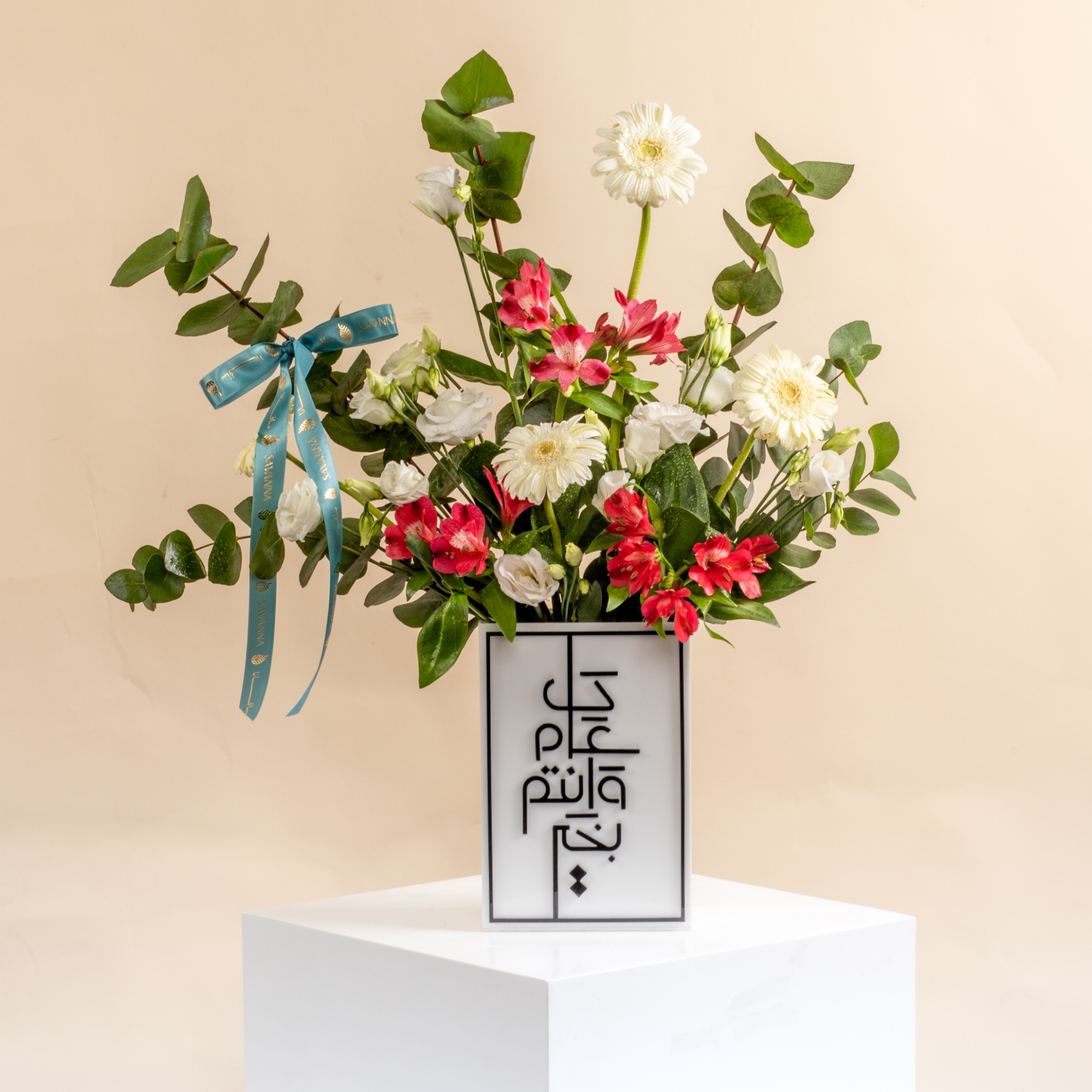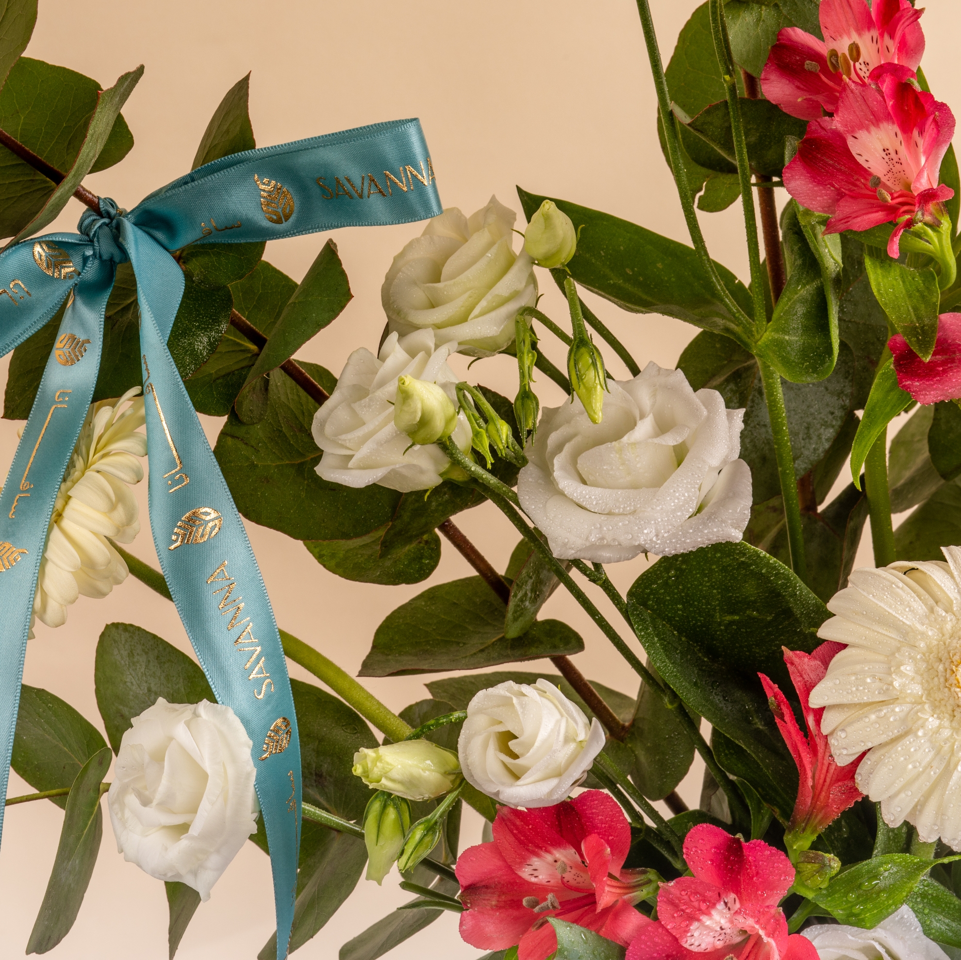 Celebrate Eid with the Savanna Flowers Box—featuring fresh white gerbera, elegant white eustoma, vibrant red alstroemeria, and lush ruscus. A perfect gift to brighten the festive season with beauty and grace. Order now for a heartfelt celebration!