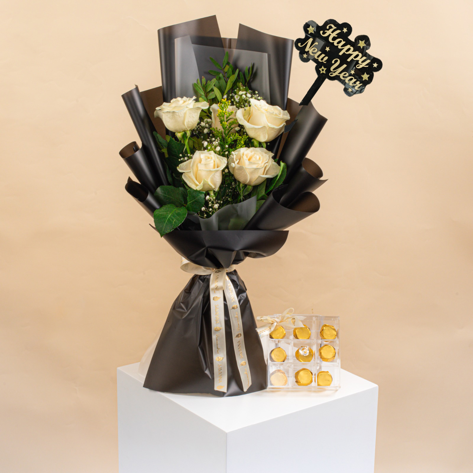 Indulge in elegance with our White Roses Hand Bouquet paired with 9 premium chocolates and our exclusive Coffee Kindry Biscuit. Delight in the delicate blend of pink rose, white rose, eucalyptus, gypso, and solidago—perfectly crafted for gifting or self-pampering. A luxurious harmony of flavor and floral beauty.