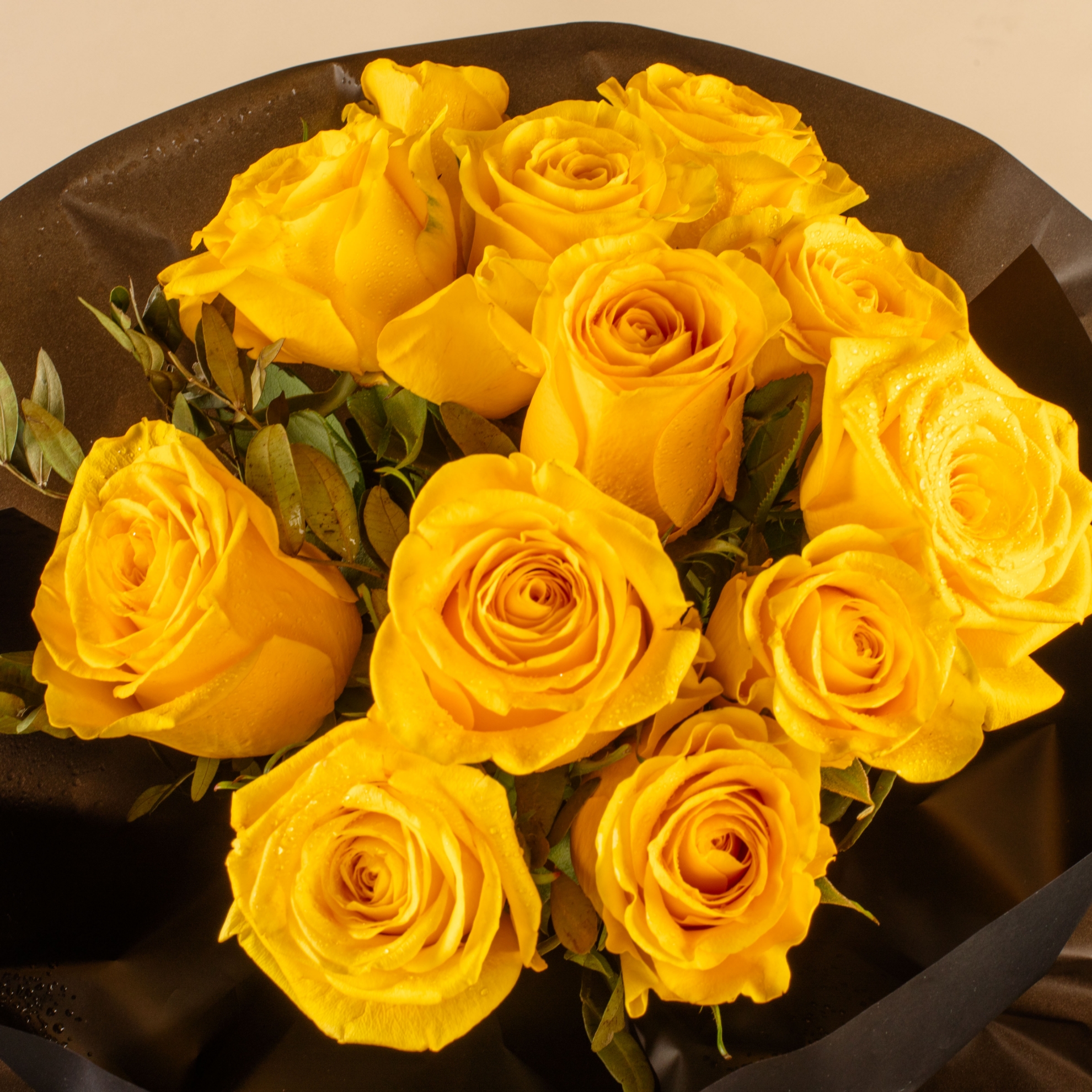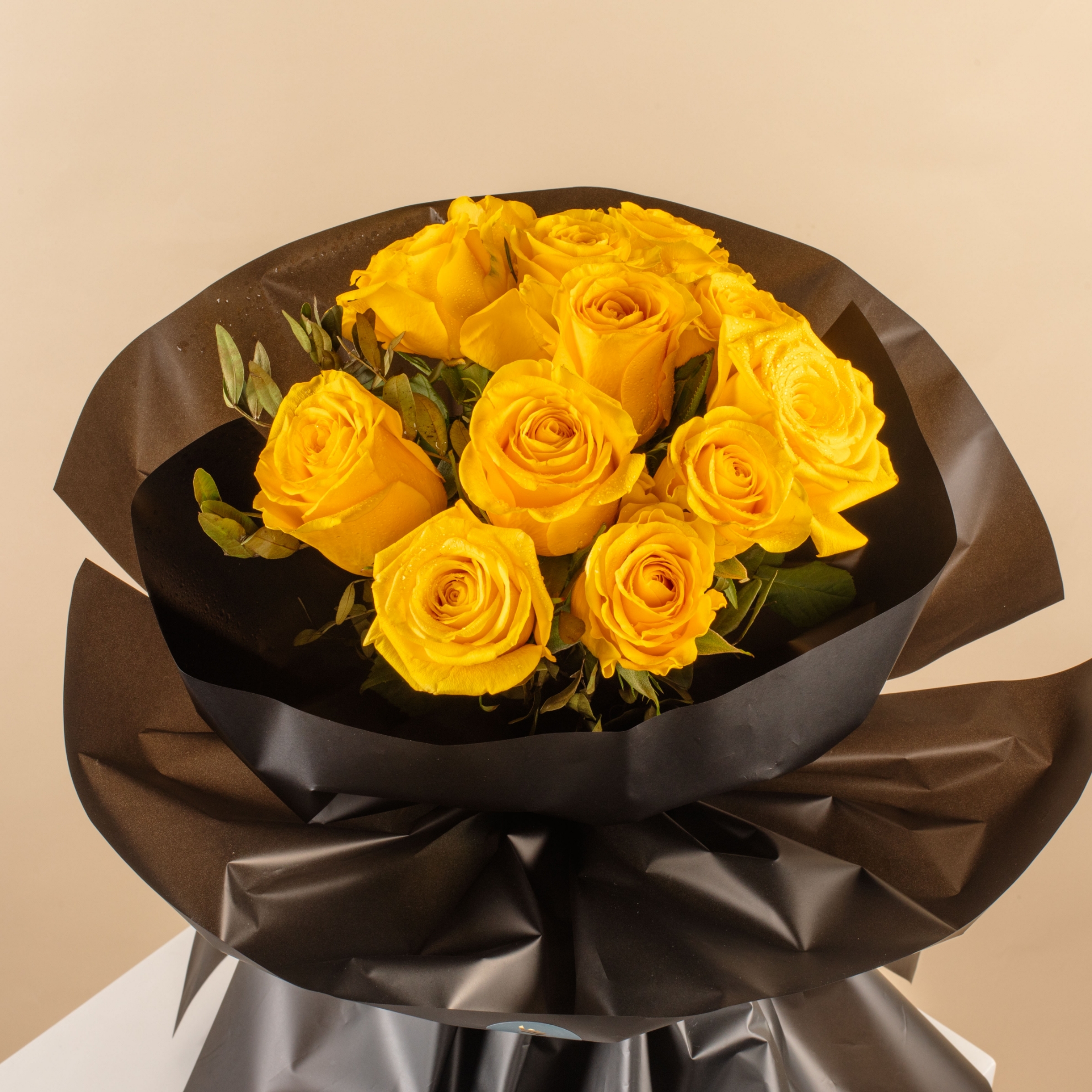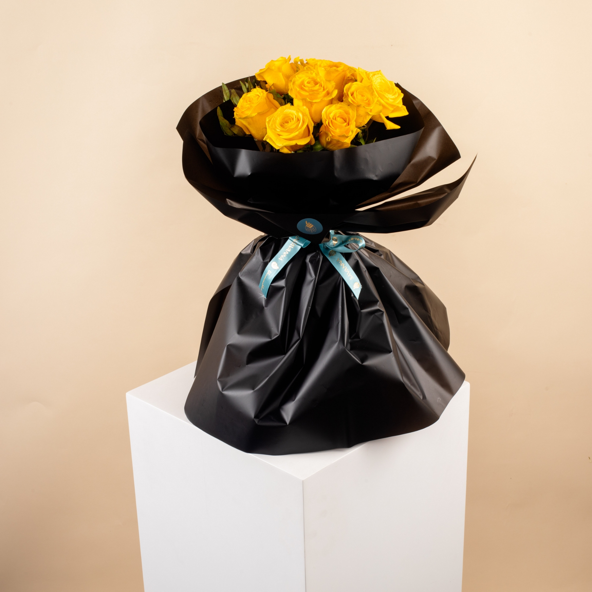 10 Yellow Roses Hand BouquetBright and joyful — a bouquet of 10 yellow roses wrapped in sleek black. The perfect way to share happiness and warm wishes.