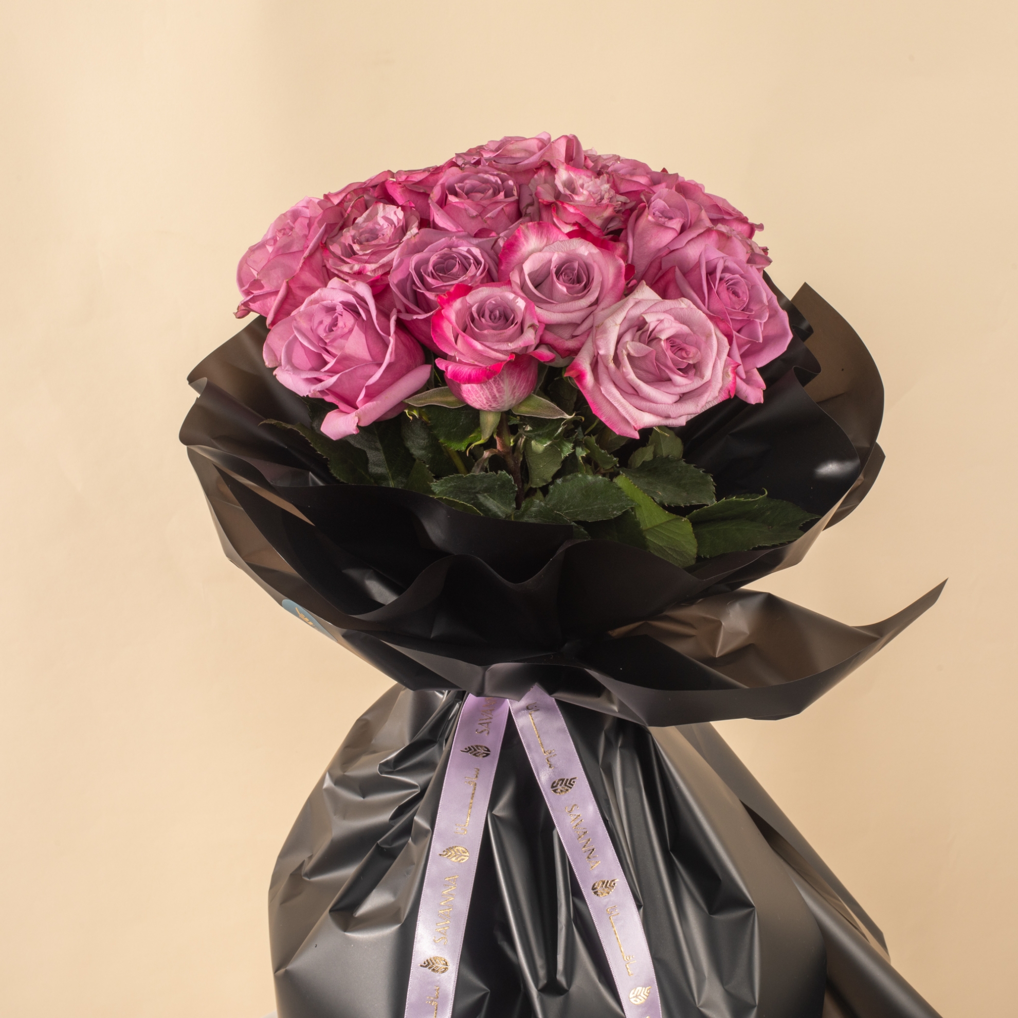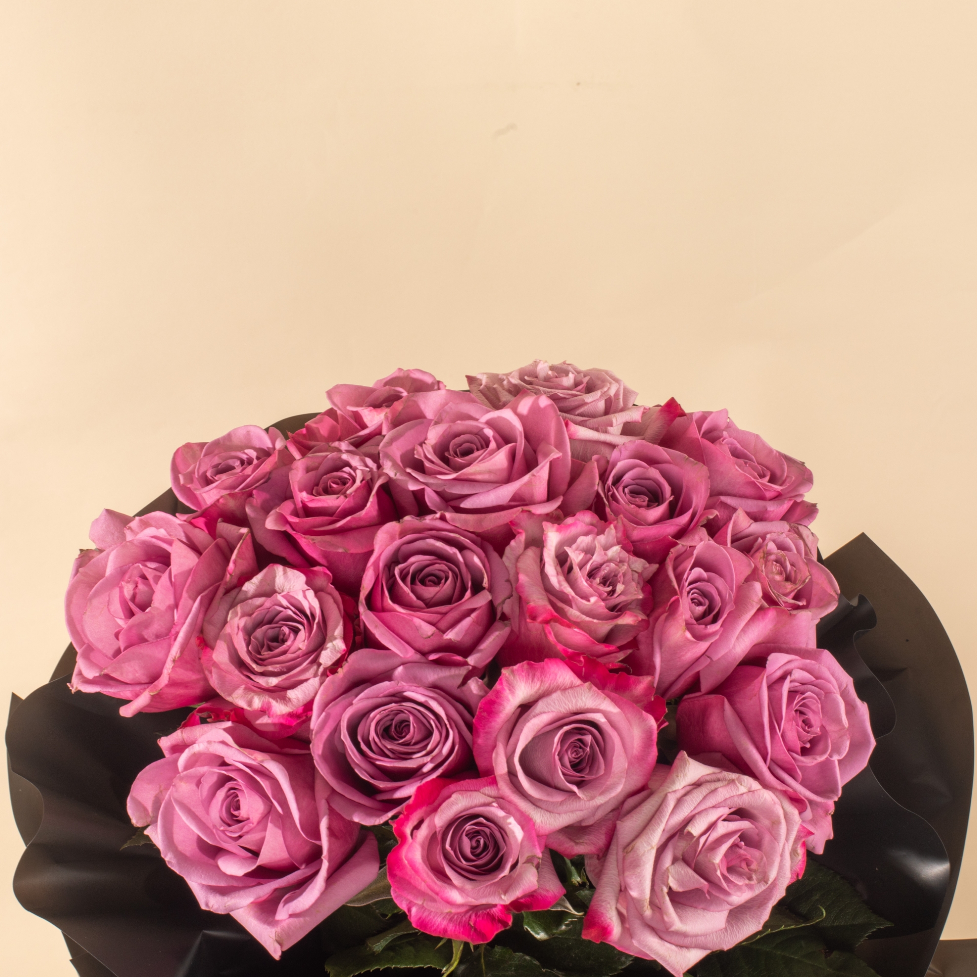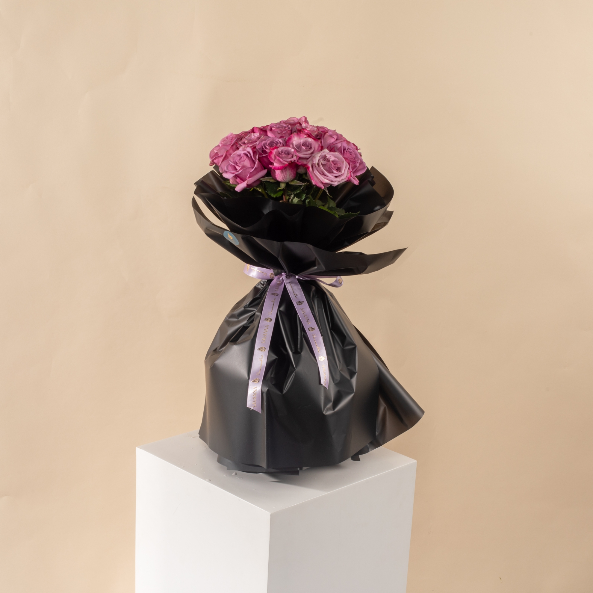20 Purple Roses with Black WrappingA luxurious bouquet of 20 purple roses wrapped in elegant black — bold, romantic, and perfect for making a lasting impression.