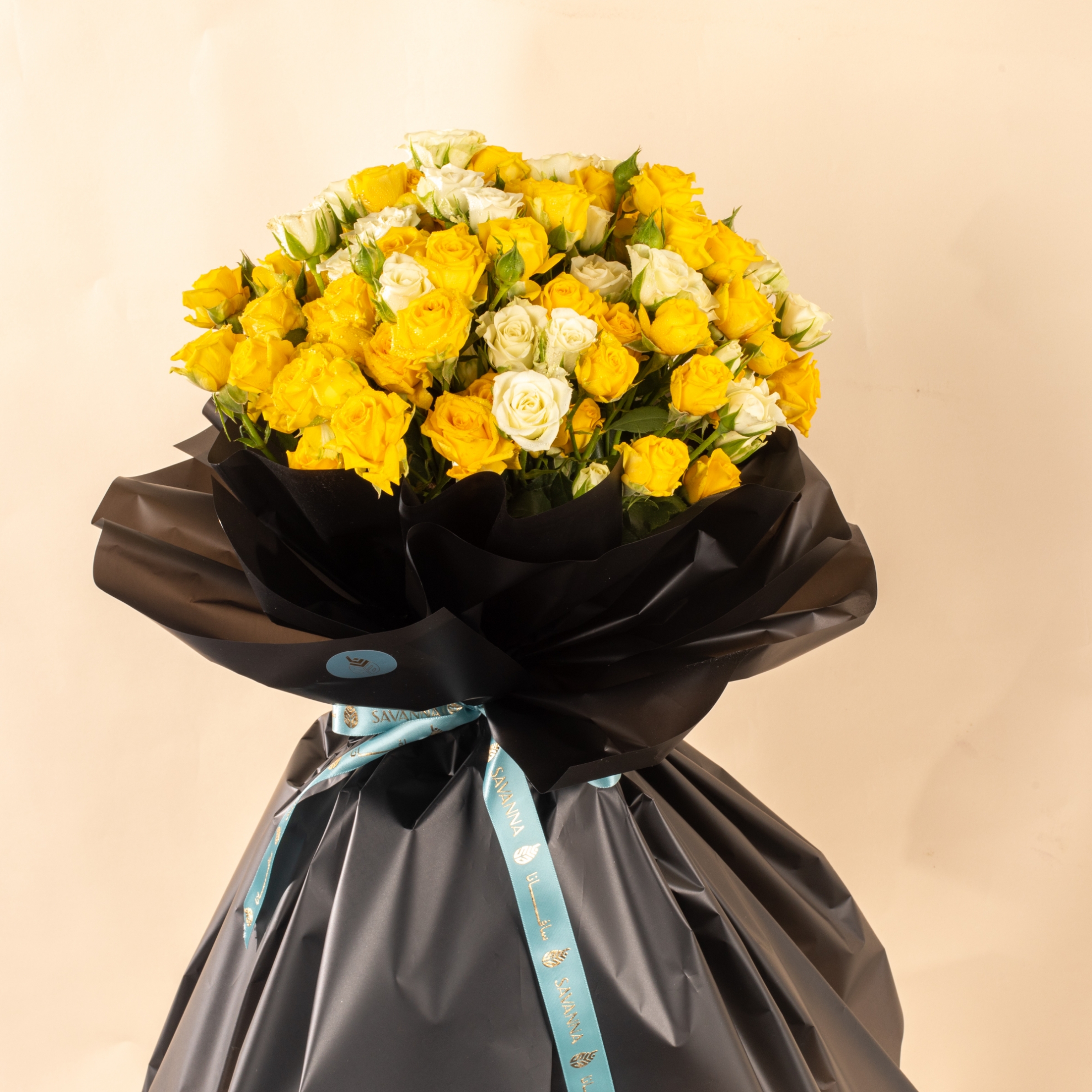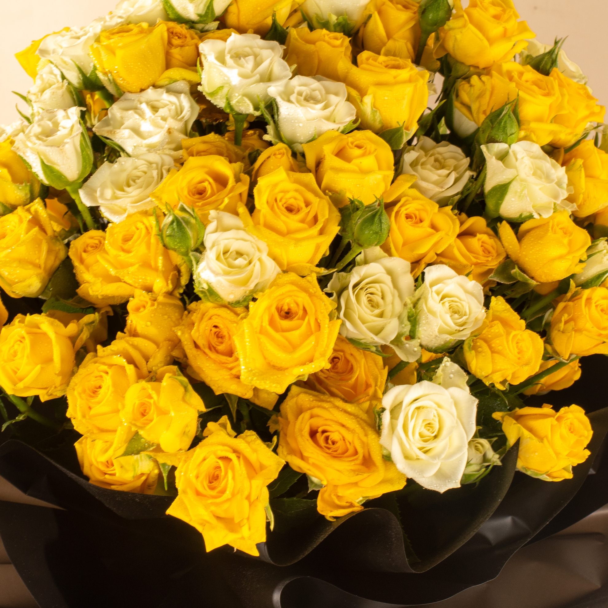 Baby Rose White & Yellow Hand BouquetA fresh and cheerful bouquet featuring white and yellow baby roses, elegantly wrapped in black. Perfect for brightening someone’s day with style.
