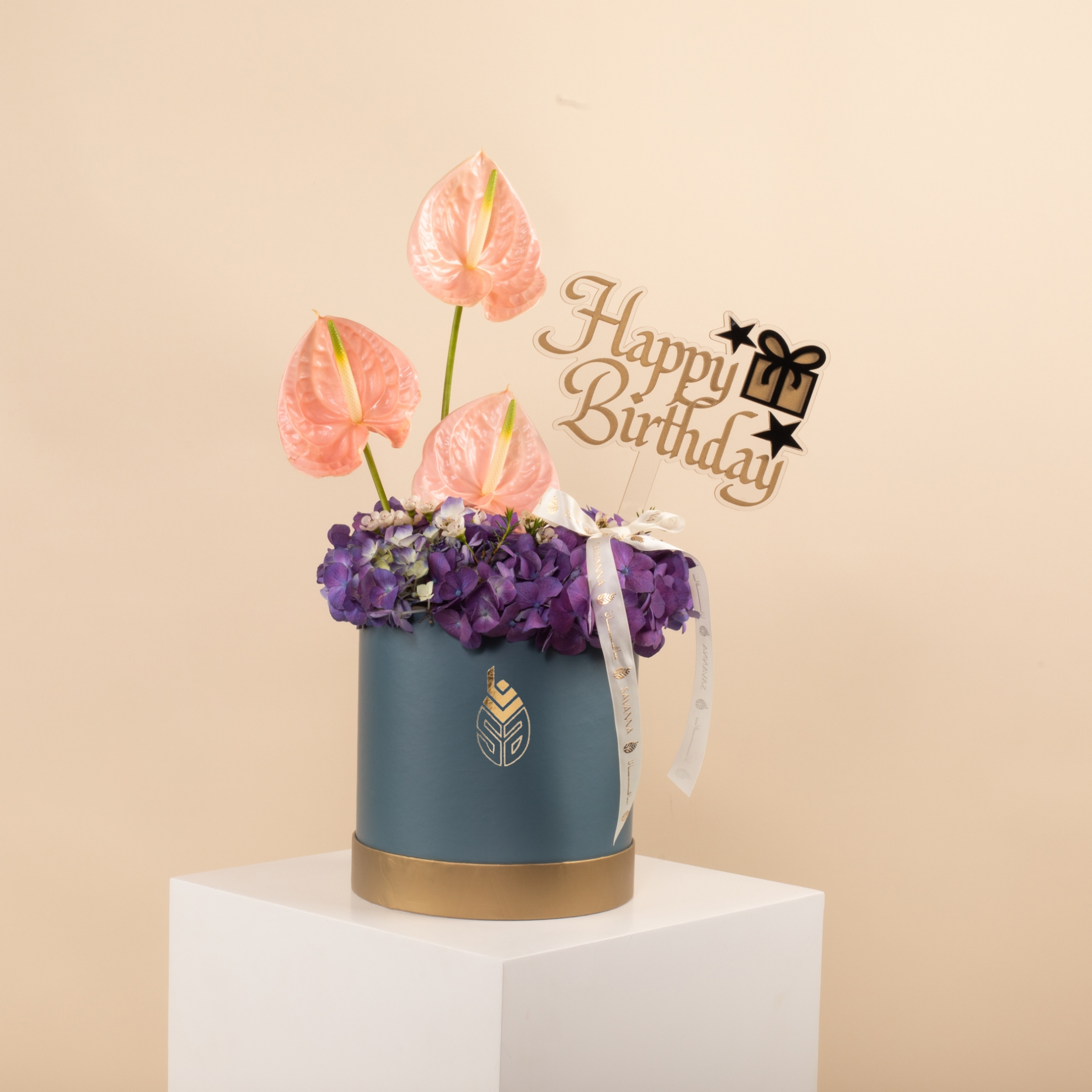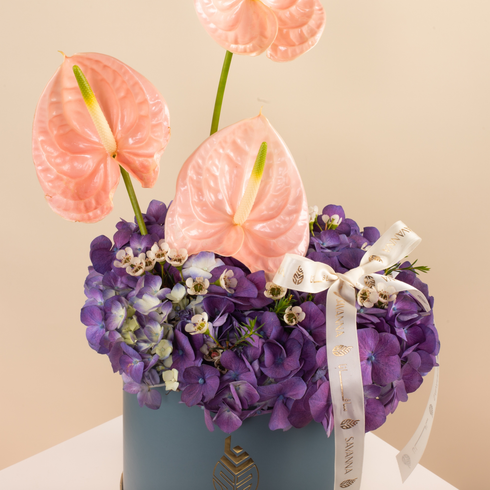 Savanna Birthday Flowers Box featuring a stunning combination of Pink Anthuriums and Purple Hydrangeas – an elegant and colorful arrangement perfect for celebrating birthdays with a touch of luxury and charm. Order now on Savanna and make their special day truly unforgettable!