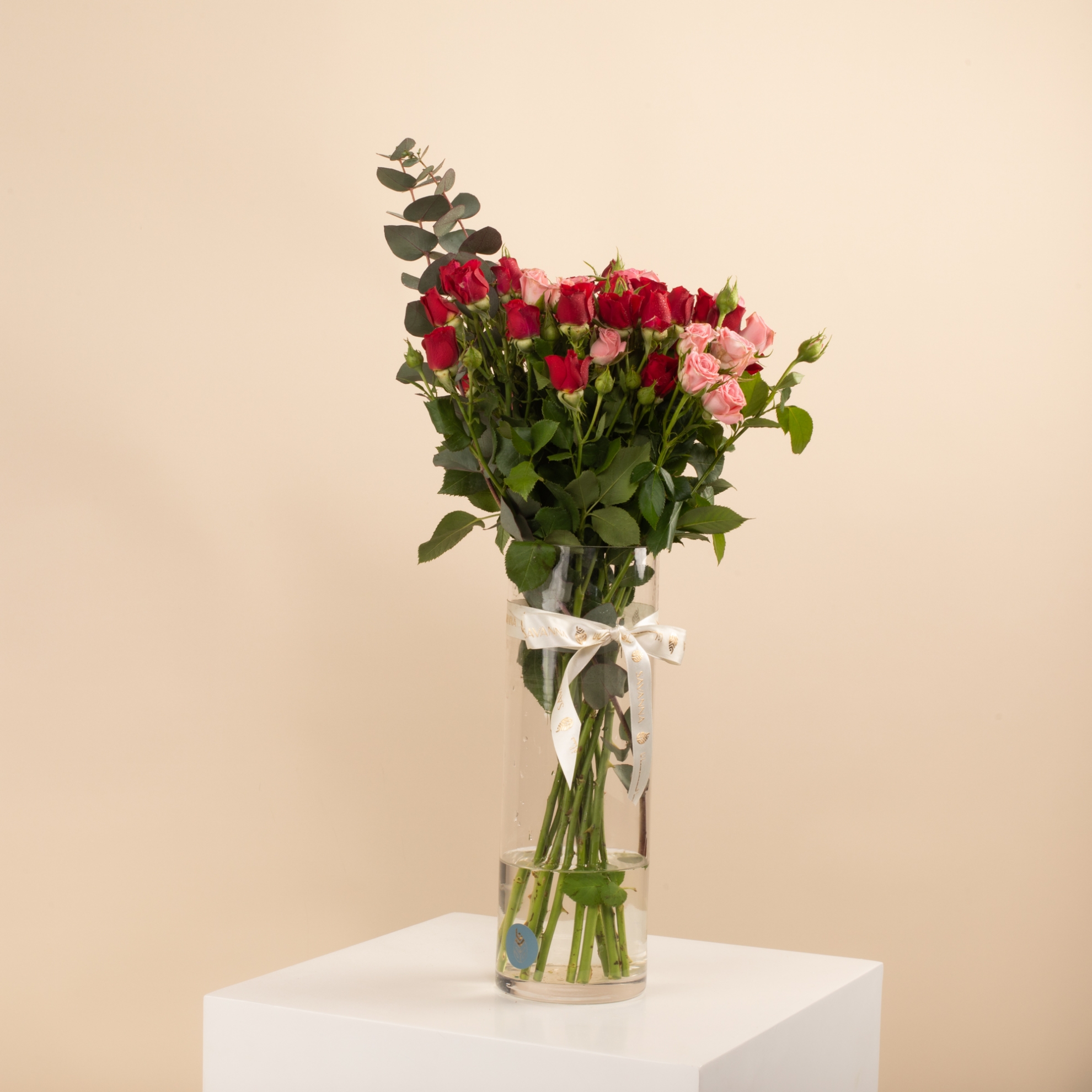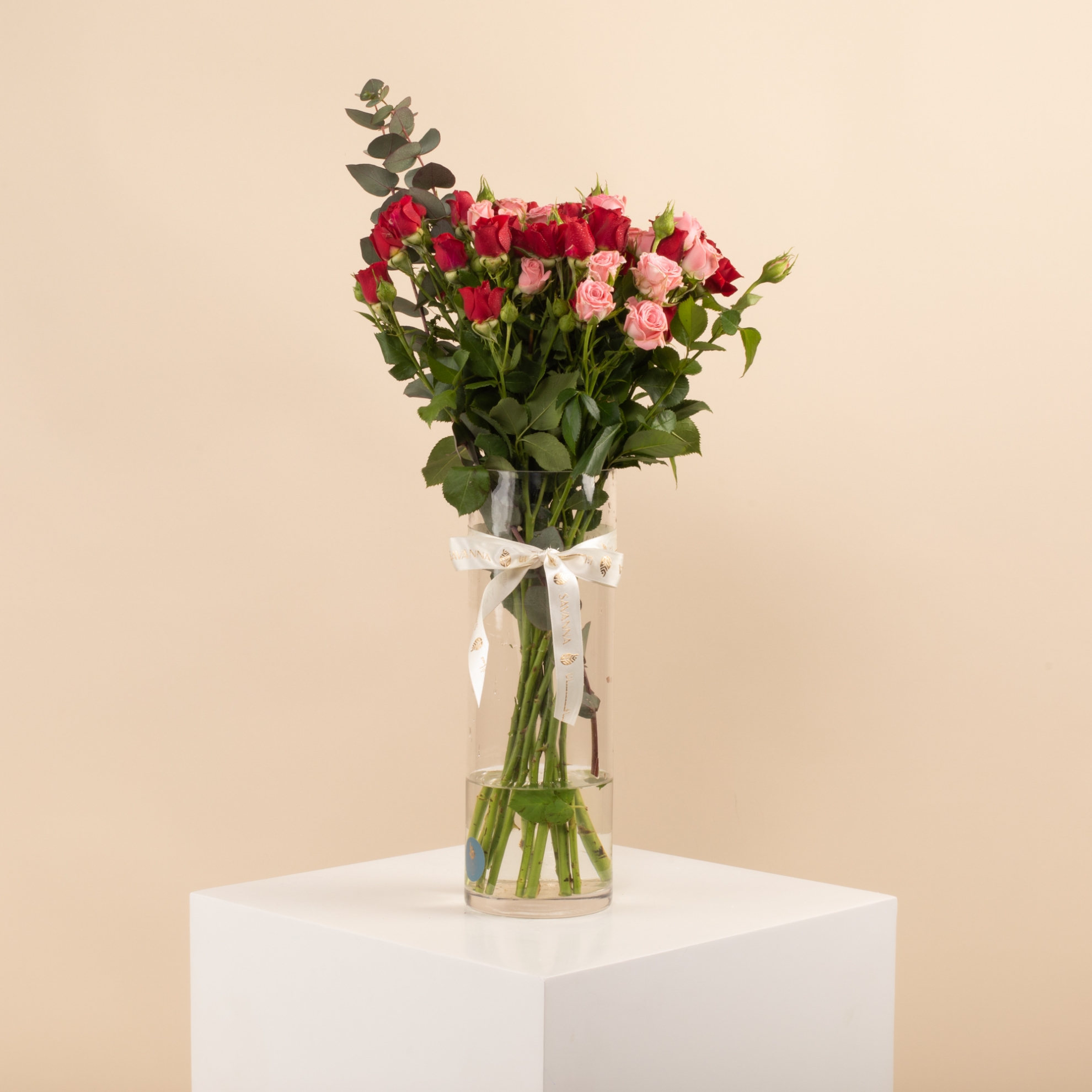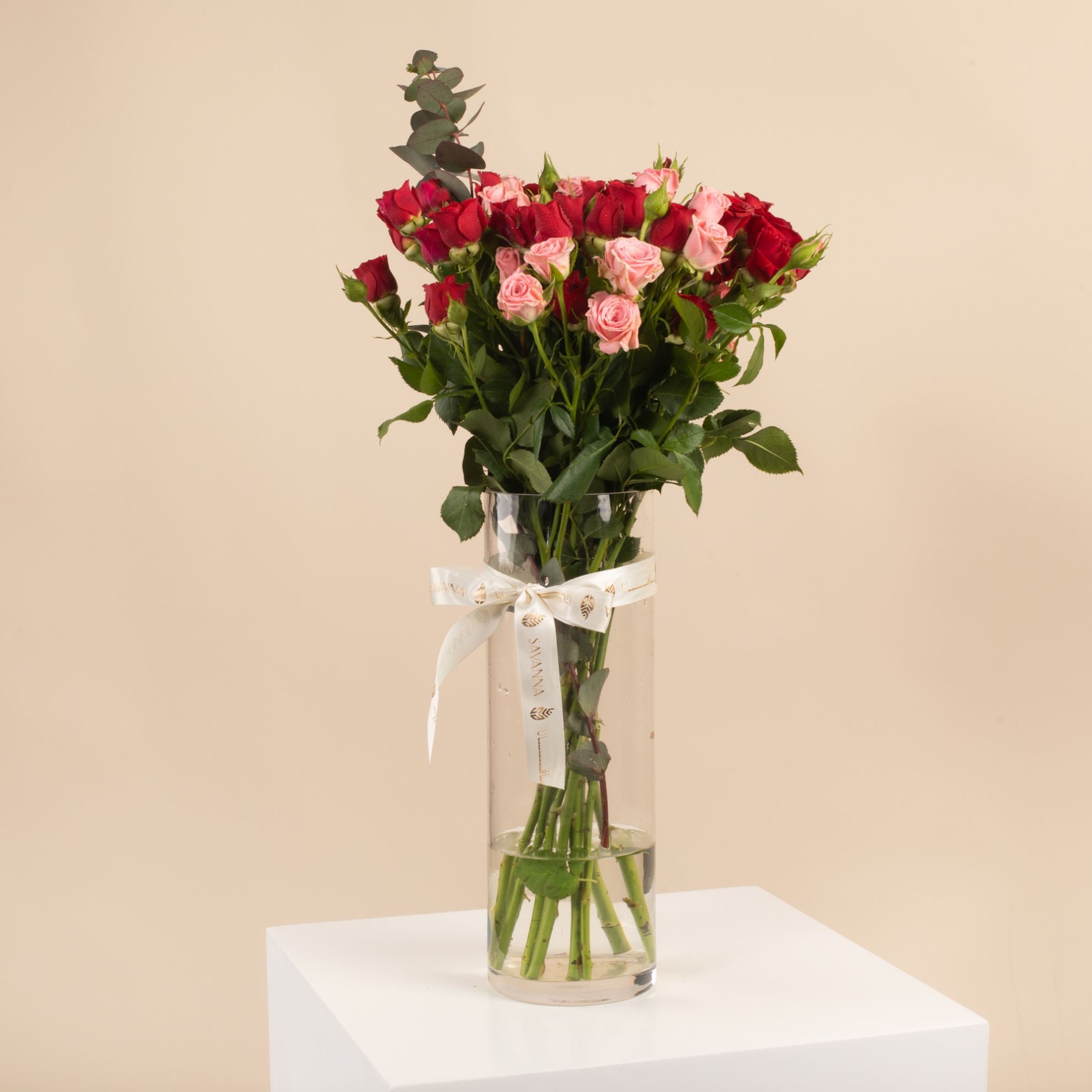 Celebrate graduation with our Glass Vase featuring Red Baby Roses, Pink Baby Roses, and Eucalyptus! This elegant arrangement symbolizes love, admiration, and new beginnings. A perfect gift to make their special day even more memorable. Order now and add beauty and grace to their graduation celebration!