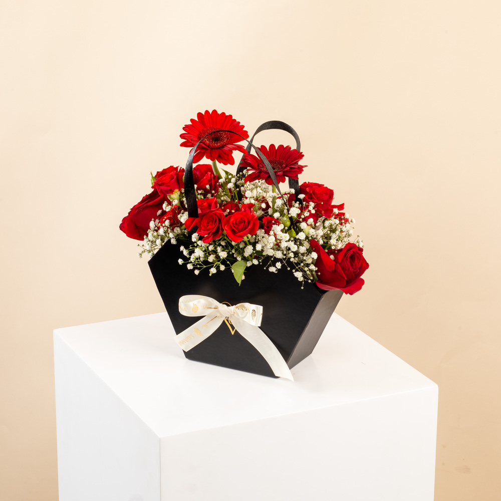 The Black Flowers Bag features a stunning arrangement of red roses, baby red roses, red gerbera, and delicate gypsophila. A bold and elegant gift perfect for any occasion. Order now and express your feelings with timeless beauty!"