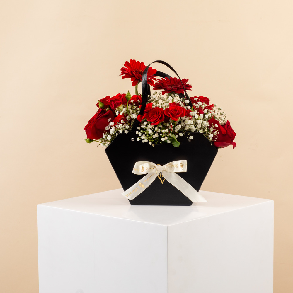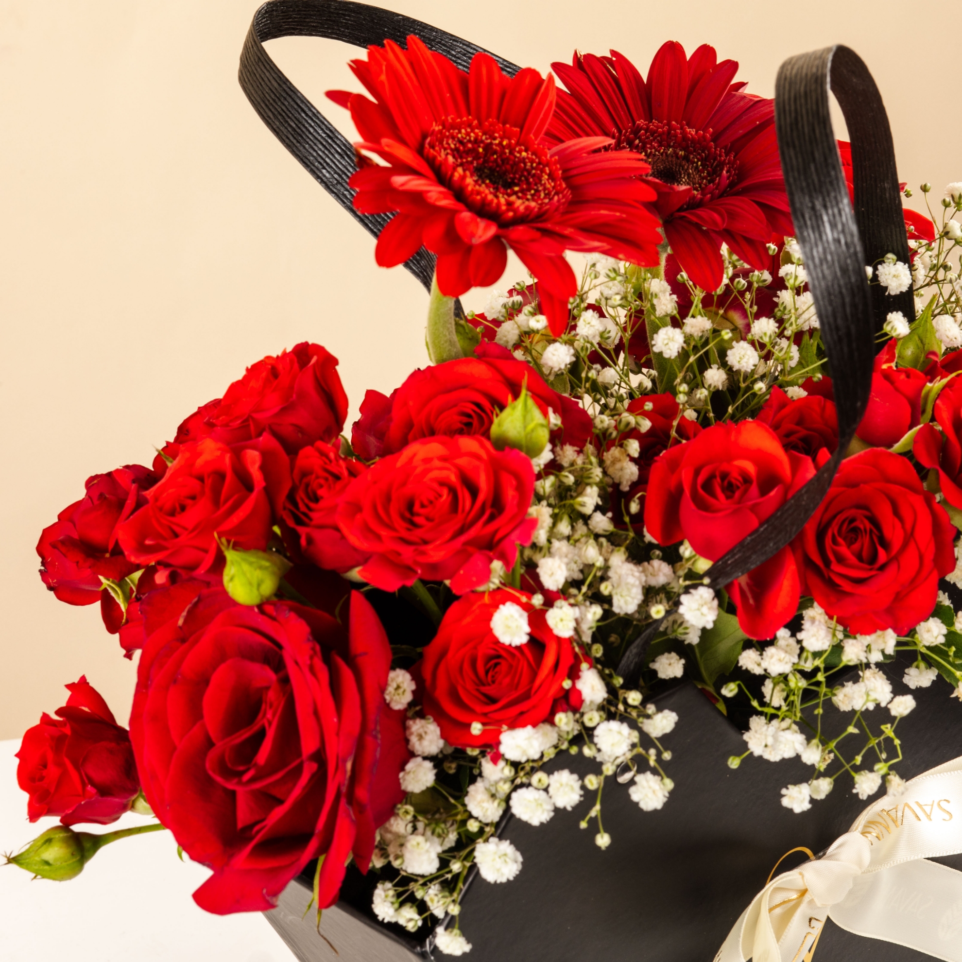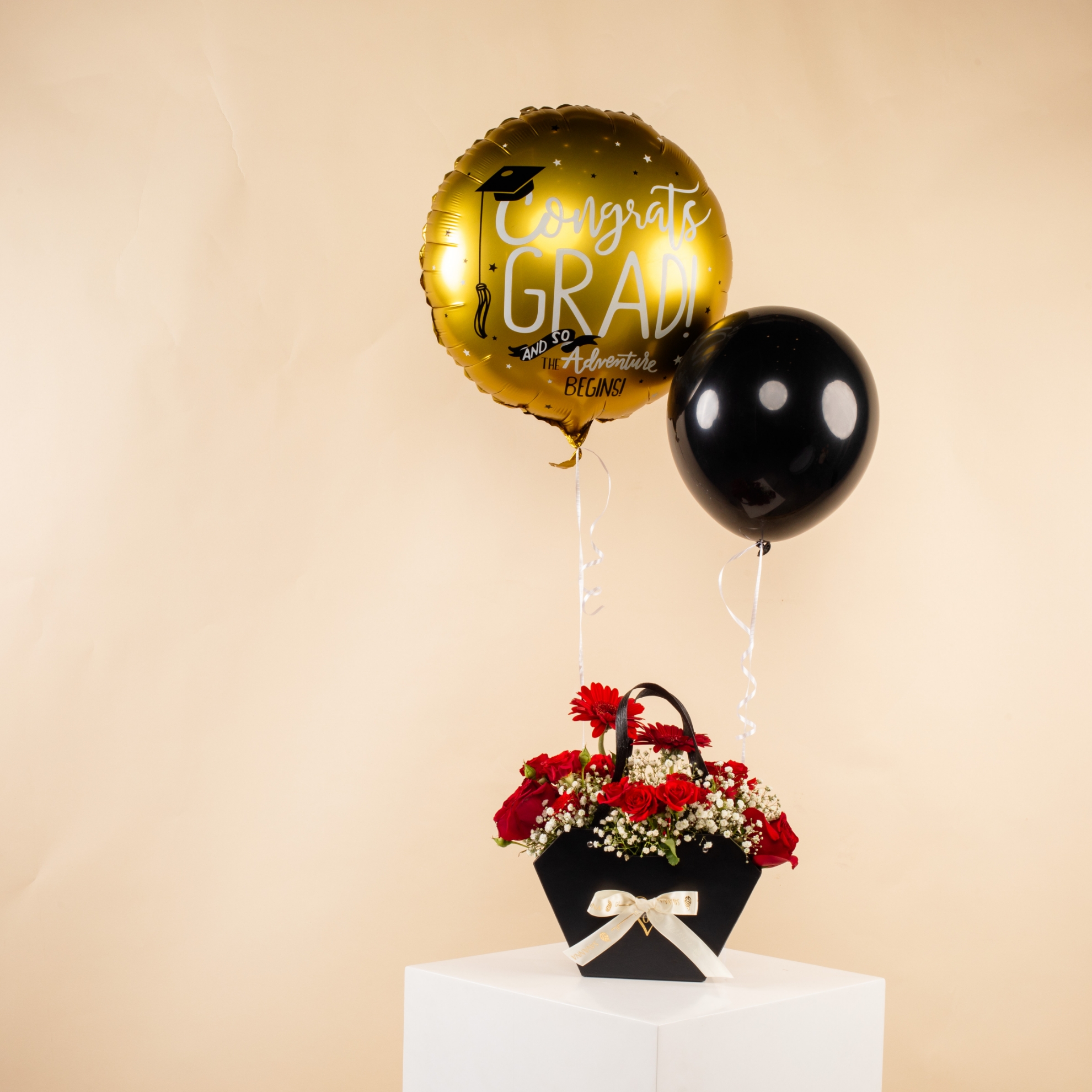 The Black Flowers Bag with Graduation BalloonA striking arrangement of red roses, baby red roses, red gerbera, and delicate gypsophila — bold, elegant, and perfect for any occasion. Order now to express your feelings with timeless beauty!