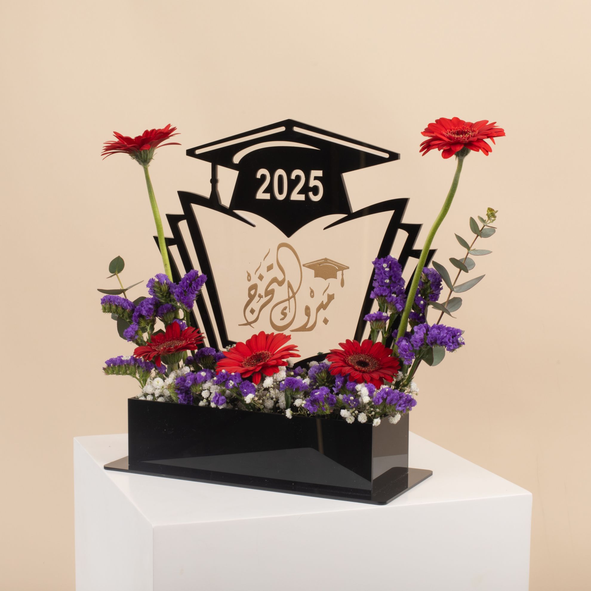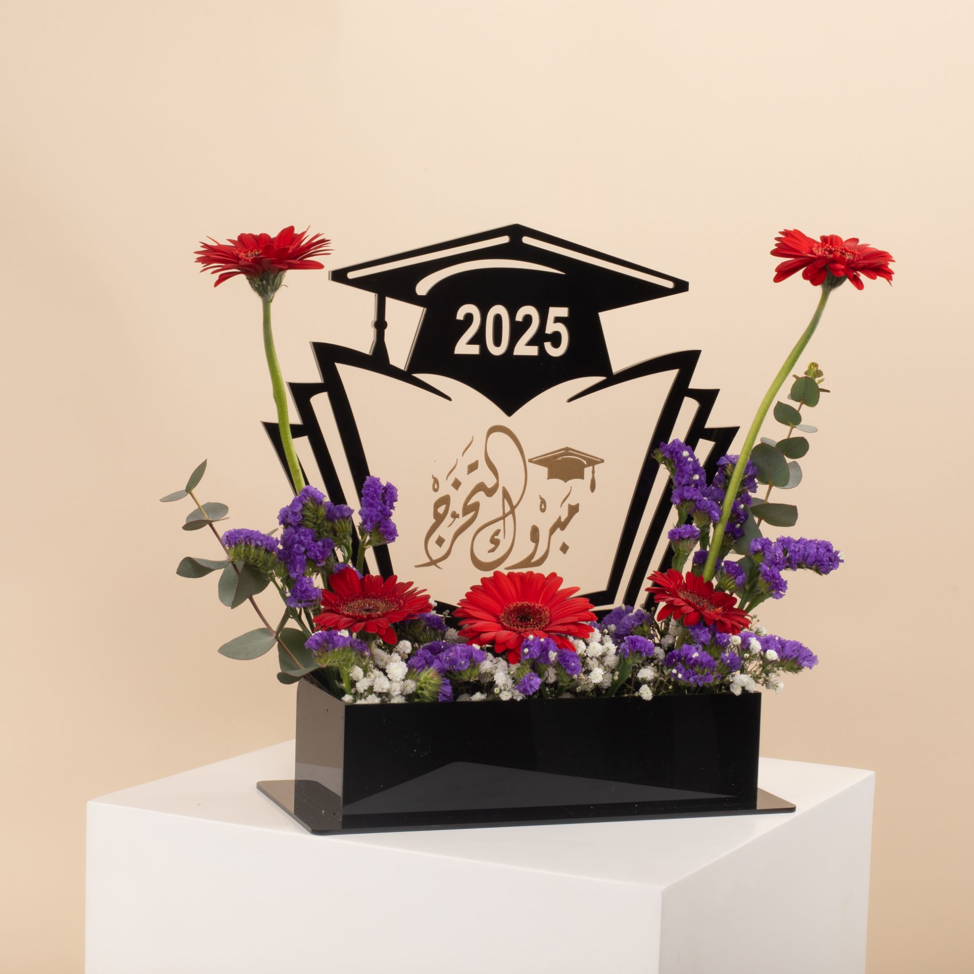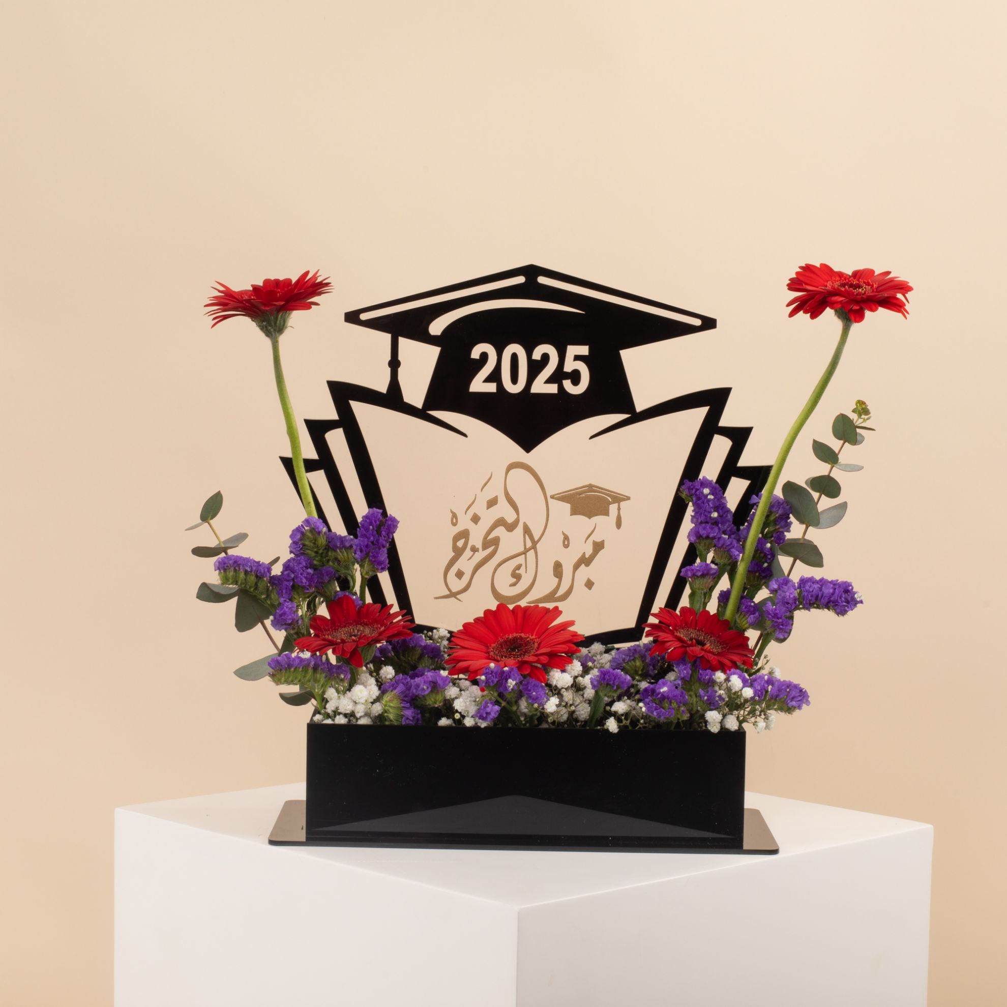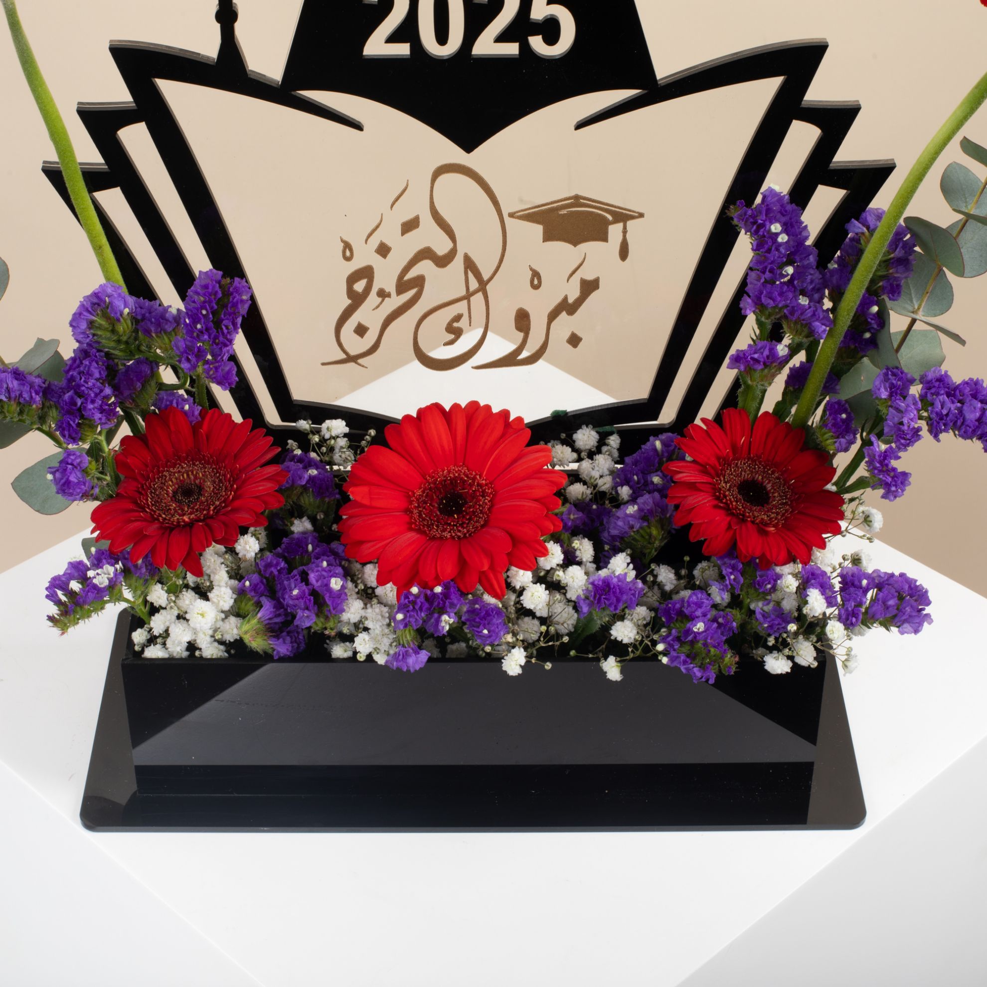 Celebrate graduation with our Graduation Flower Box! This beautiful arrangement includes 5 Red Gerberas, 2 Blue Statice, and 1 White Gypsophila. A vibrant and elegant gift to mark this special occasion. Order now and make their graduation day even more memorable with this stunning floral gift!