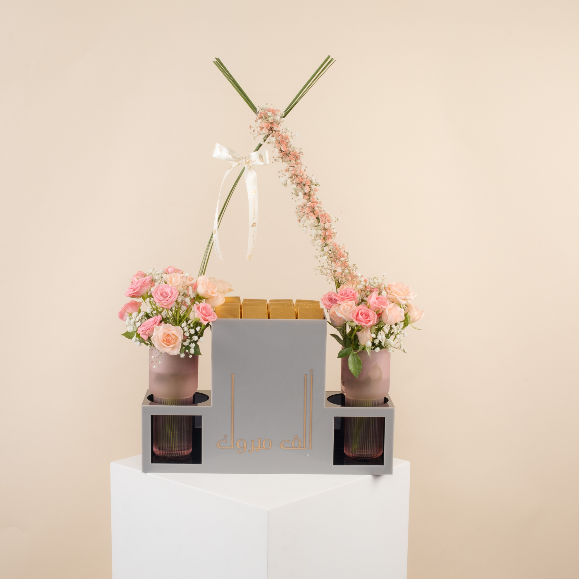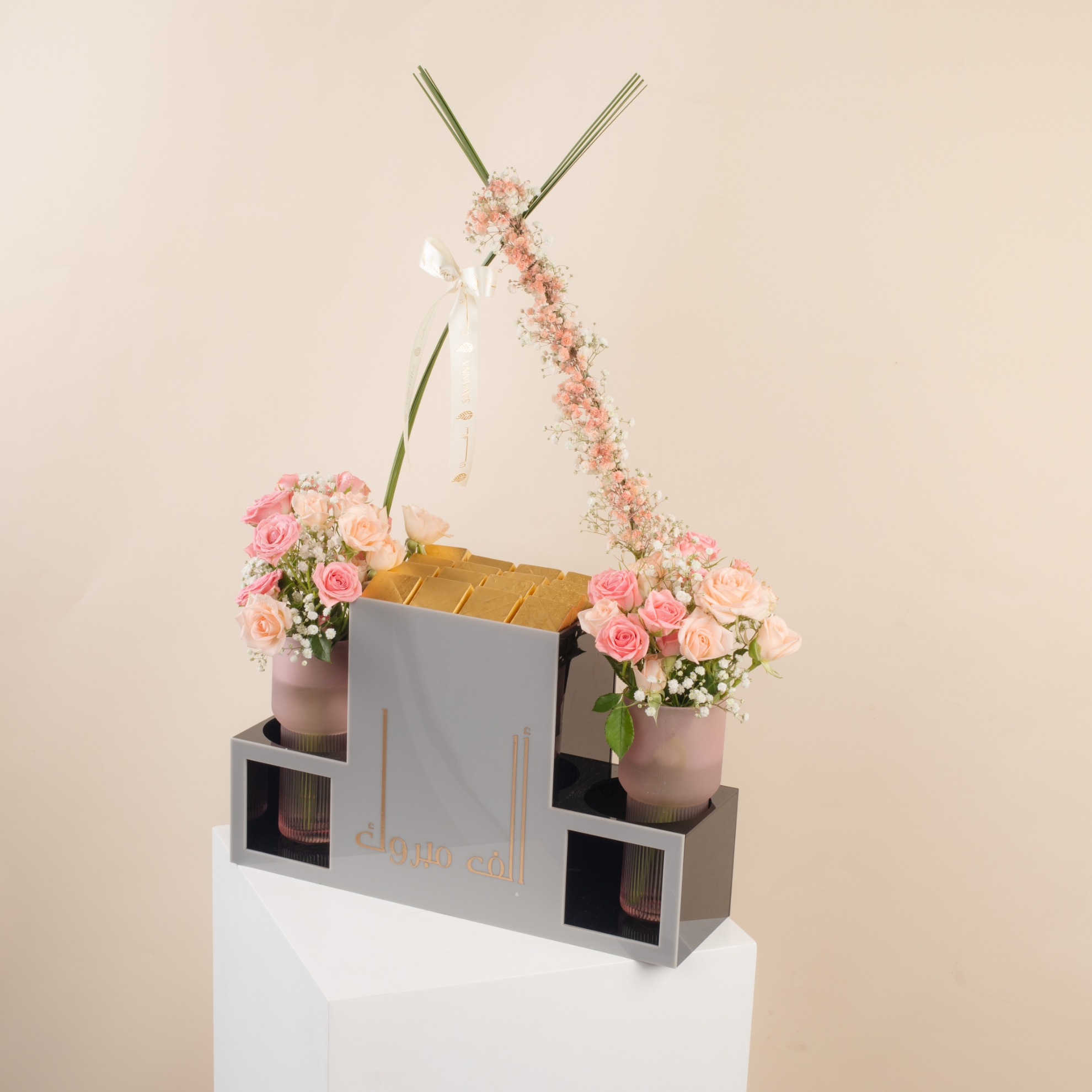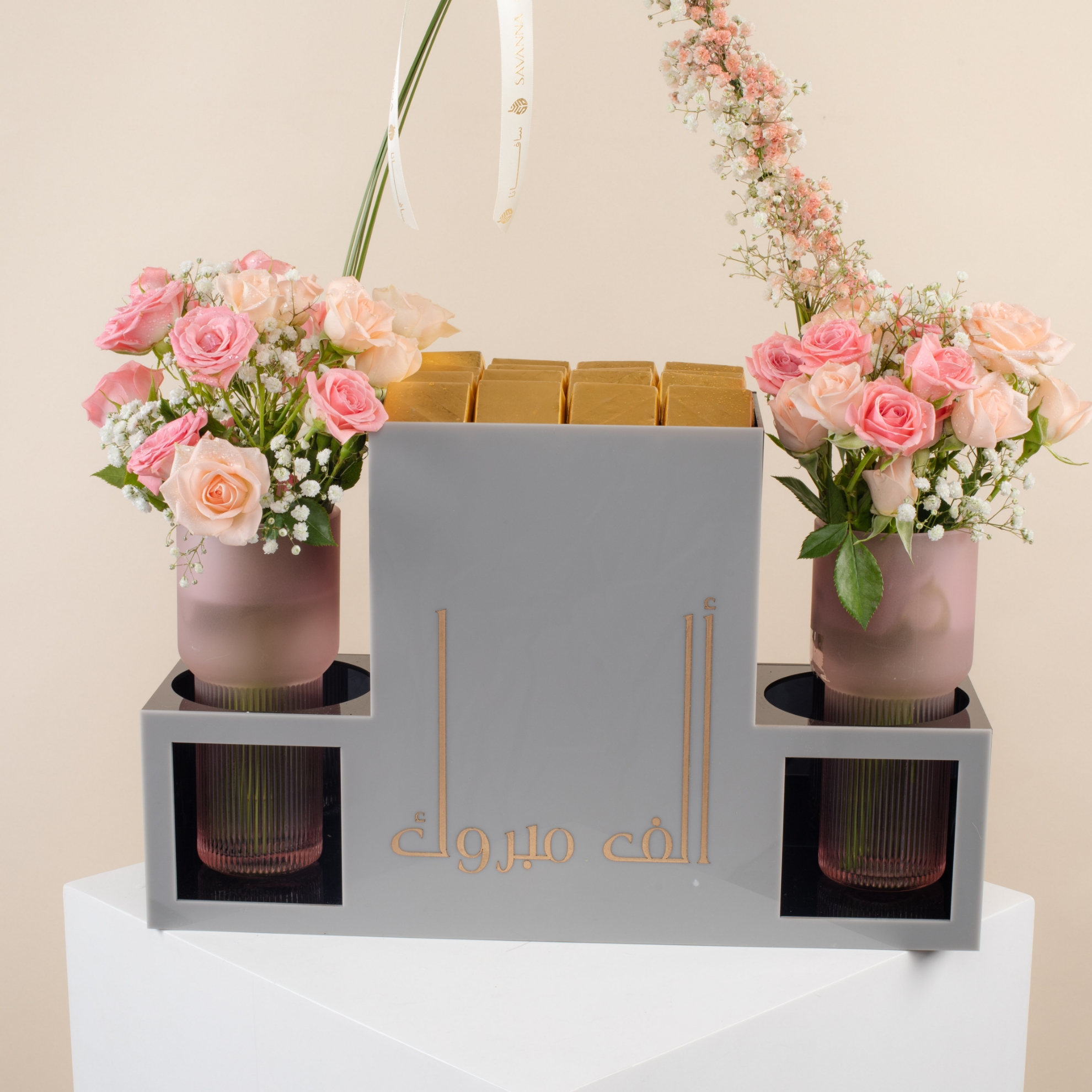 Celebrate with the Savanna Flowers Box—16 pieces of milk chocolate with mixed nuts, paired with baby peach and pink roses plus gypsophila, beautifully arranged in two elegant pink vases. The perfect gift for any special occasion!