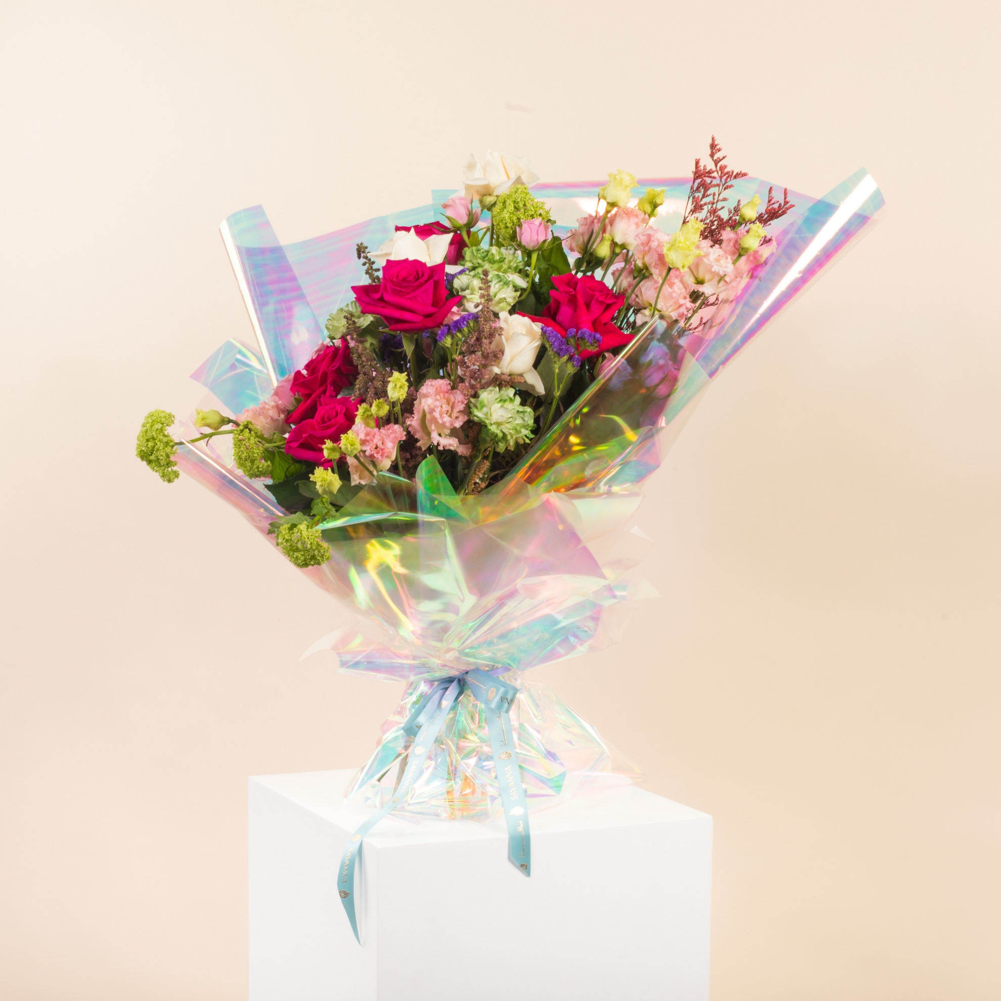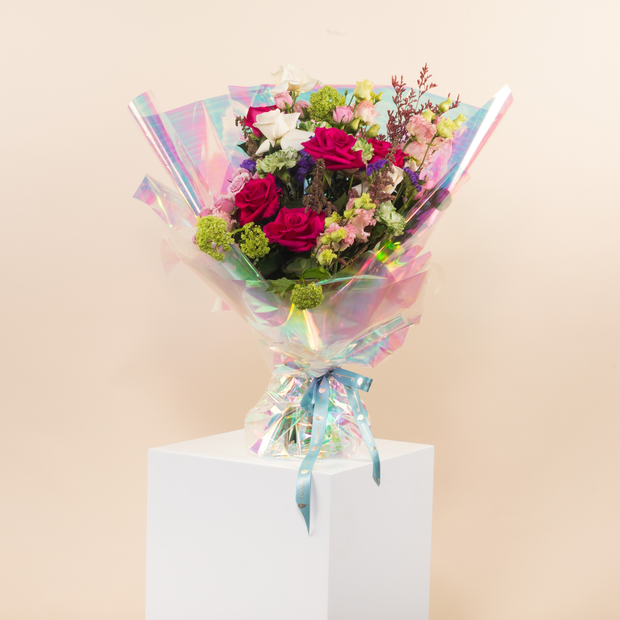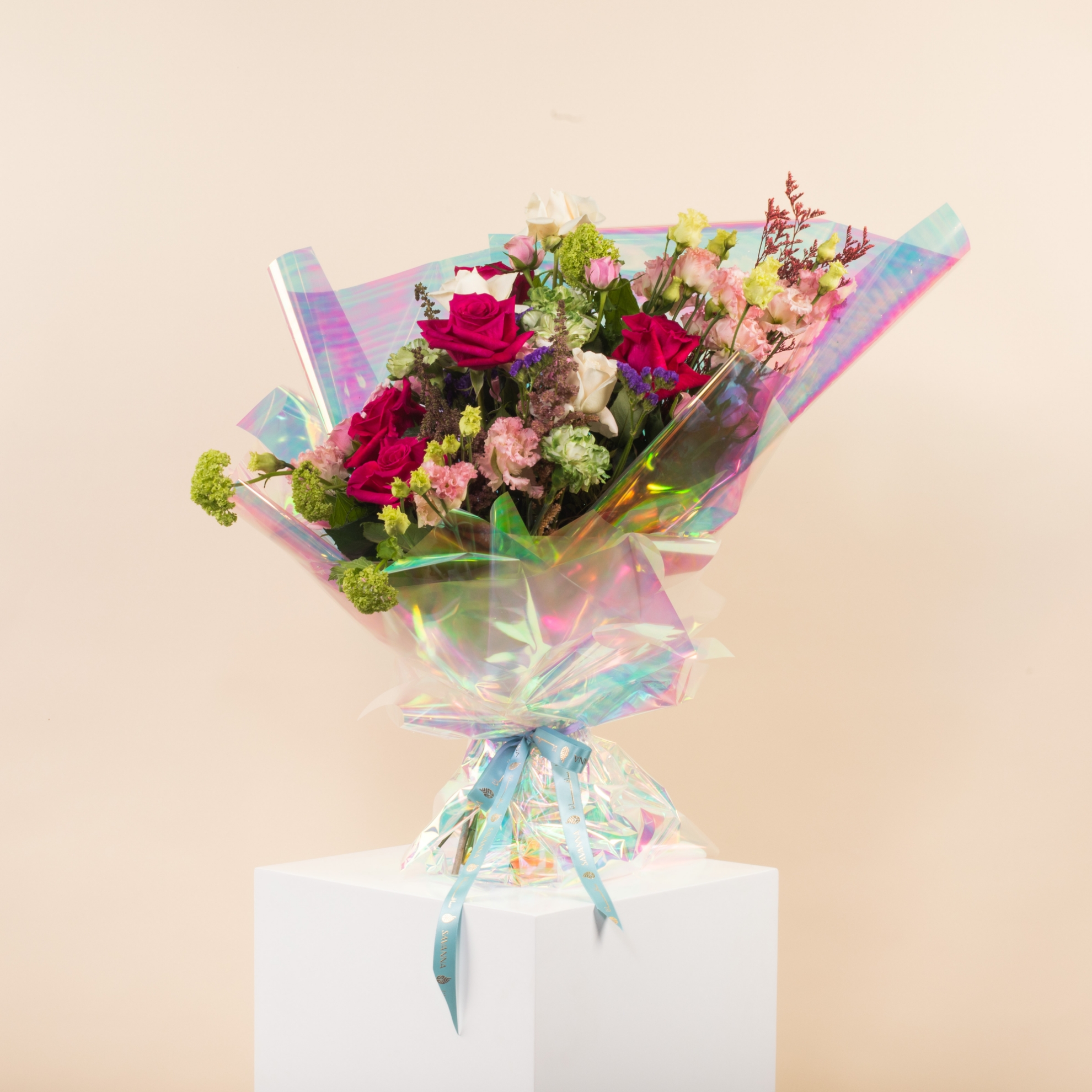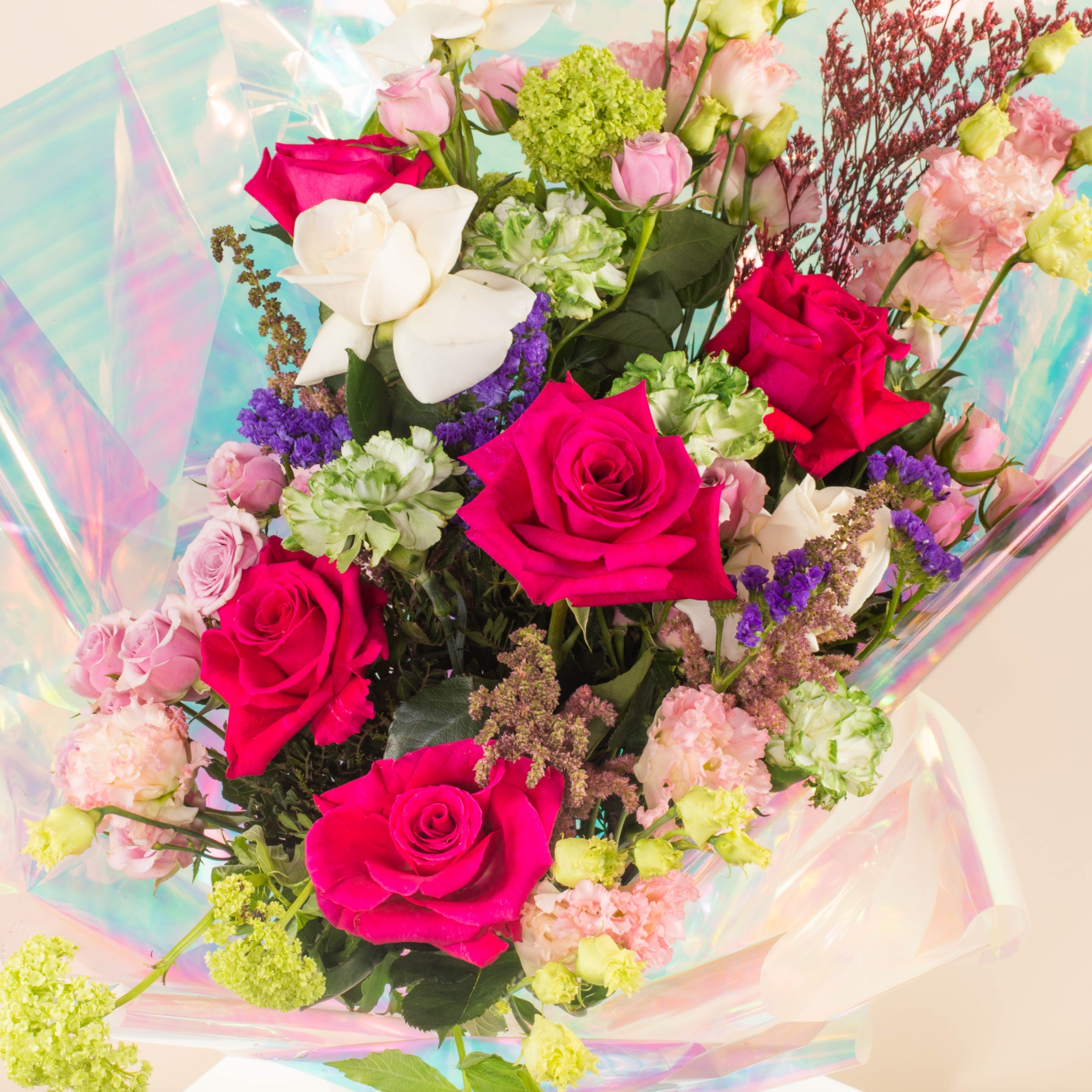 A luxurious hand bouquet featuring fuchsia roses, pink eustoma, white baby roses, purple carnations, and delicate greens. Elegantly wrapped in iridescent premium film for a dazzling finish—perfect for gifting love, light, and celebration