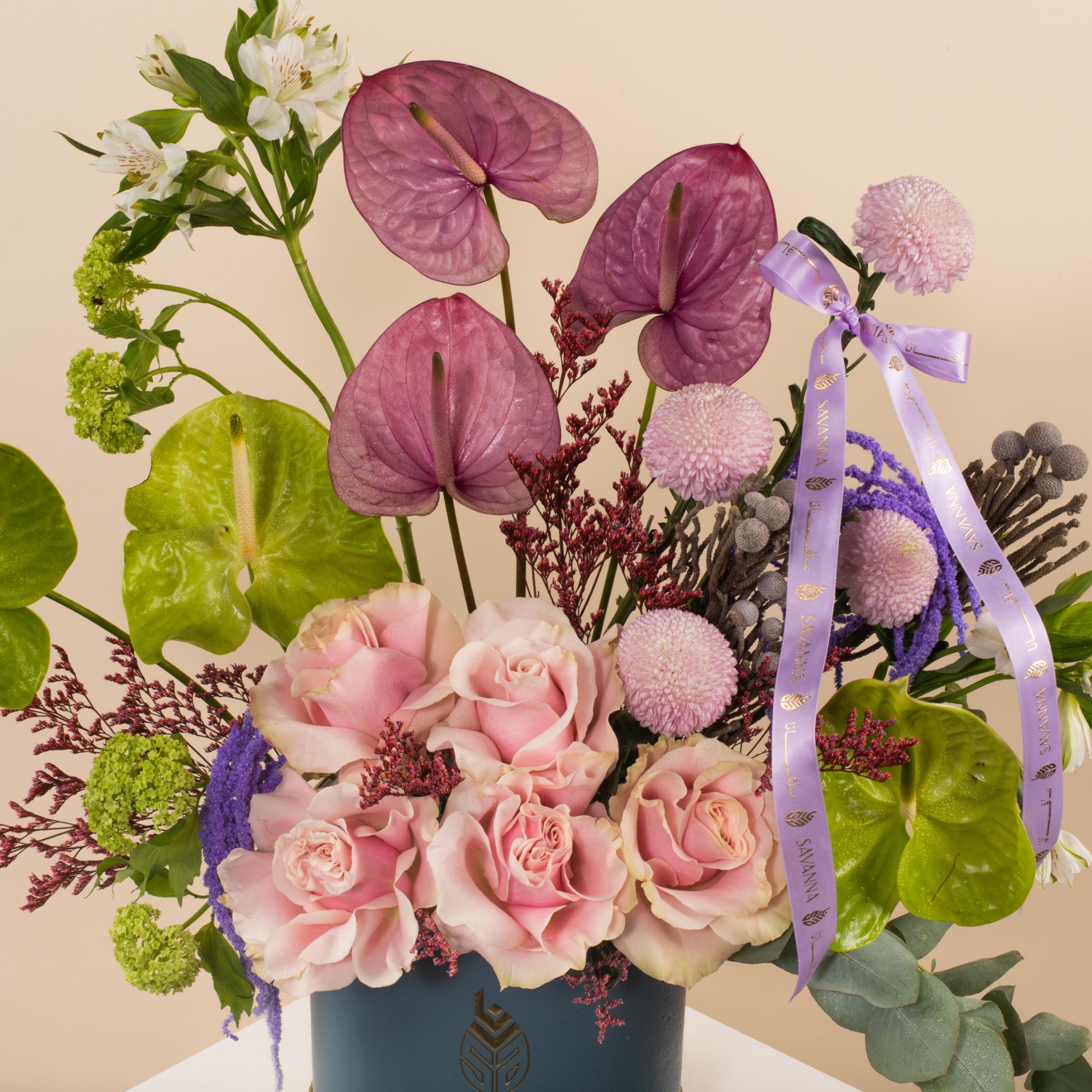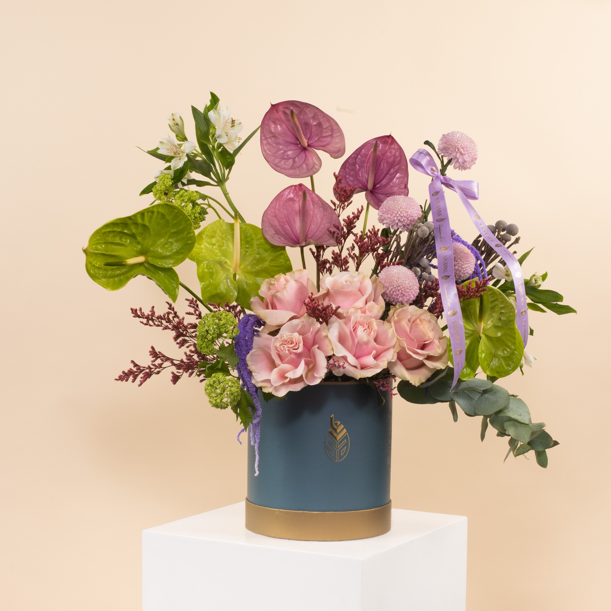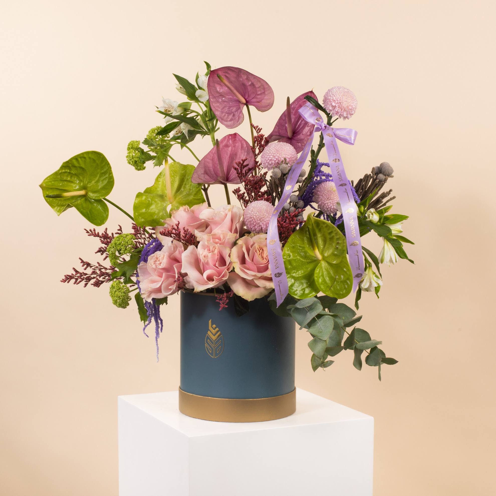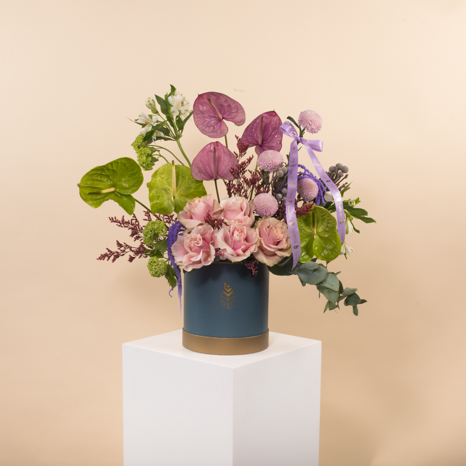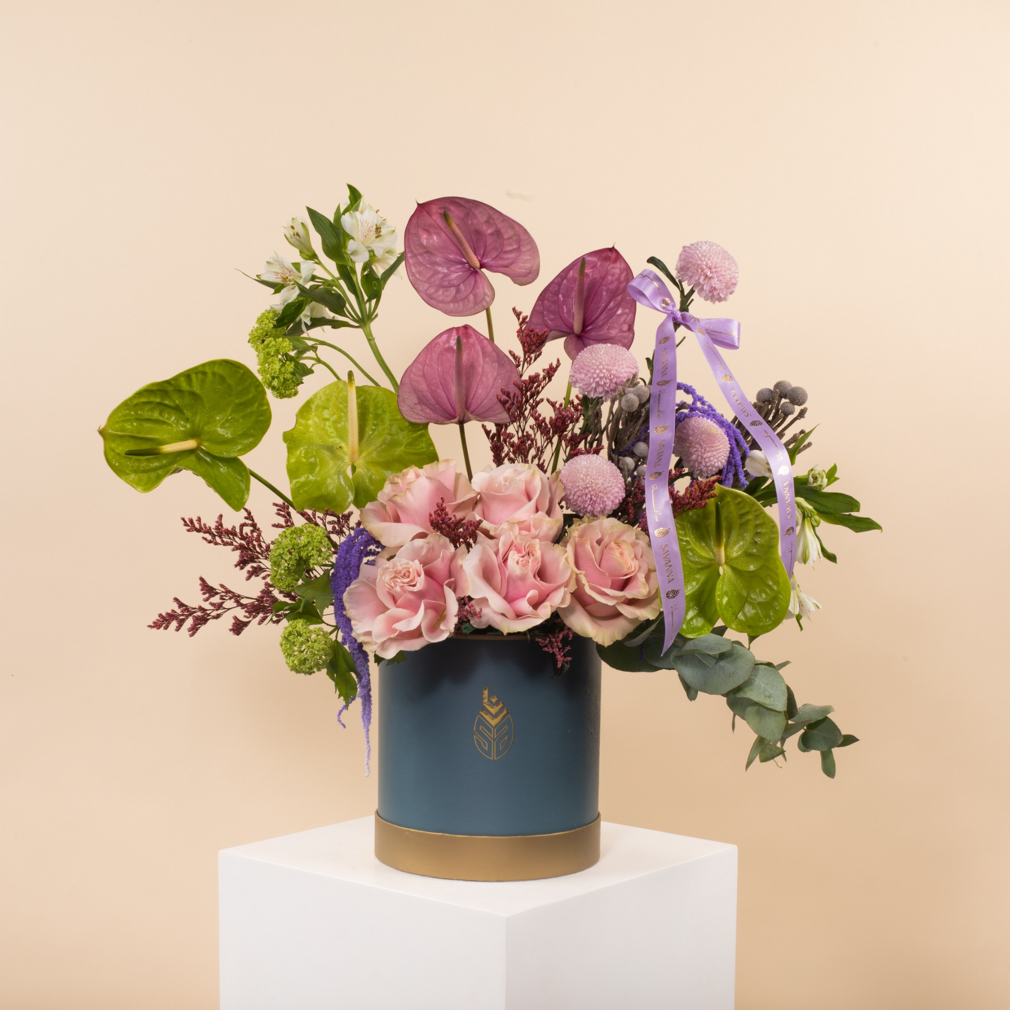 Indulge in elegance with our Premium Flower Box, featuring green and purple anthuriums, pink roses, white alstroemeria, eucalyptus, limonium, silver brunia, and decorative accents. Beautifully arranged in a luxury box