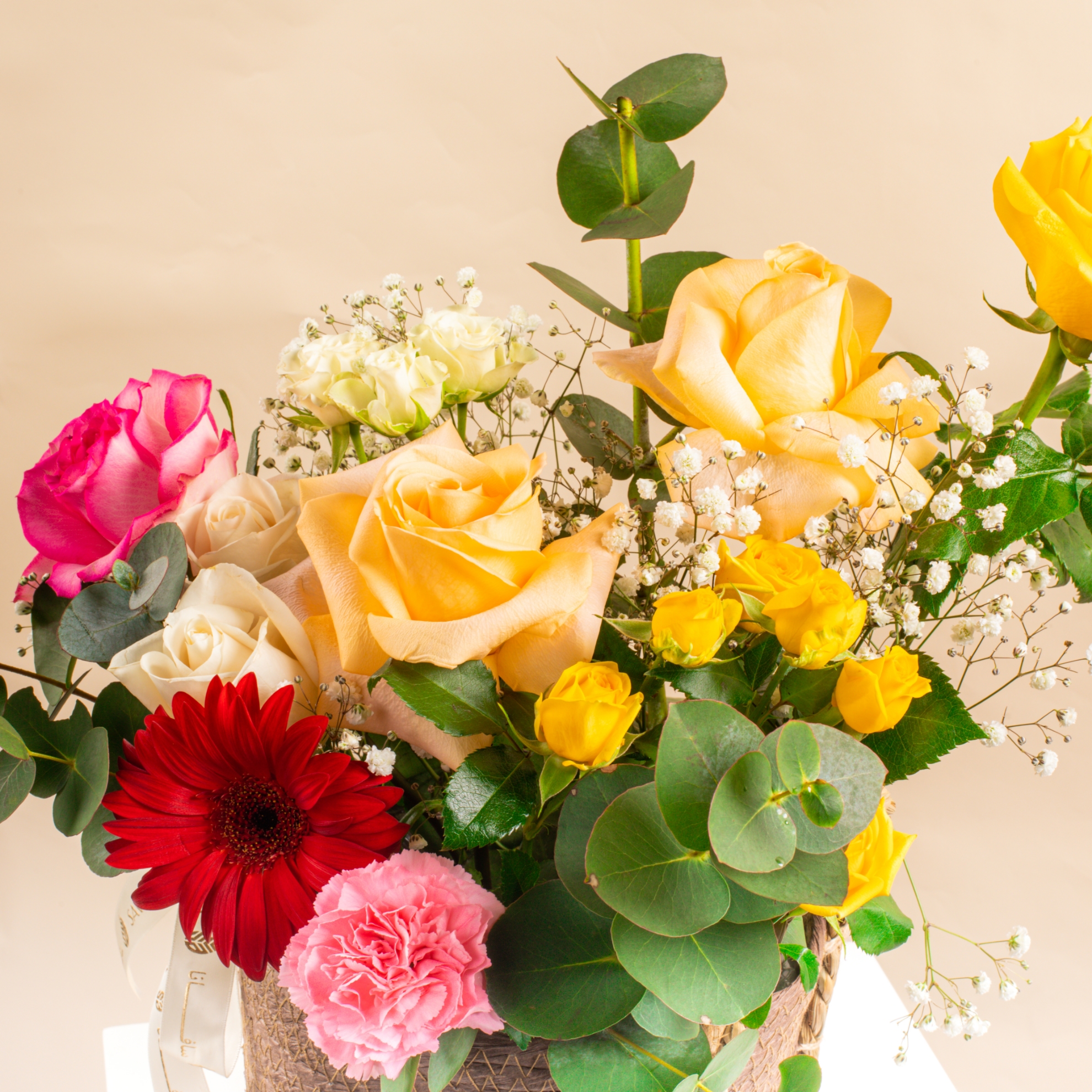 Brighten any occasion with our vibrant Flowers Basket, featuring yellow roses, yellow baby roses, red gerbera, pink carnations, white baby roses, gypsophila, eucalyptus, peach roses, and fuchsia roses. A stunning mix of colors and blooms that brings joy and elegance. Perfect for gifting or decorating your space. Order now and make every moment special!