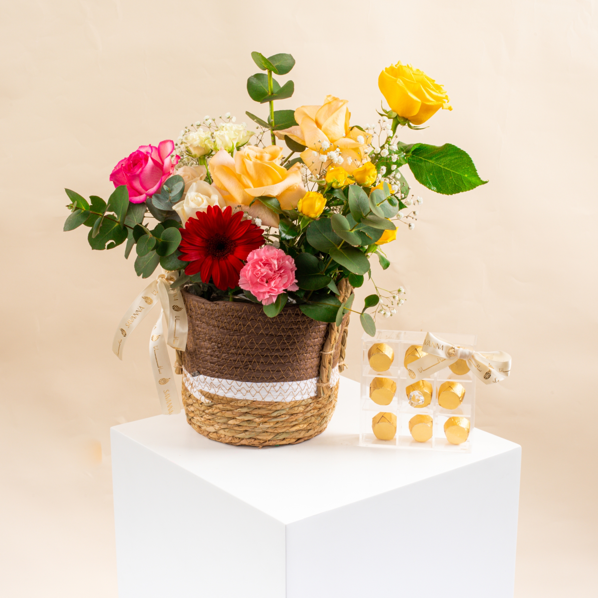 A joyful Flowers Basket featuring a vibrant mix of yellow roses, yellow and white baby roses, red gerbera, pink carnations, peach and fuchsia roses, gypsophila, and eucalyptus. Paired with a chocolate box containing 9 pieces filled with Kinder and coffee biscuit flavors. A perfect gift that blends beauty and taste – ideal for any special occasion. Order now and spread happiness!