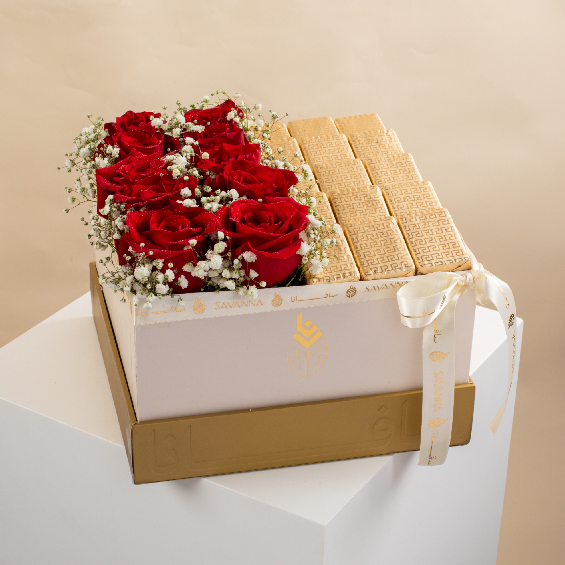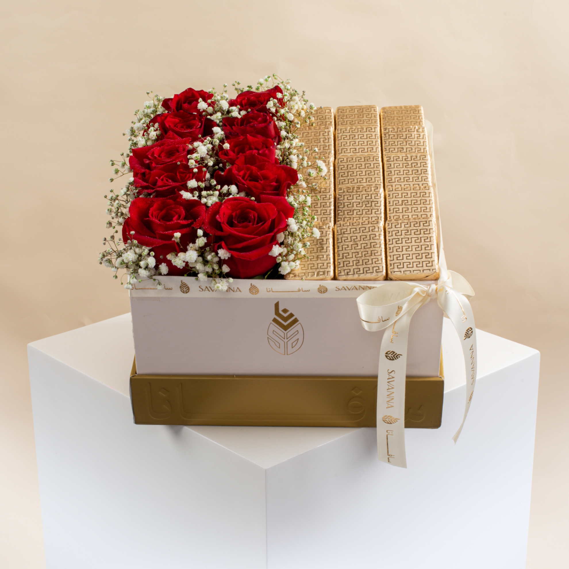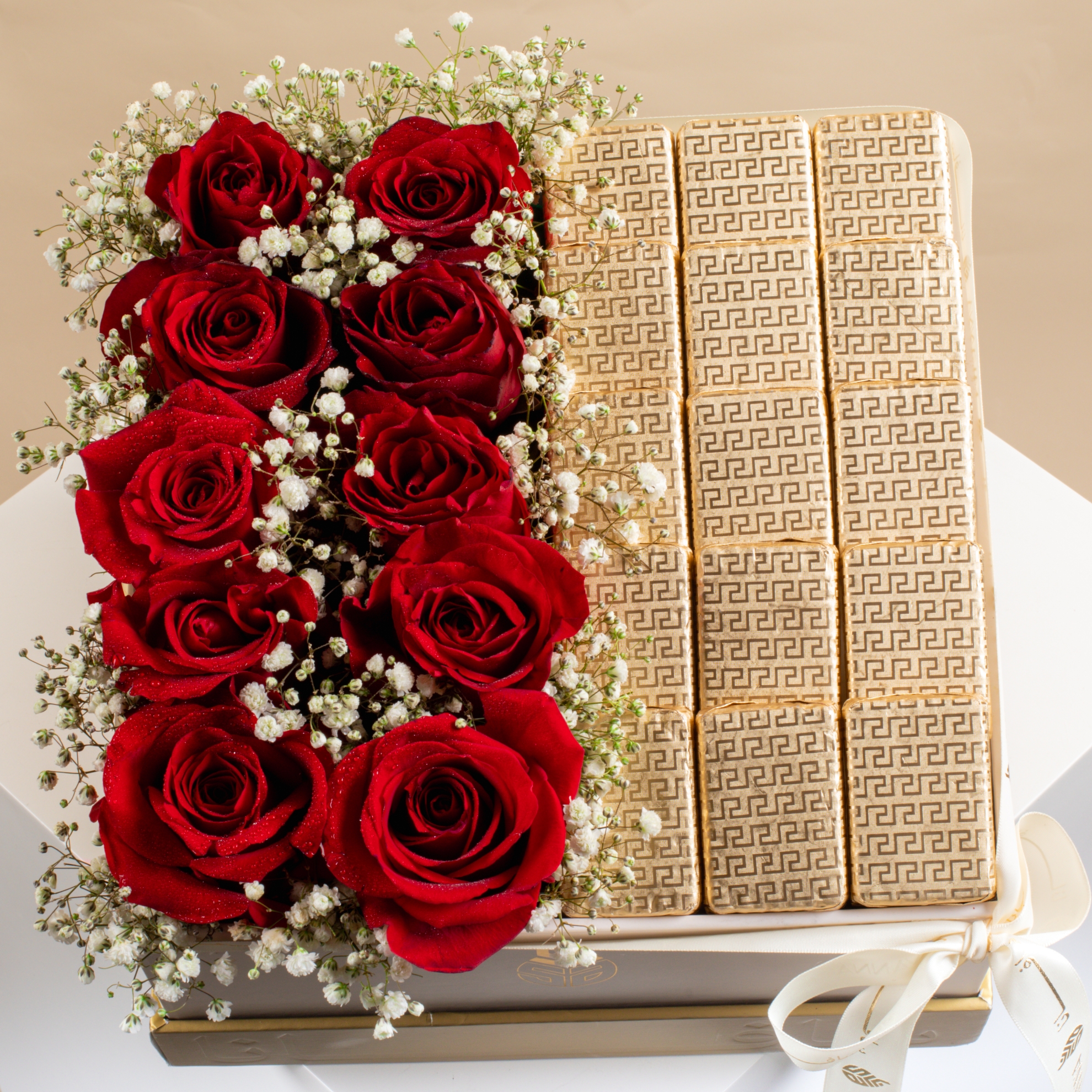 A romantic flower box filled with deep red roses, delicate gypsophila, and 15 pieces of smooth milk chocolate. A perfect gift to express love, passion, and sweetness in one elegant package.