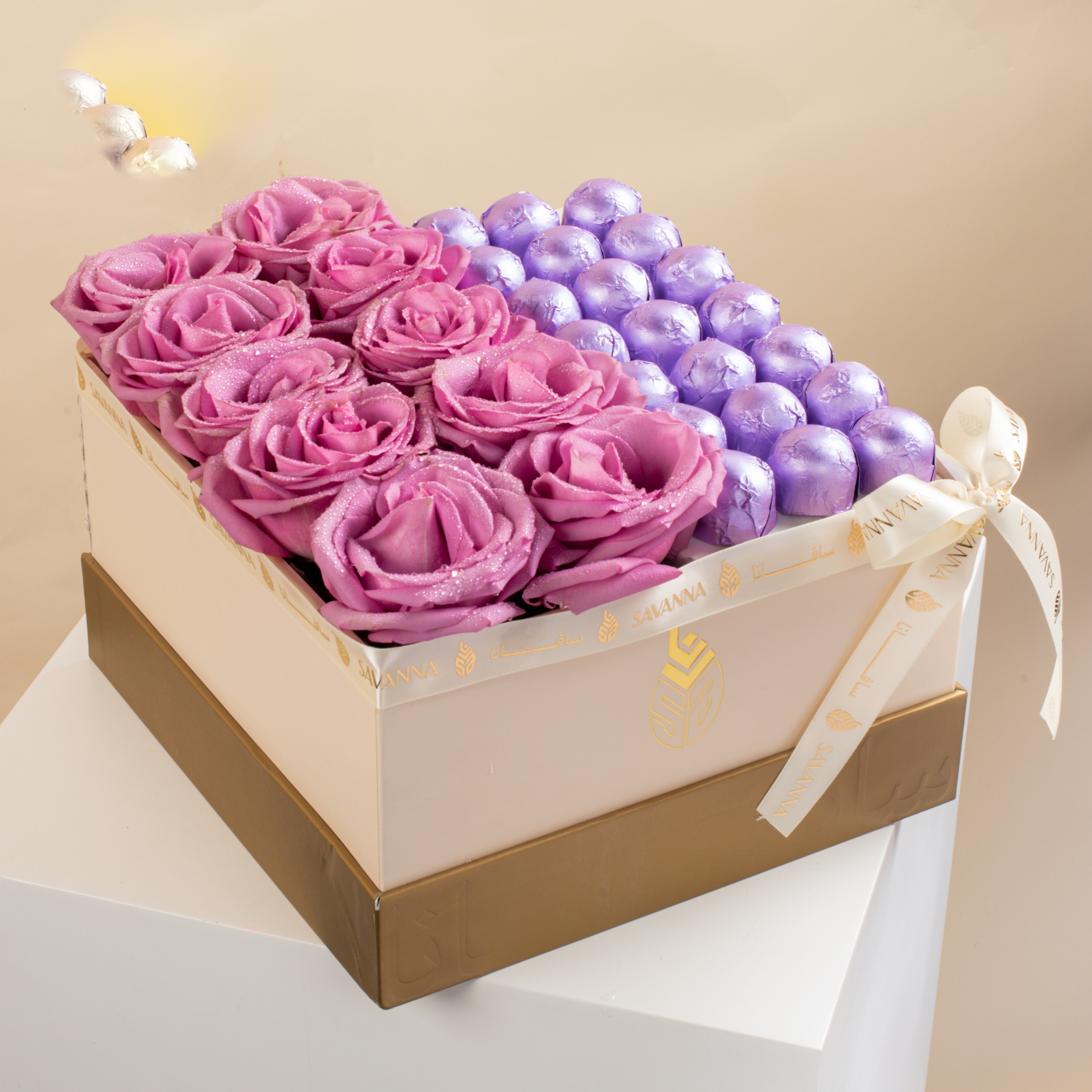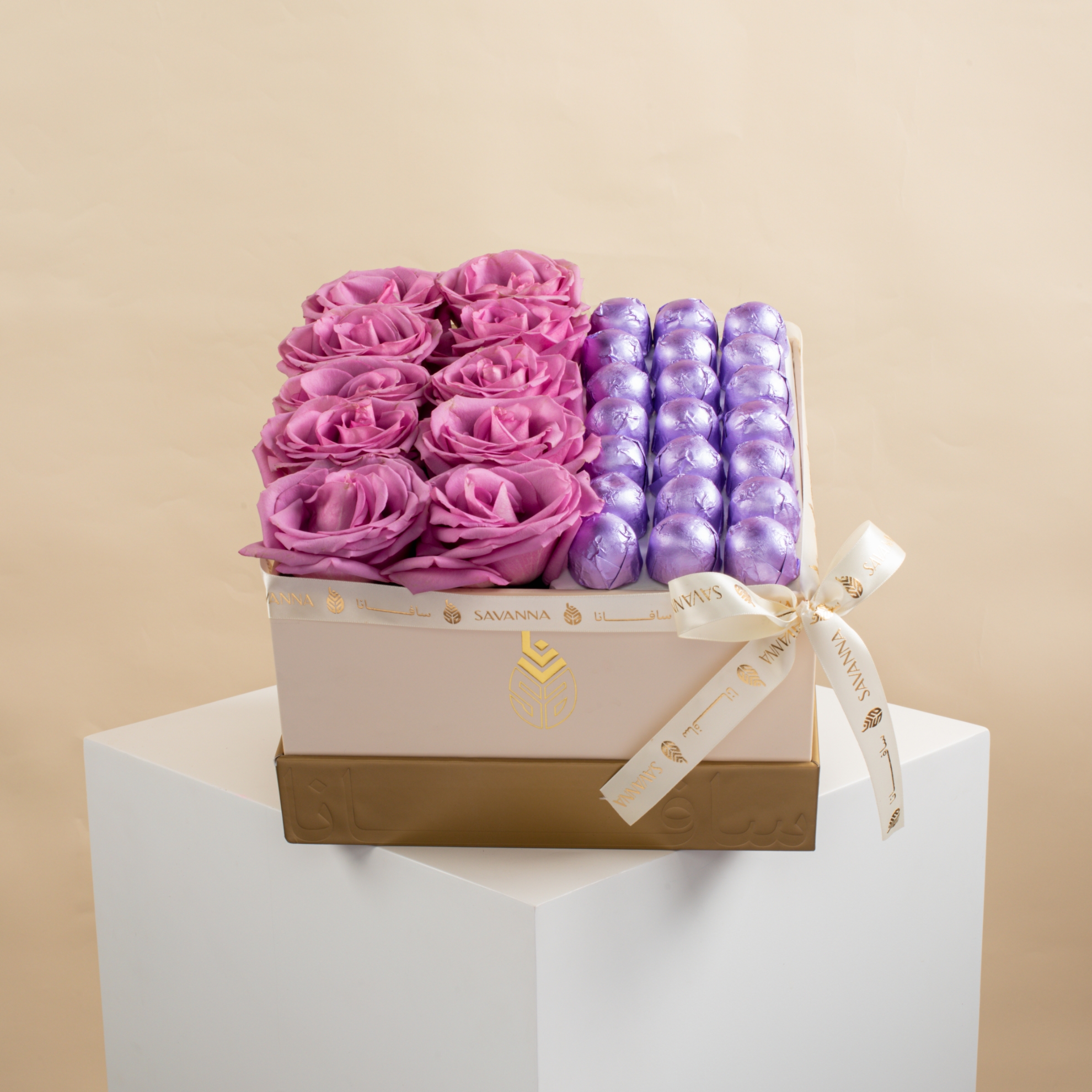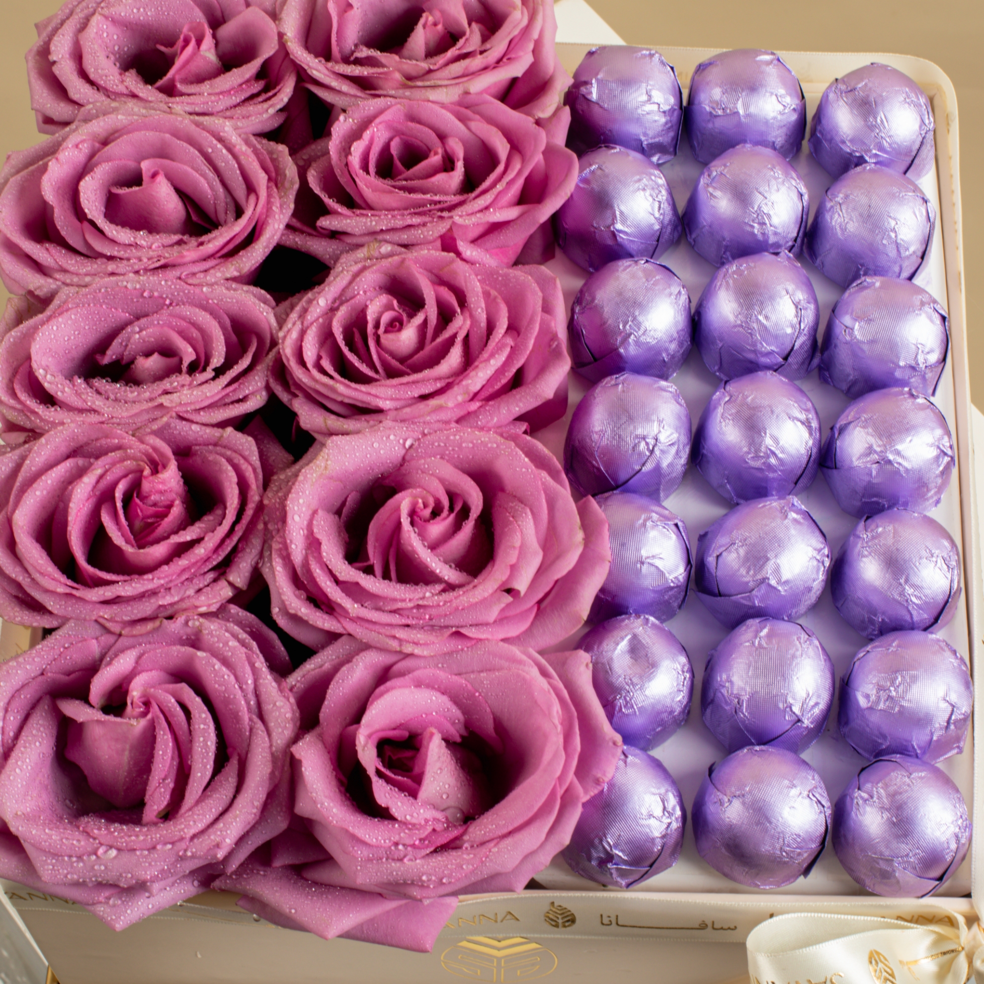 A luxurious flower box featuring elegant purple roses paired with 21 pieces of rich hazelnut and almond chocolates. A perfect harmony of beauty and flavor — ideal for gifting or indulging in special moments.