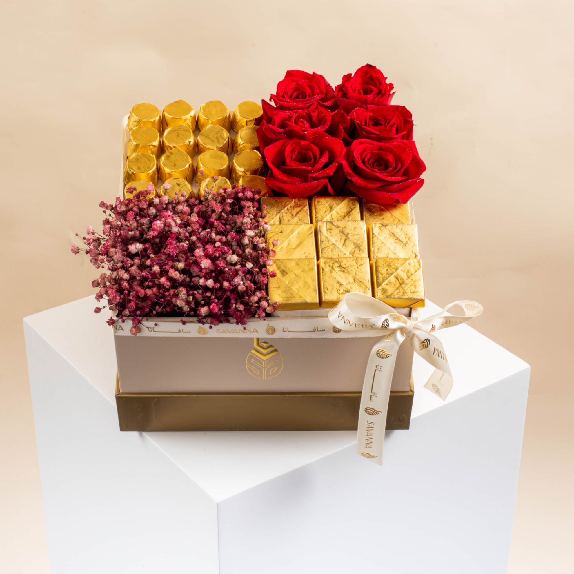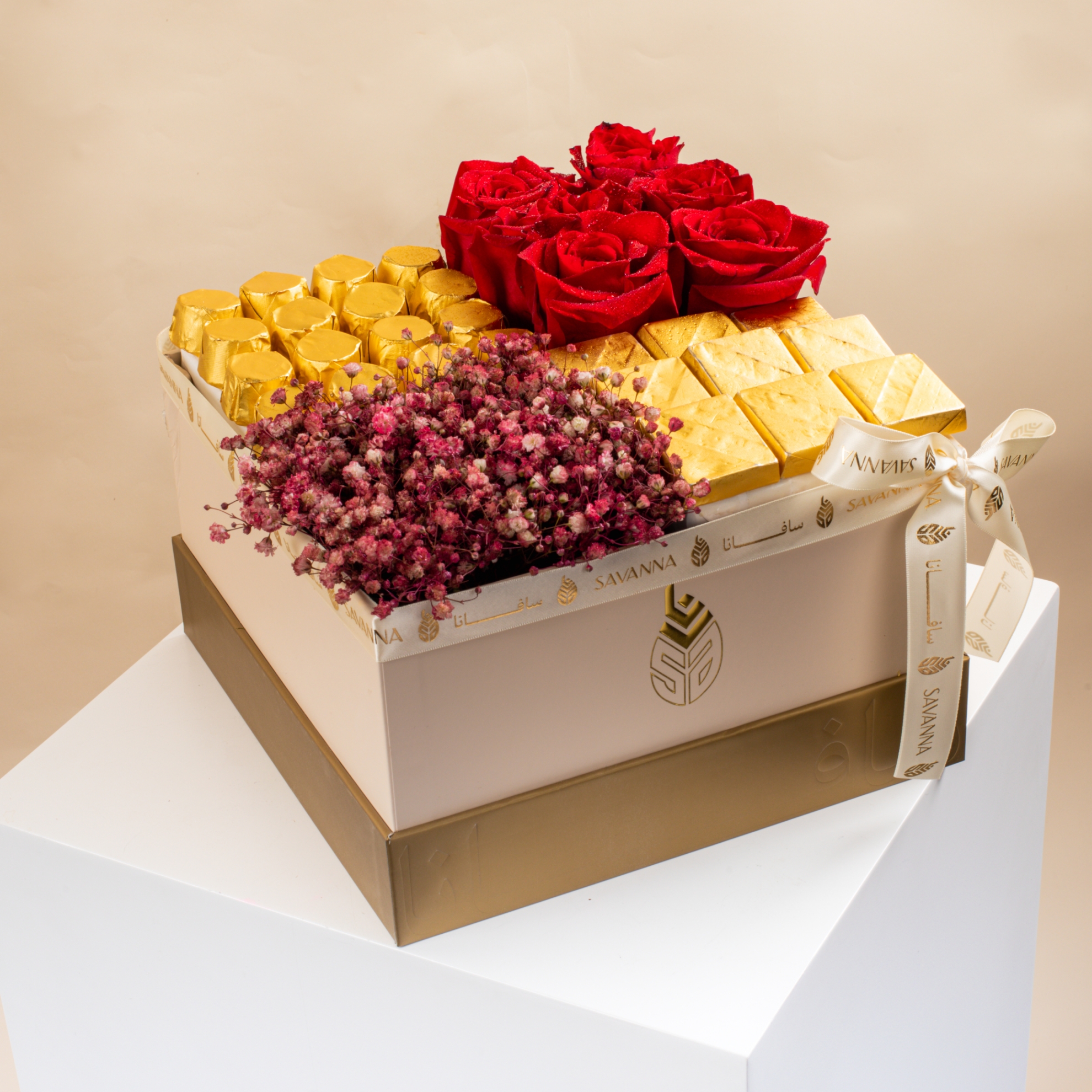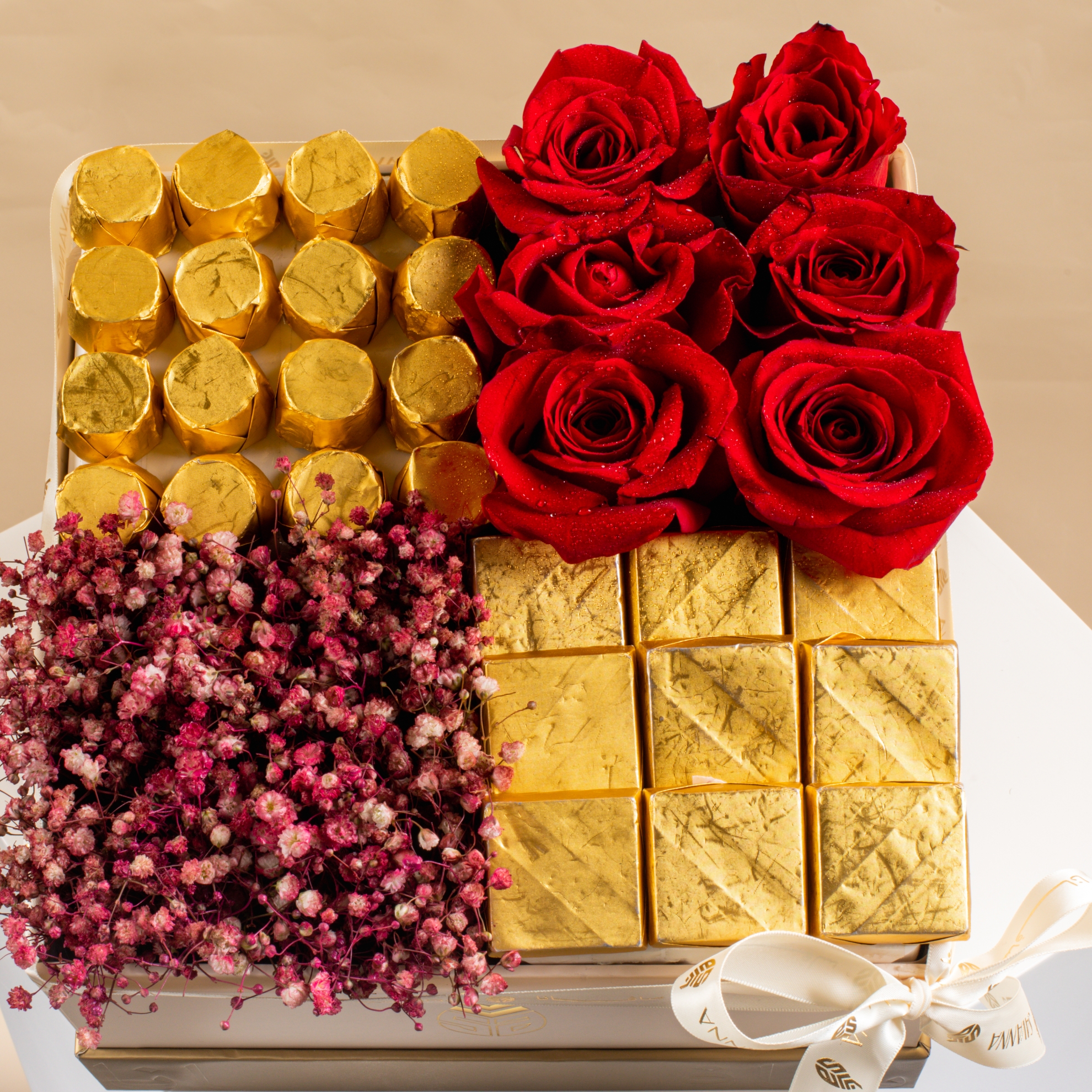 An elegant box featuring stunning red roses, delicate gypsophila, and 25 pieces of creamy milk chocolate. A luxurious gift that speaks romance and indulgence — perfect for unforgettable moments.