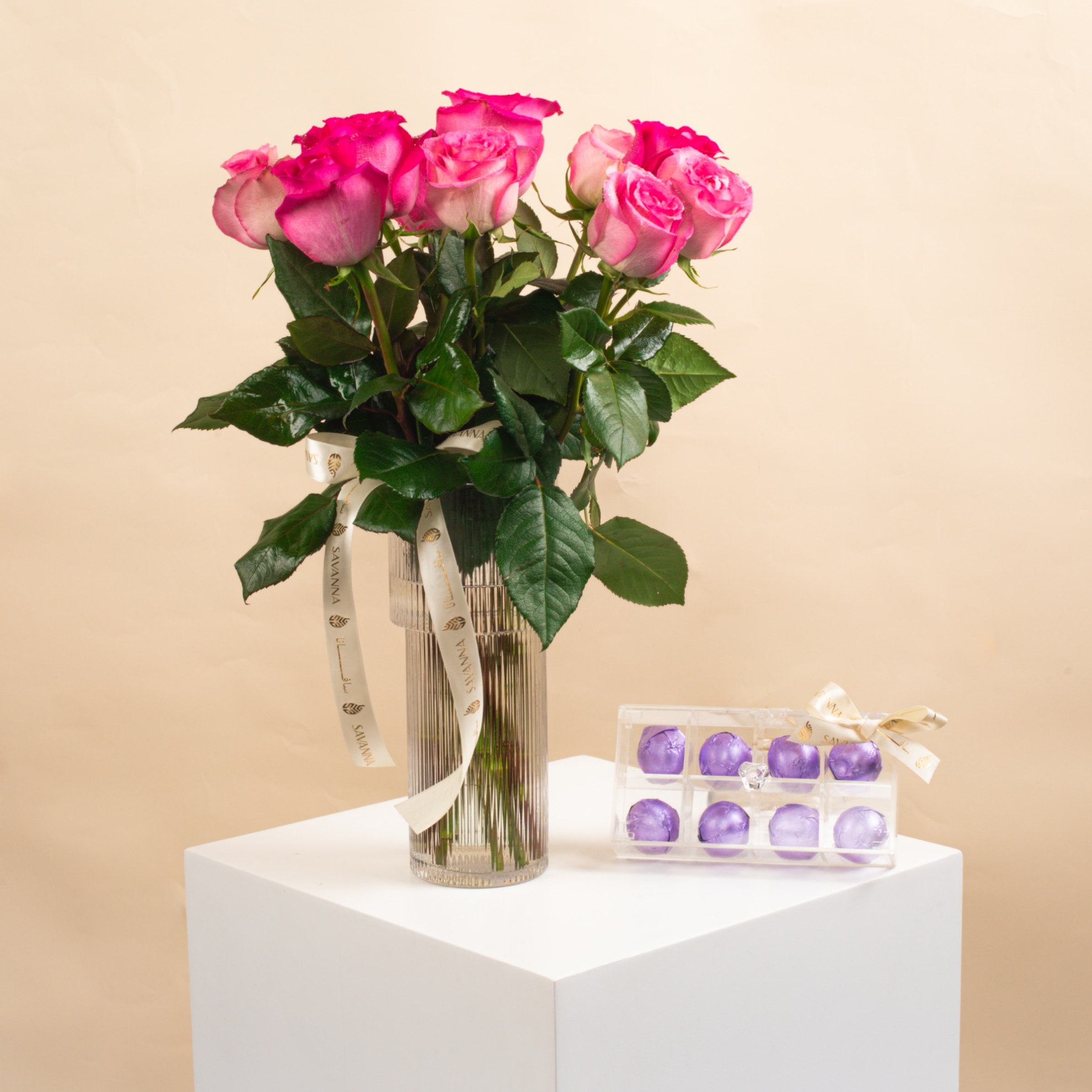 An elegant glass vase featuring a vibrant fuchsia rose, paired with 8 pieces of premium hazelnut almond chocolate. A perfect gift combining striking colors and delicious flavor — ideal for showing care and sophistication on any occasion.