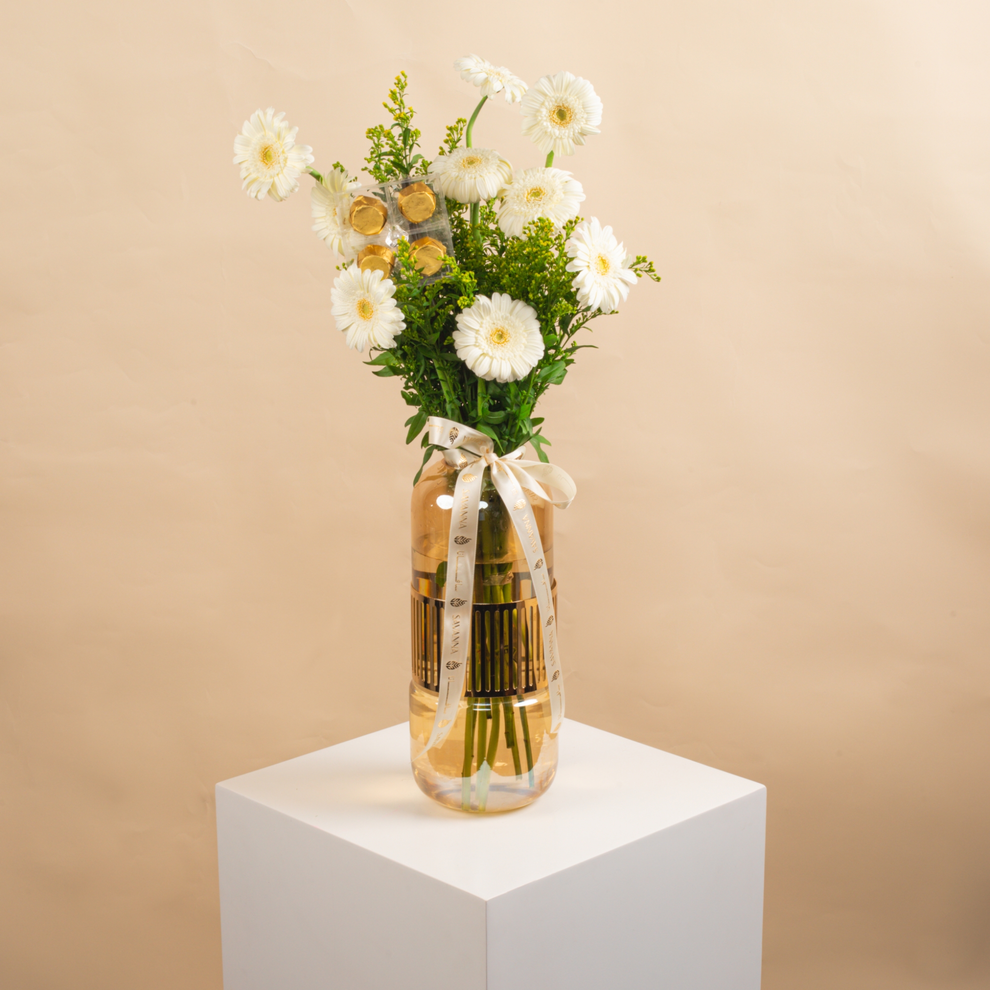 An elegant glass vase featuring beautiful white gerbera flowers, paired with 4 pieces of Kinder coffee biscuit chocolate. A sophisticated gift that blends purity and delicious flavor — perfect for any special occasion.