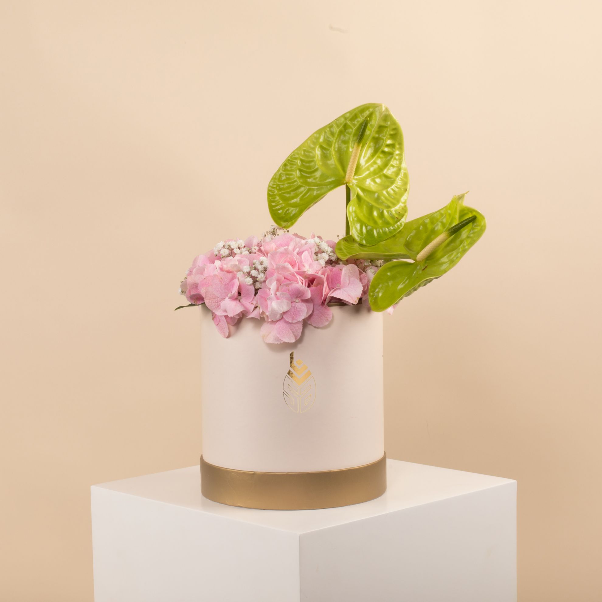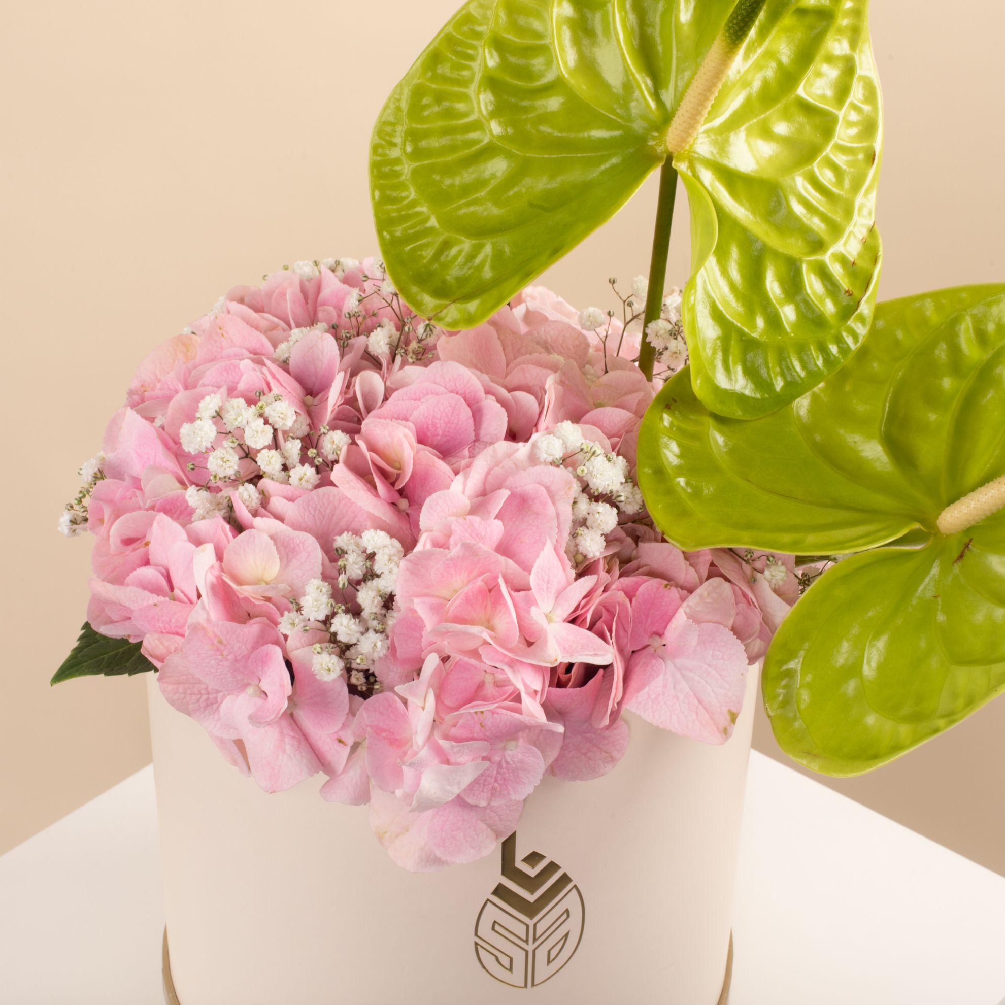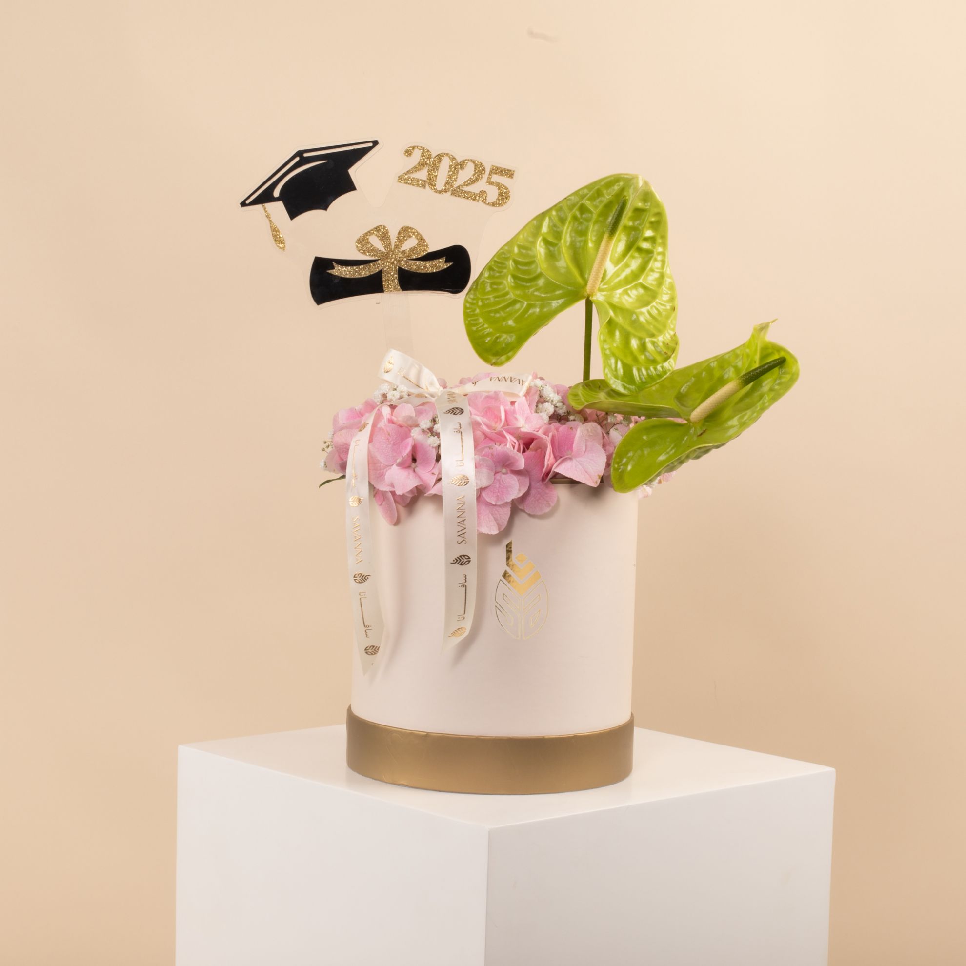Celebrate graduation with our Savanna Round Flower Box! This stunning arrangement includes Pink Hydrangeas, Green Anthuriums, and Gypsophila, symbolizing elegance, success, and new beginnings. A perfect gift to add beauty and sophistication to their special day. Order now and make their graduation unforgettable!