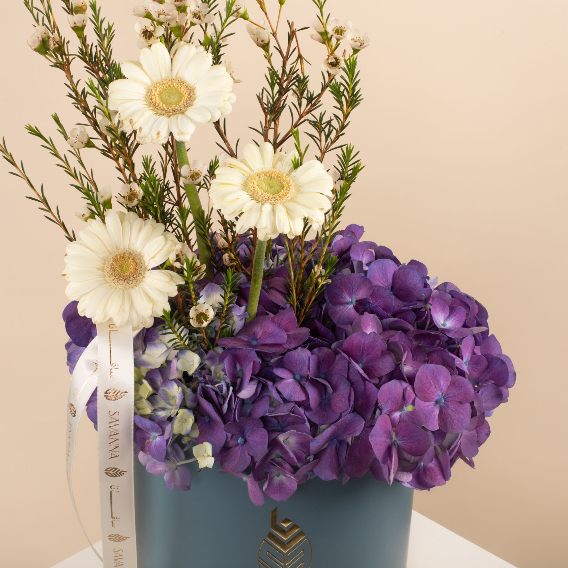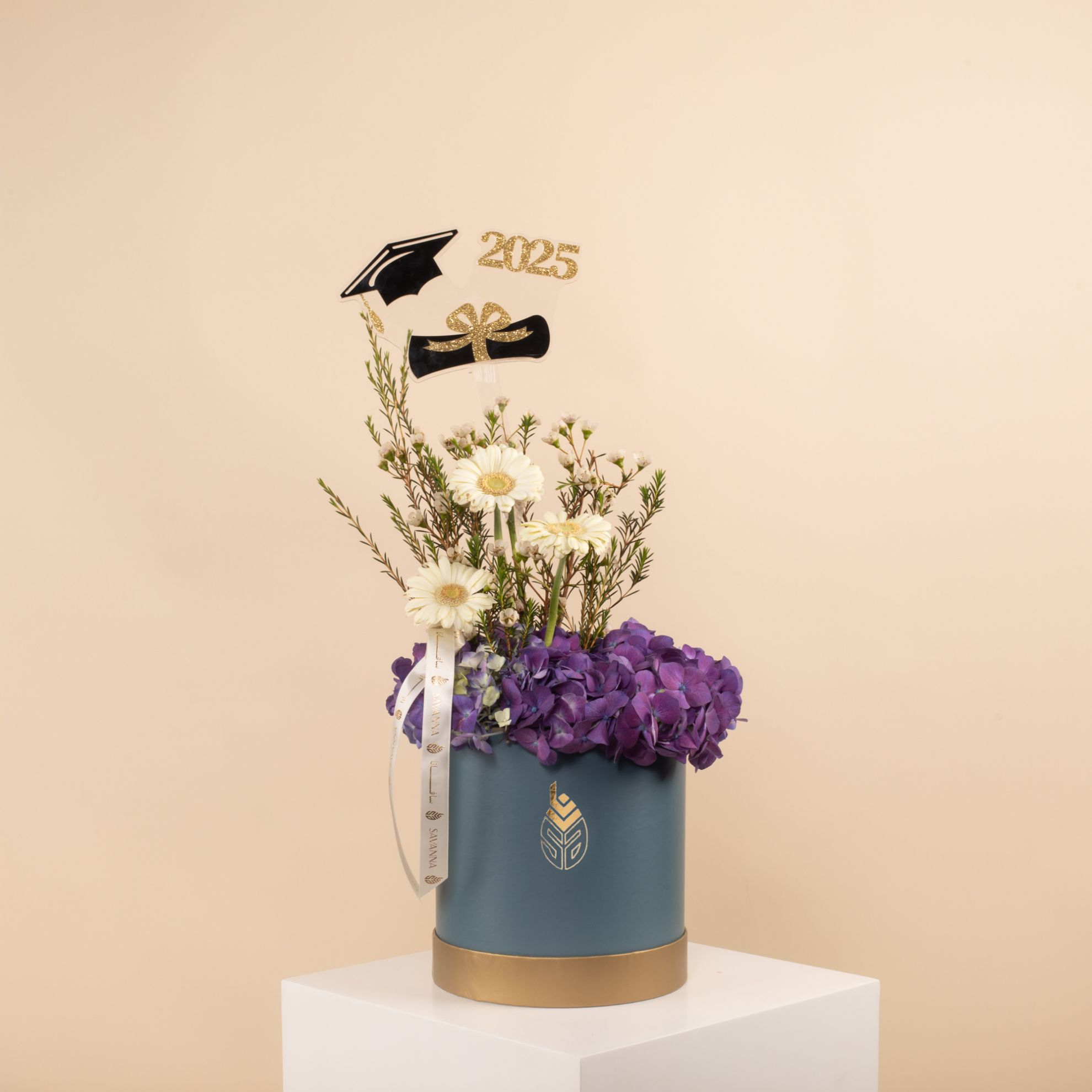 Celebrate graduation with our Savanna Round Flower Box! This elegant arrangement features Purple Hydrangeas, Gerberas, and White Wax Flowers, symbolizing success, joy, and new beginnings. A perfect gift to brighten their special day with beauty and grace. Order now and make their graduation unforgettable!