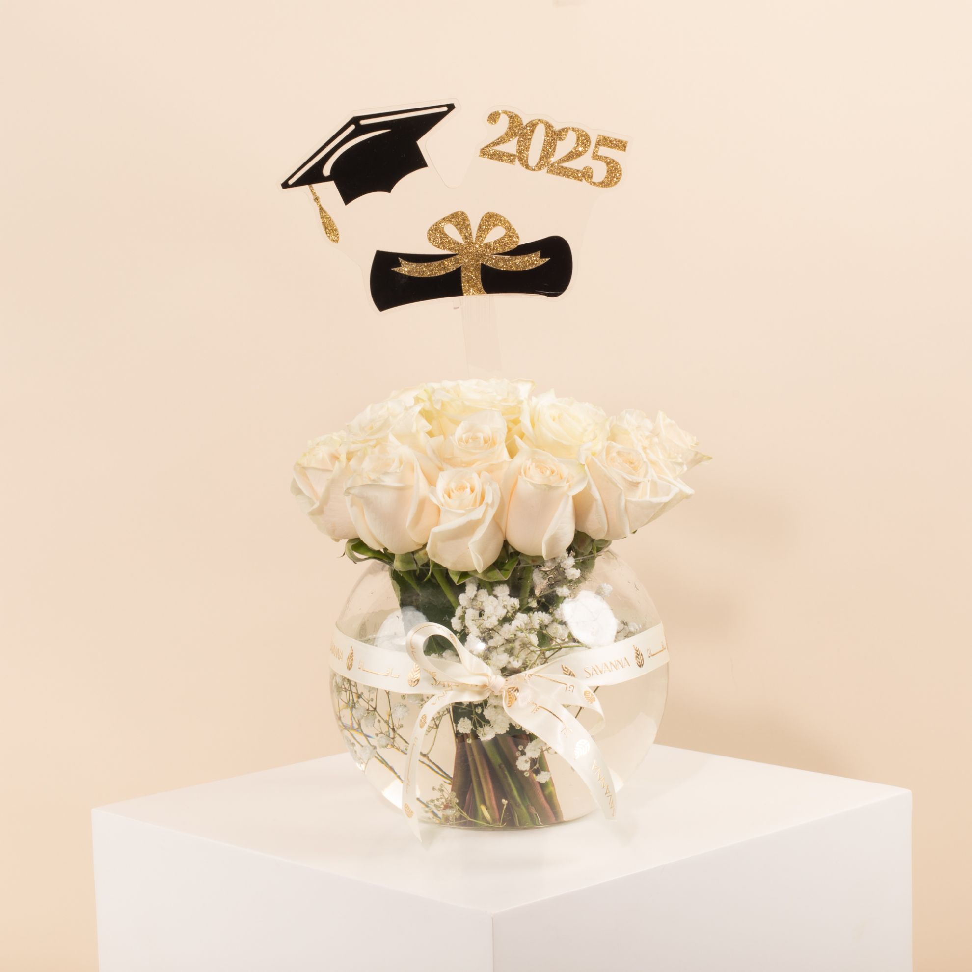Celebrate graduation with our Glass Vase featuring 20 White Roses! Elegant and timeless, this arrangement symbolizes purity, achievement, and new beginnings. A perfect gift to add grace and beauty to their special day. Order now and make their graduation unforgettable