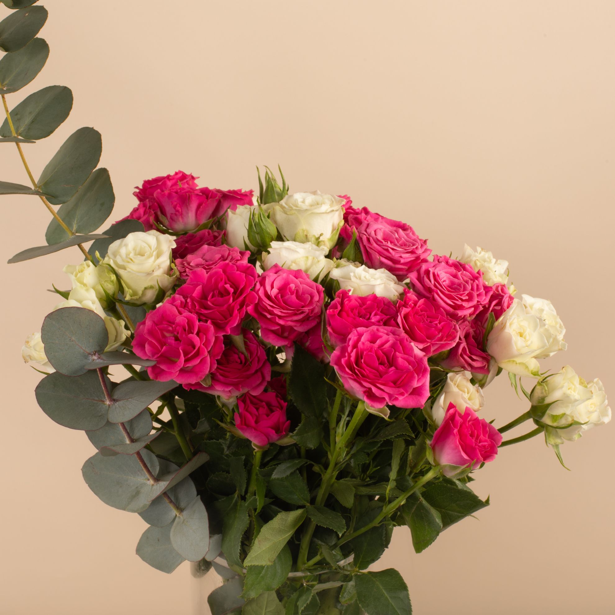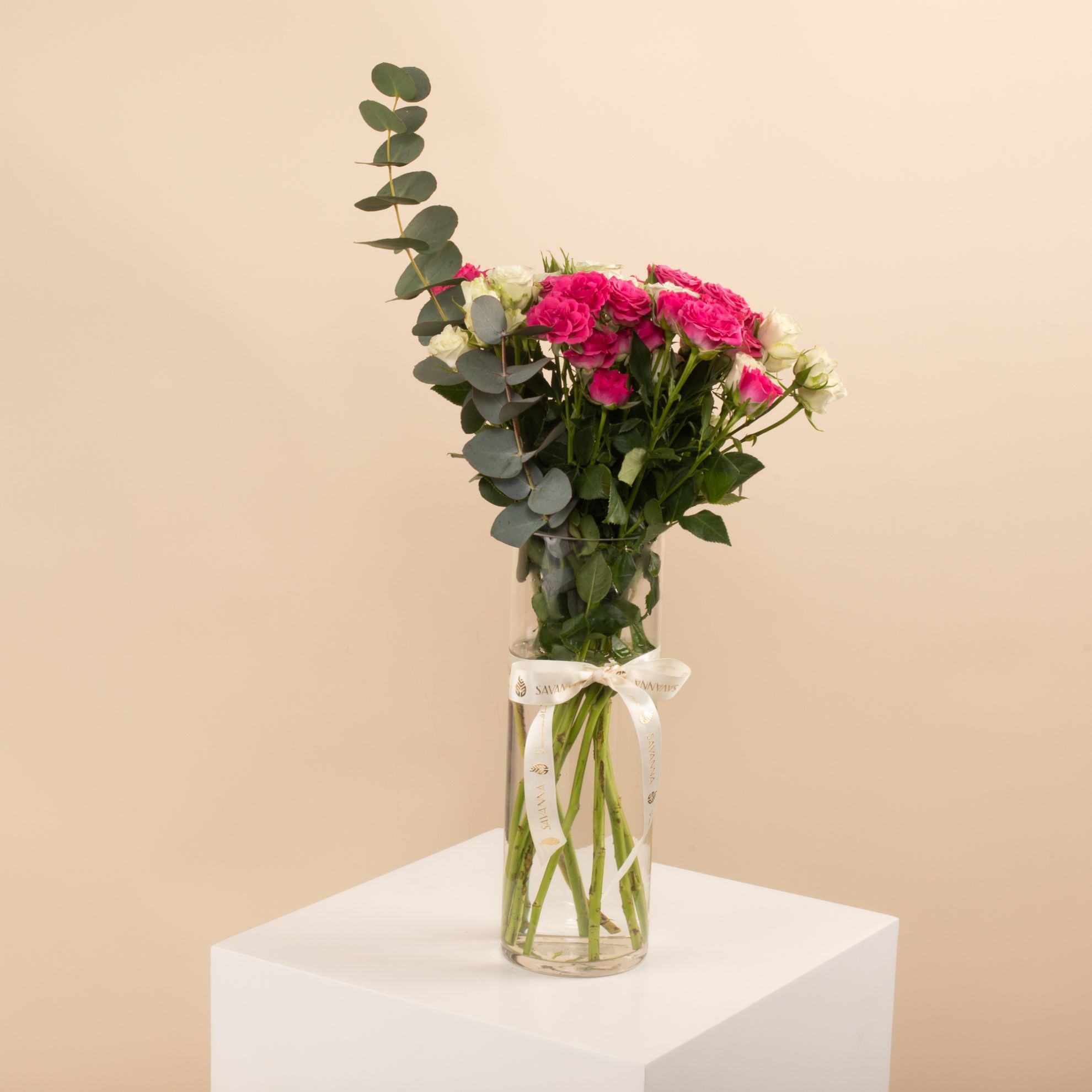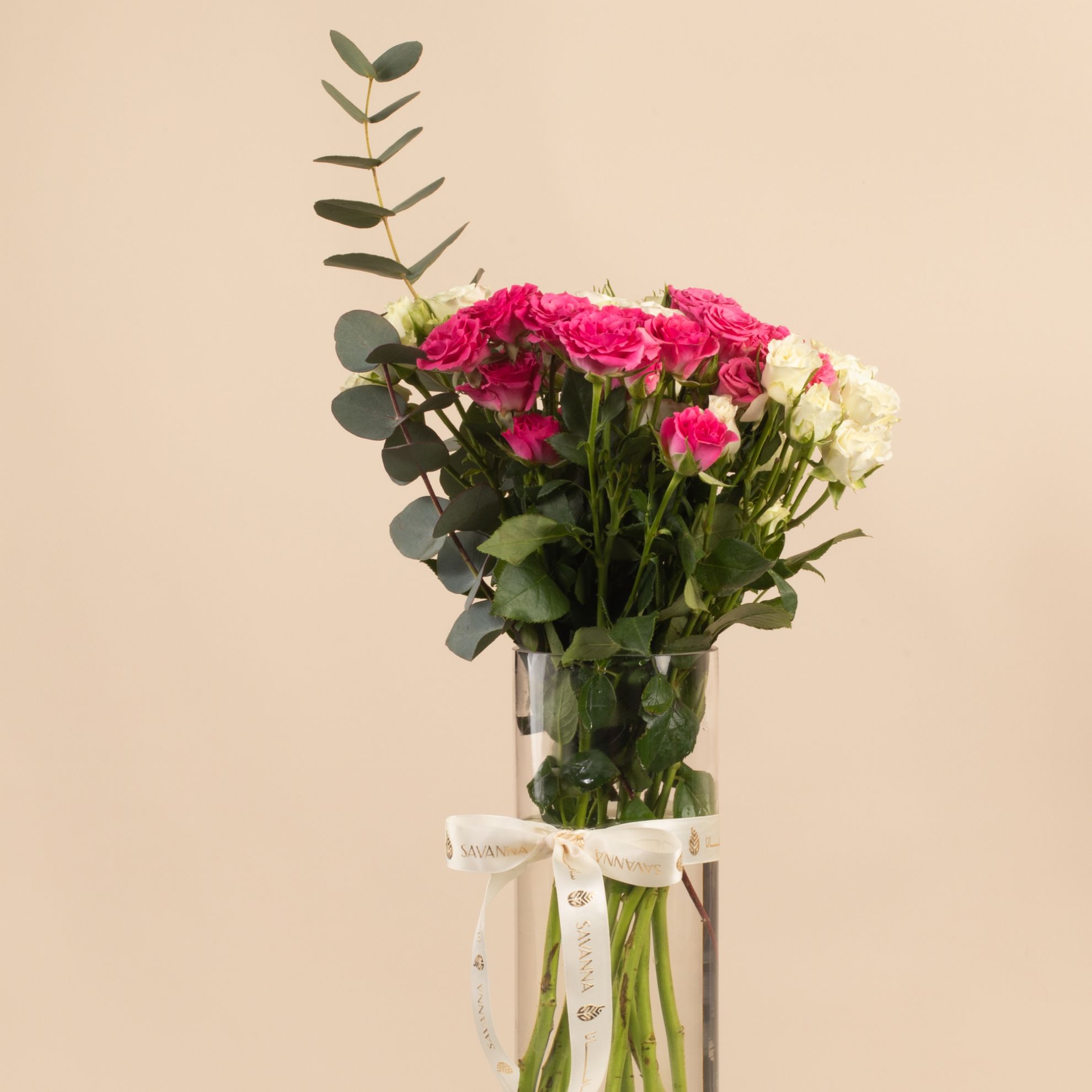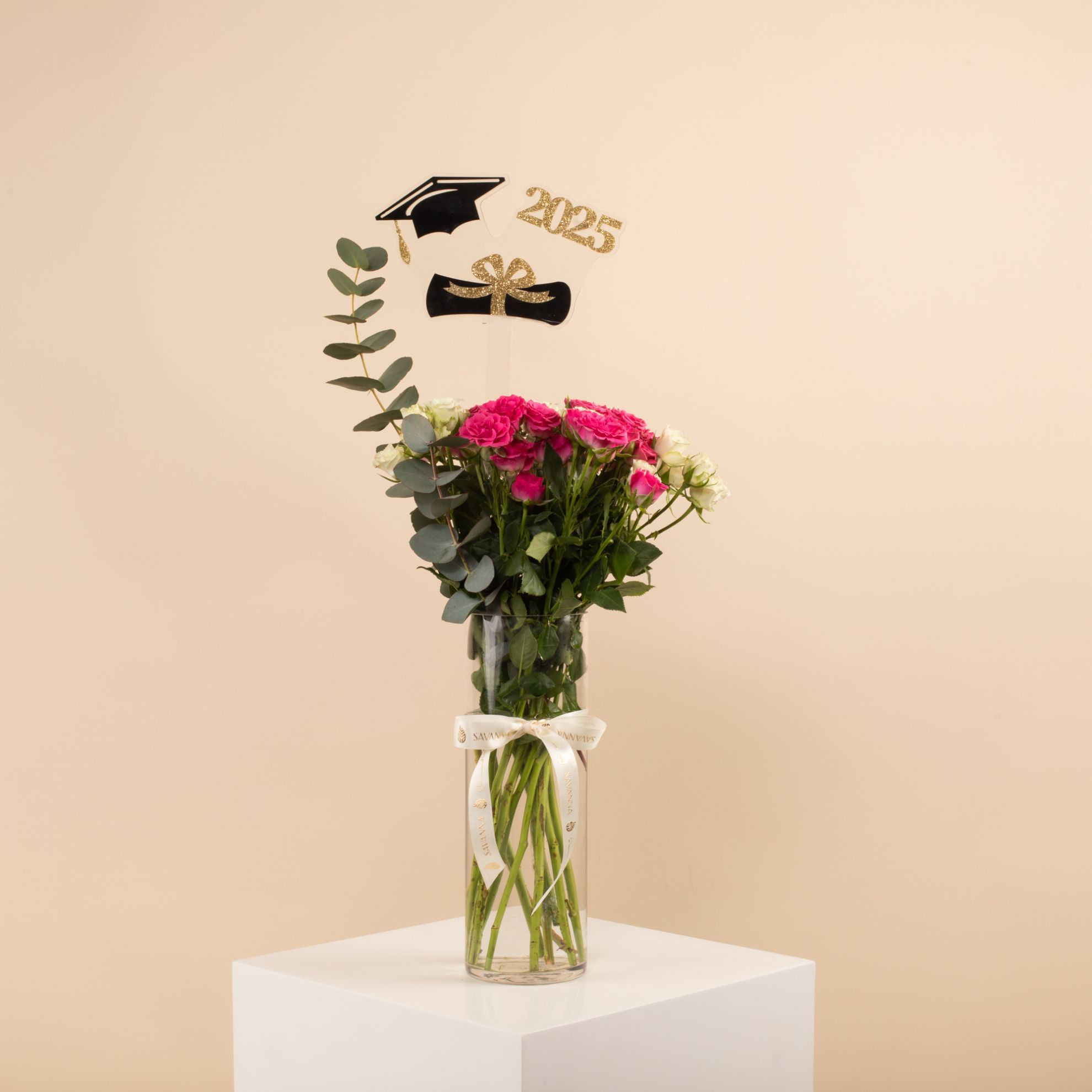 Celebrate graduation with our Glass Vase featuring Fuchsia Baby Roses, White Baby Roses, and Eucalyptus! This elegant arrangement symbolizes love, success, and new beginnings. A perfect gift to make their graduation day even more memorable. Order now and add beauty and grace to their special occasion!