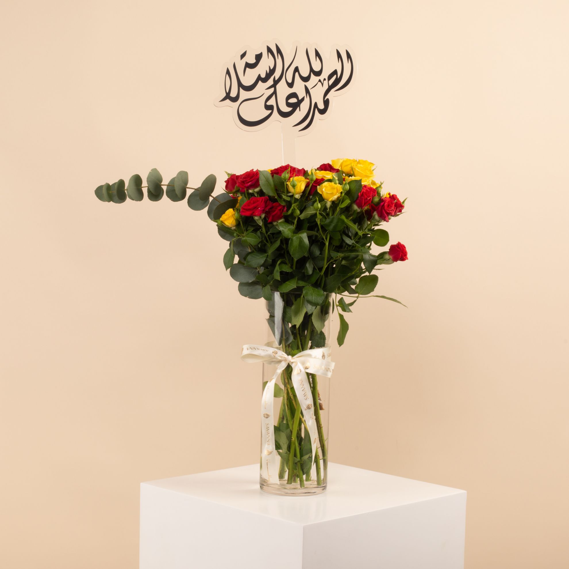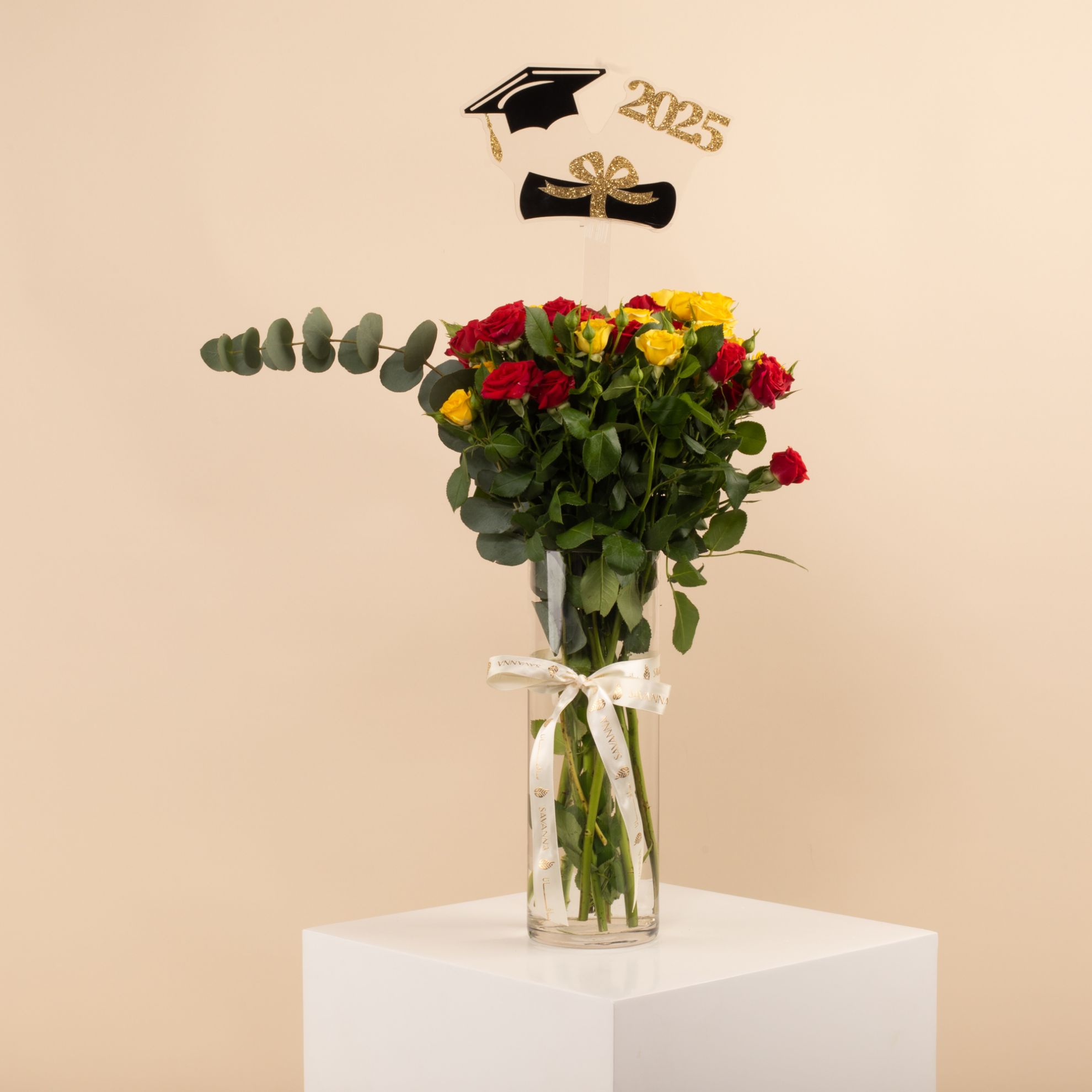 Celebrate graduation with our Glass Vase featuring Red Baby Roses, Yellow Baby Roses, and Eucalyptus! This elegant arrangement symbolizes love, joy, and new beginnings. A perfect gift to mark their special achievement with beauty and grace. Order now and make their graduation day unforgettable!