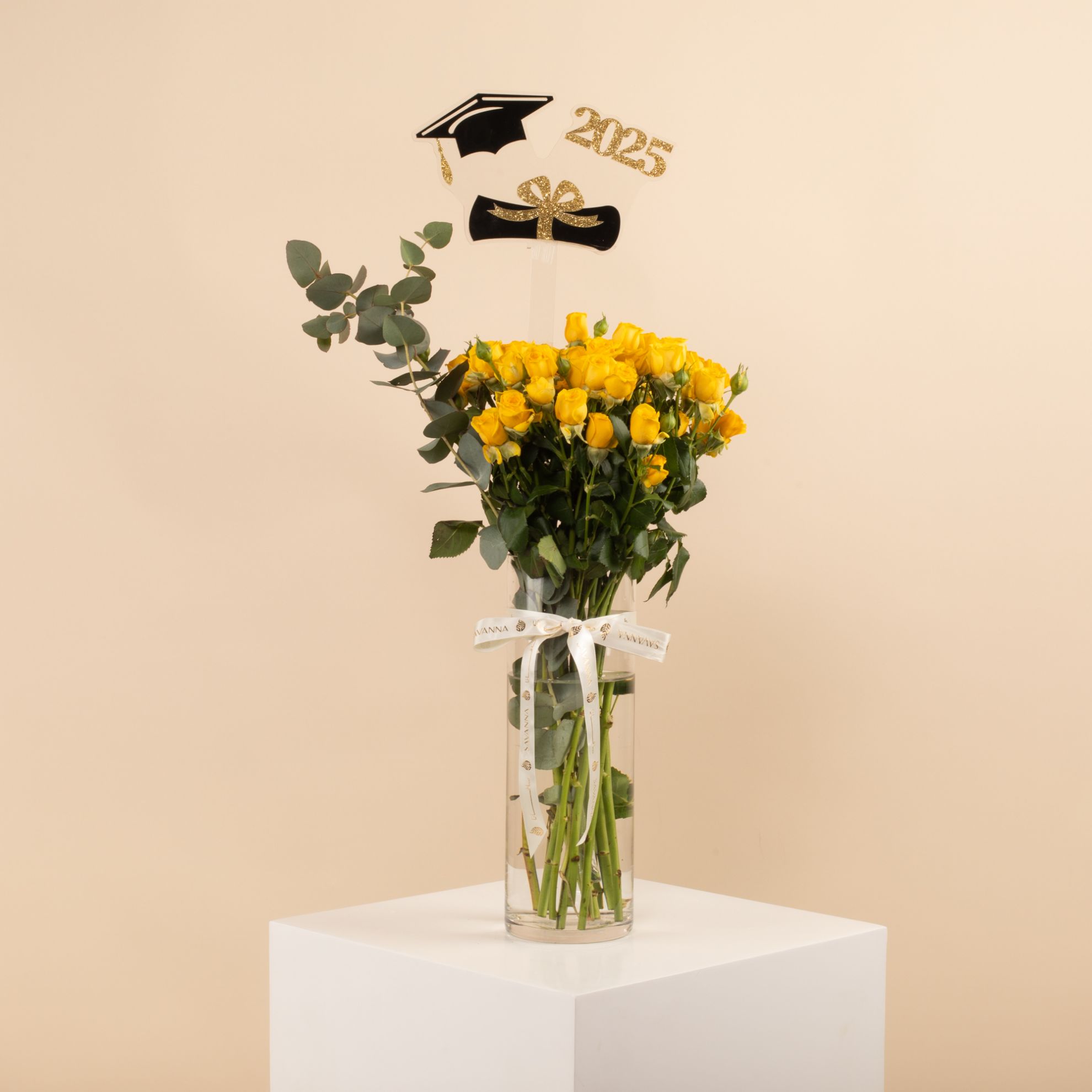 Celebrate graduation with our Glass Vase featuring 10 Yellow Baby Roses and Eucalyptus! This vibrant arrangement symbolizes joy, success, and new beginnings. A perfect gift to brighten their special day with beauty and elegance. Order now and make their graduation unforgettable!