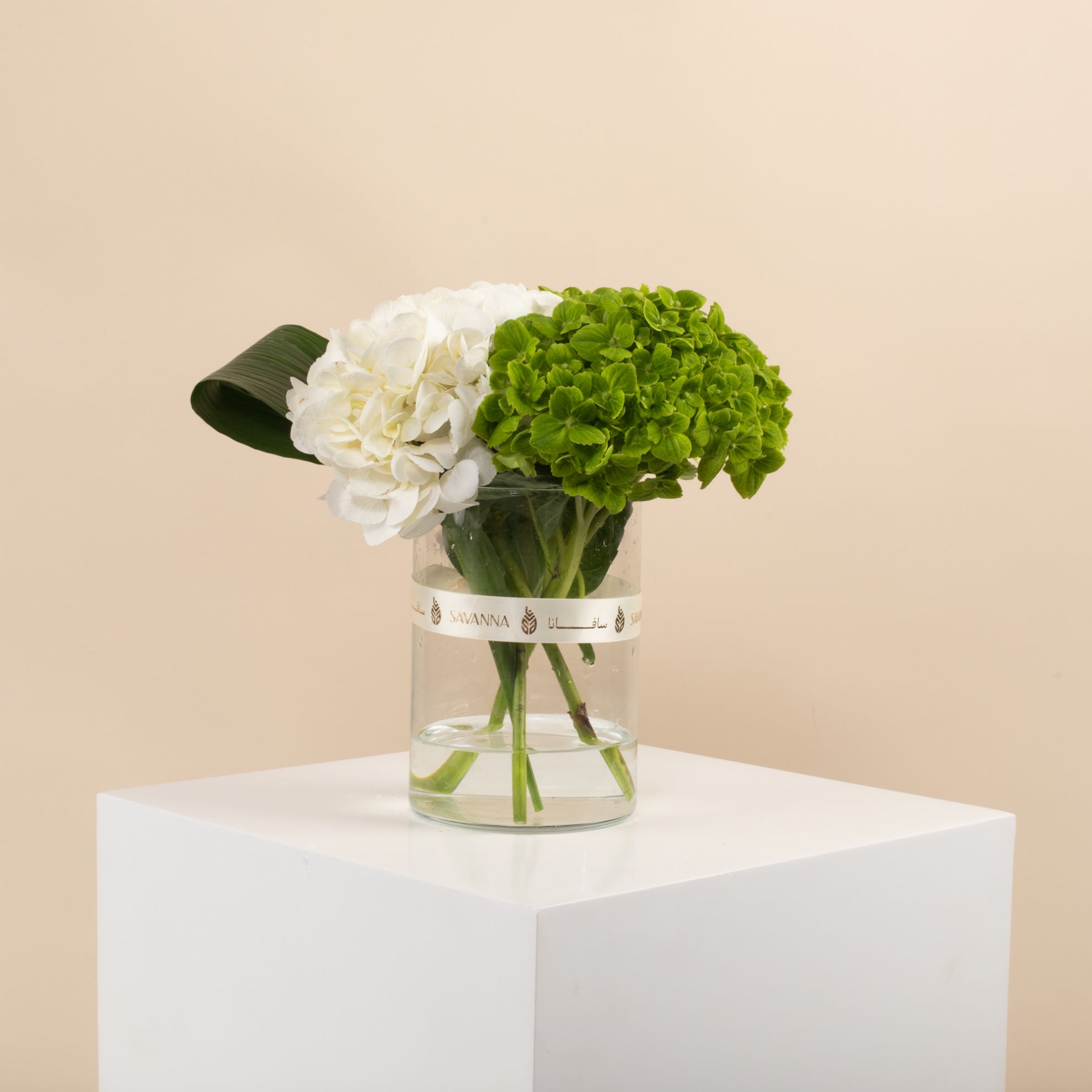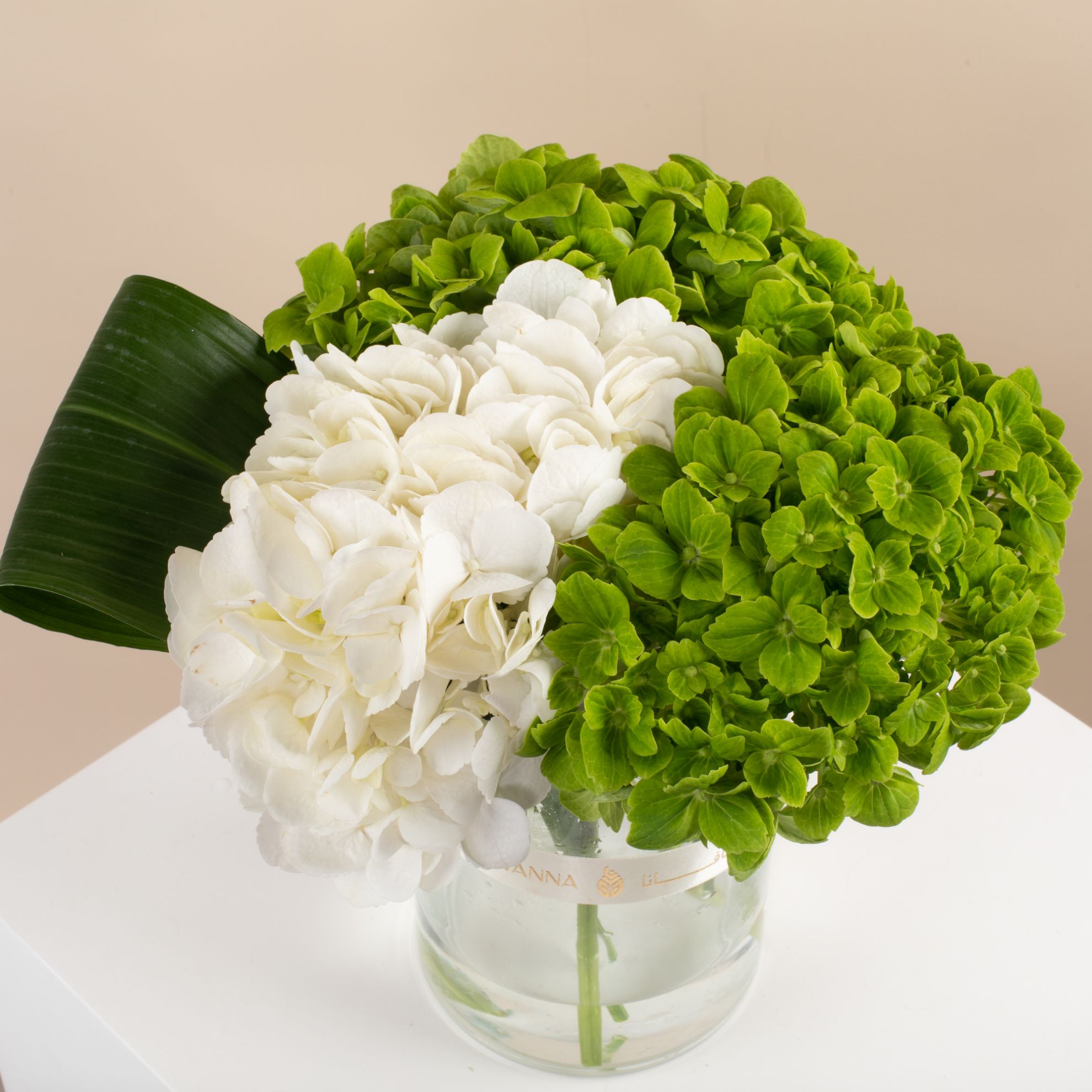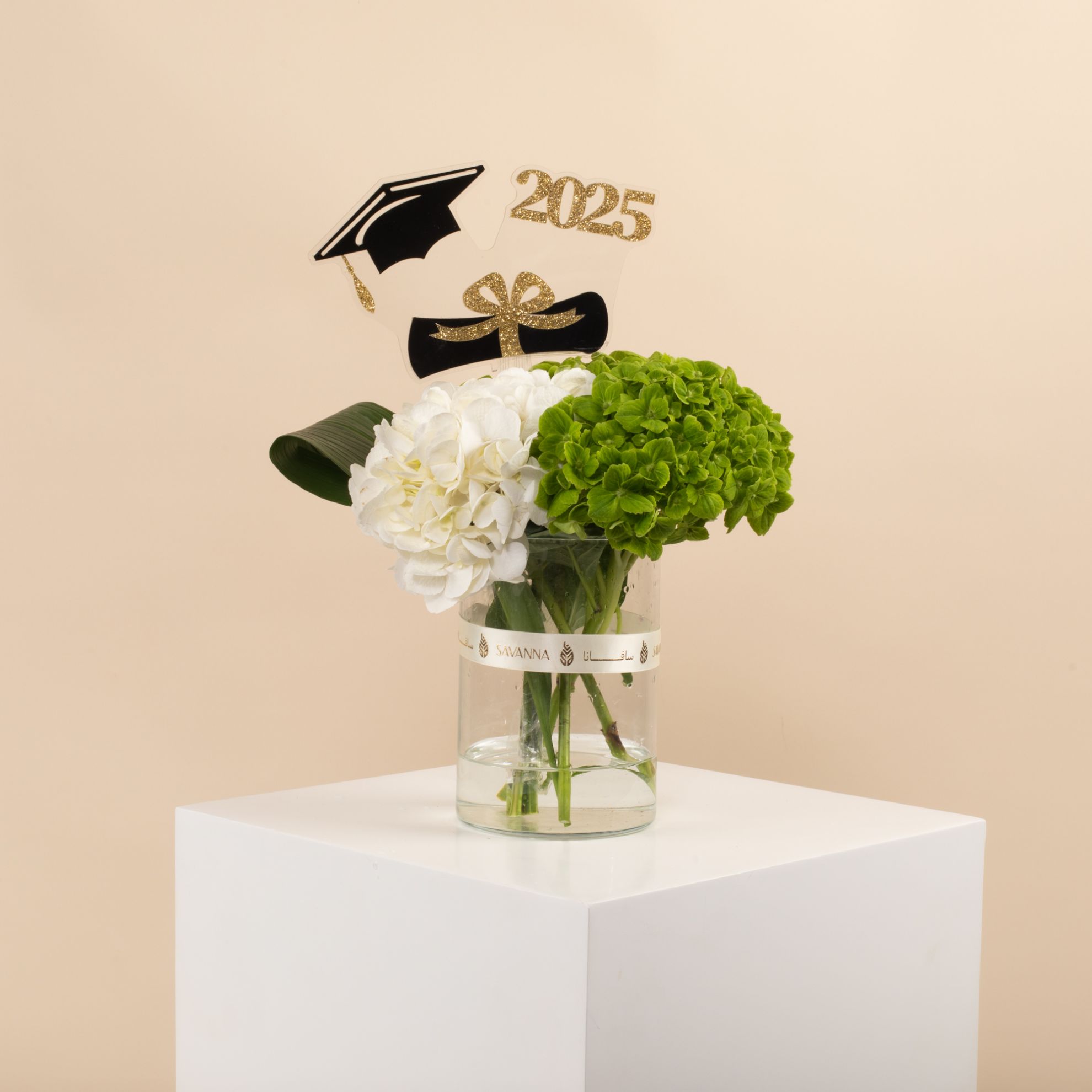 Celebrate graduation with our Glass Vase featuring Green Hydrangeas, White Hydrangeas, and Aspidistra! This elegant arrangement symbolizes success, growth, and new beginnings. A perfect gift to add beauty and sophistication to their special day. Order now and make their graduation unforgettable!