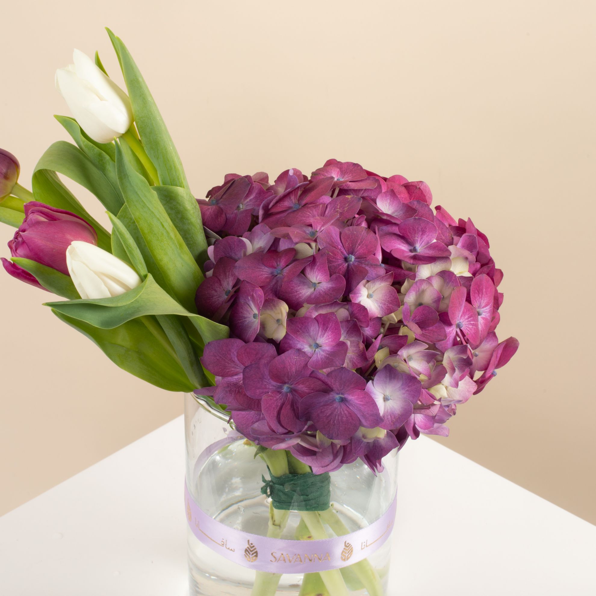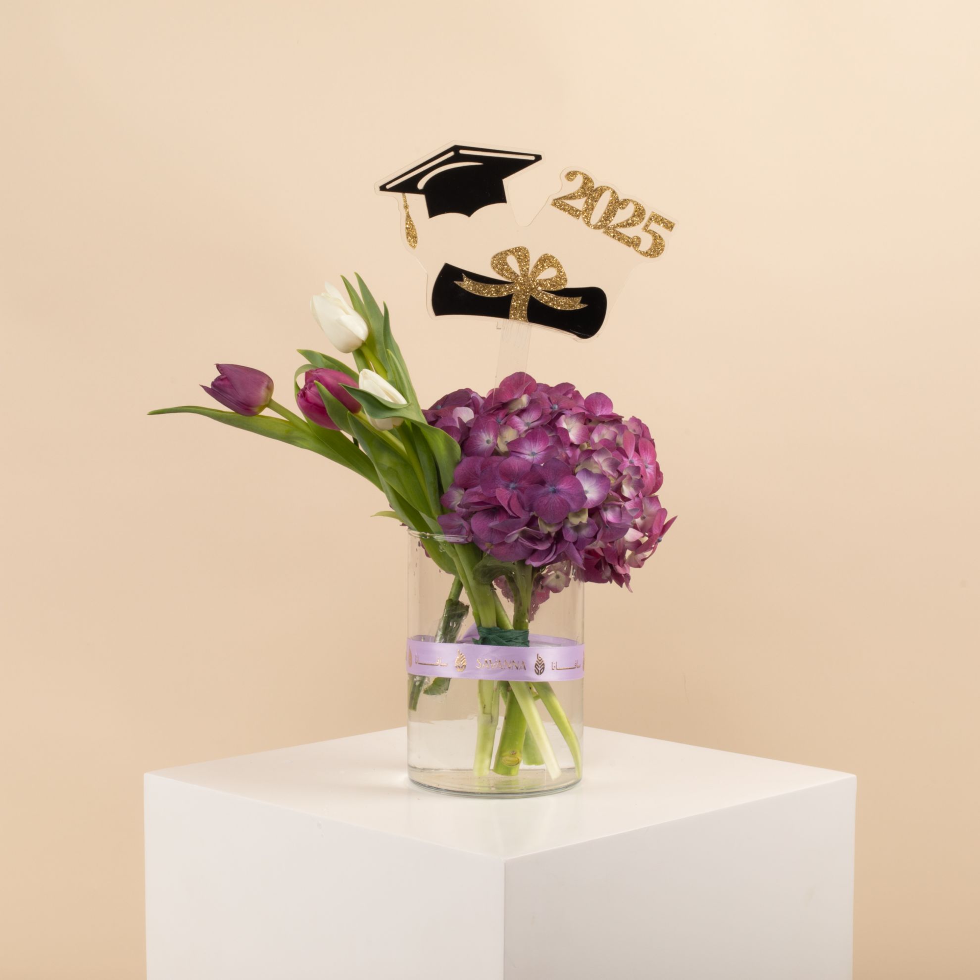 Celebrate graduation with our Glass Vase featuring Purple Hydrangeas, White Tulips, and Purple Tulips! This stunning arrangement symbolizes success, beauty, and new beginnings. A perfect gift to add elegance and color to their special day. Order now and make their graduation unforgettable!