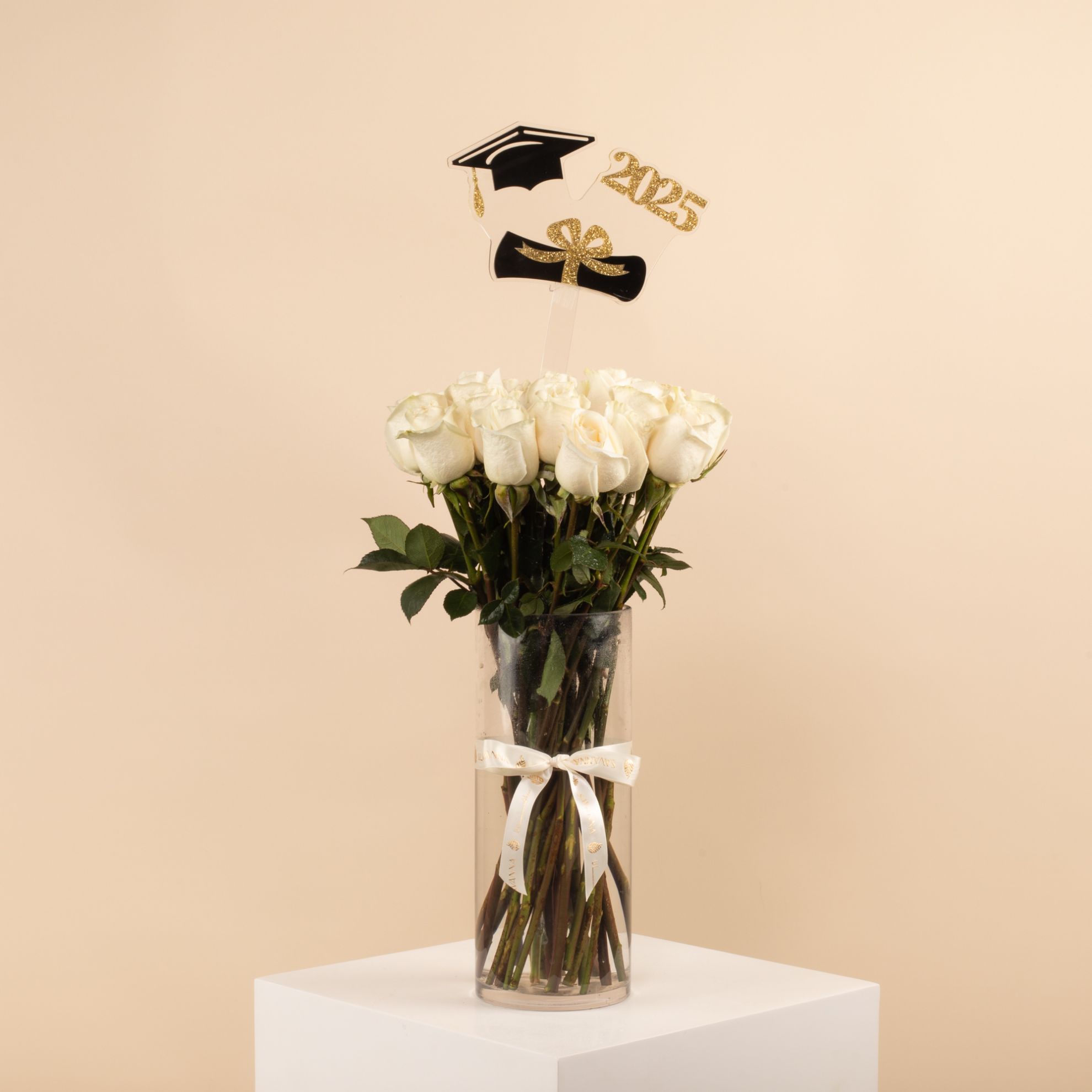 Celebrate graduation with our Glass Vase featuring 25 White Roses! This elegant arrangement symbolizes purity, success, and new beginnings. A perfect gift to mark their special achievement with beauty and grace. Order now and make their graduation unforgettable!