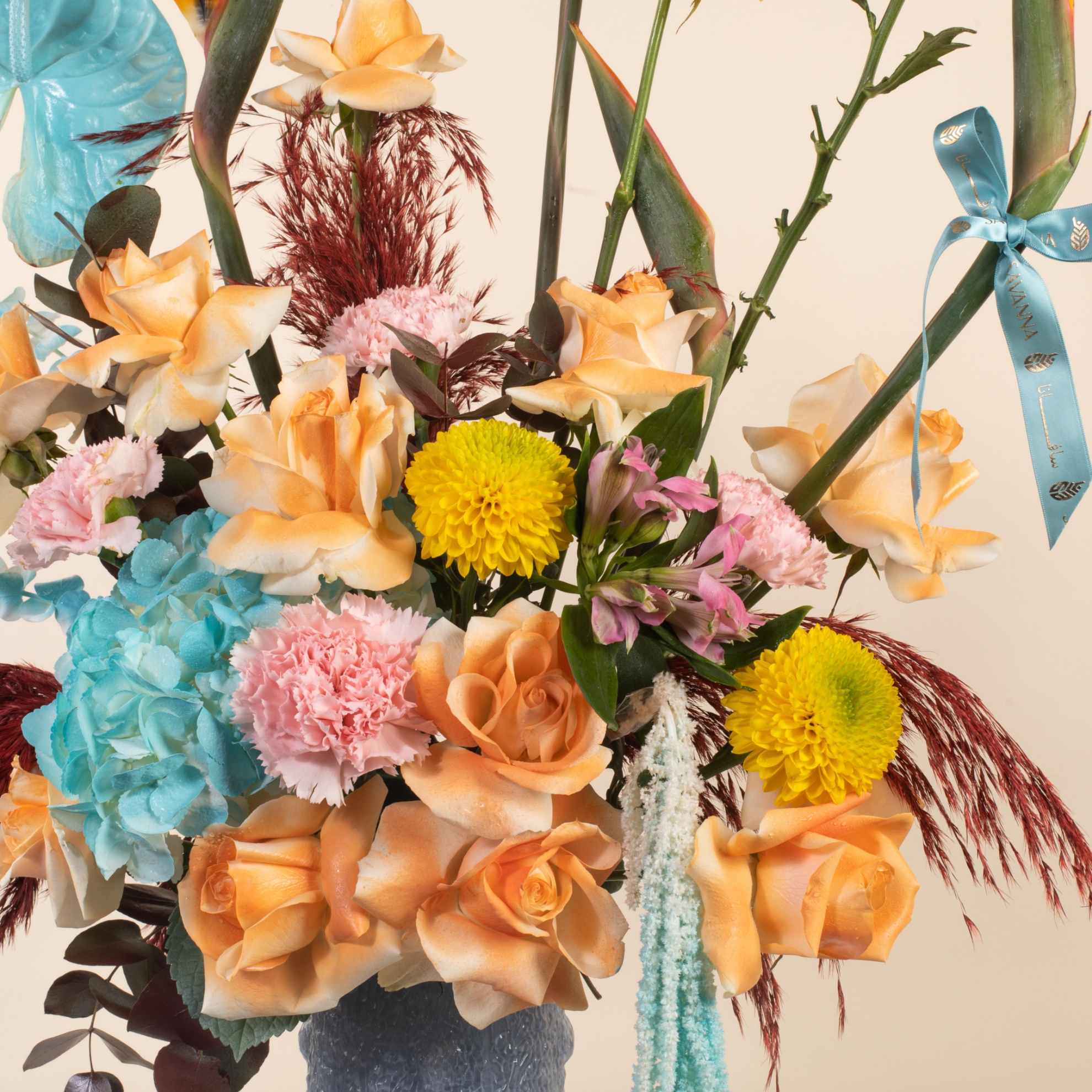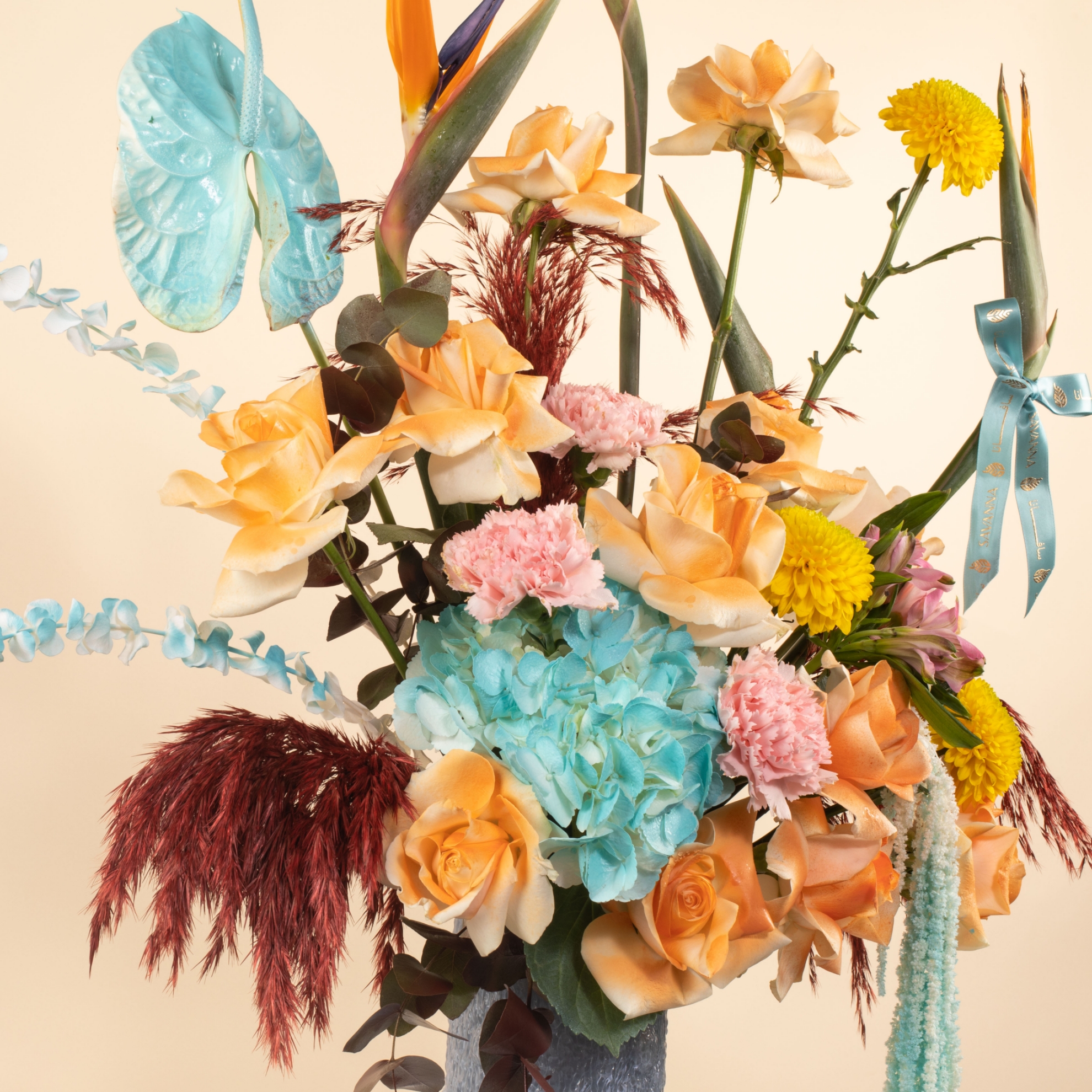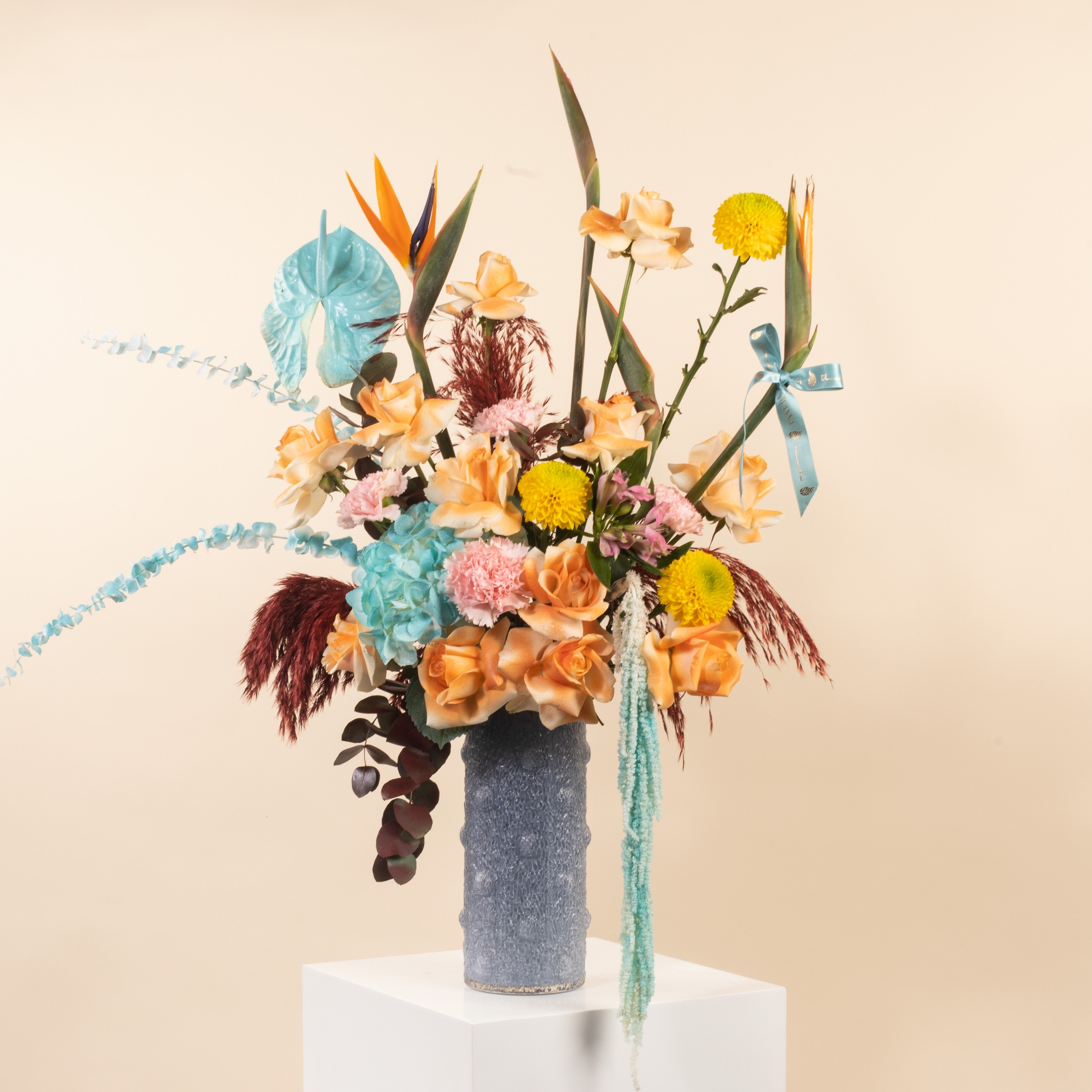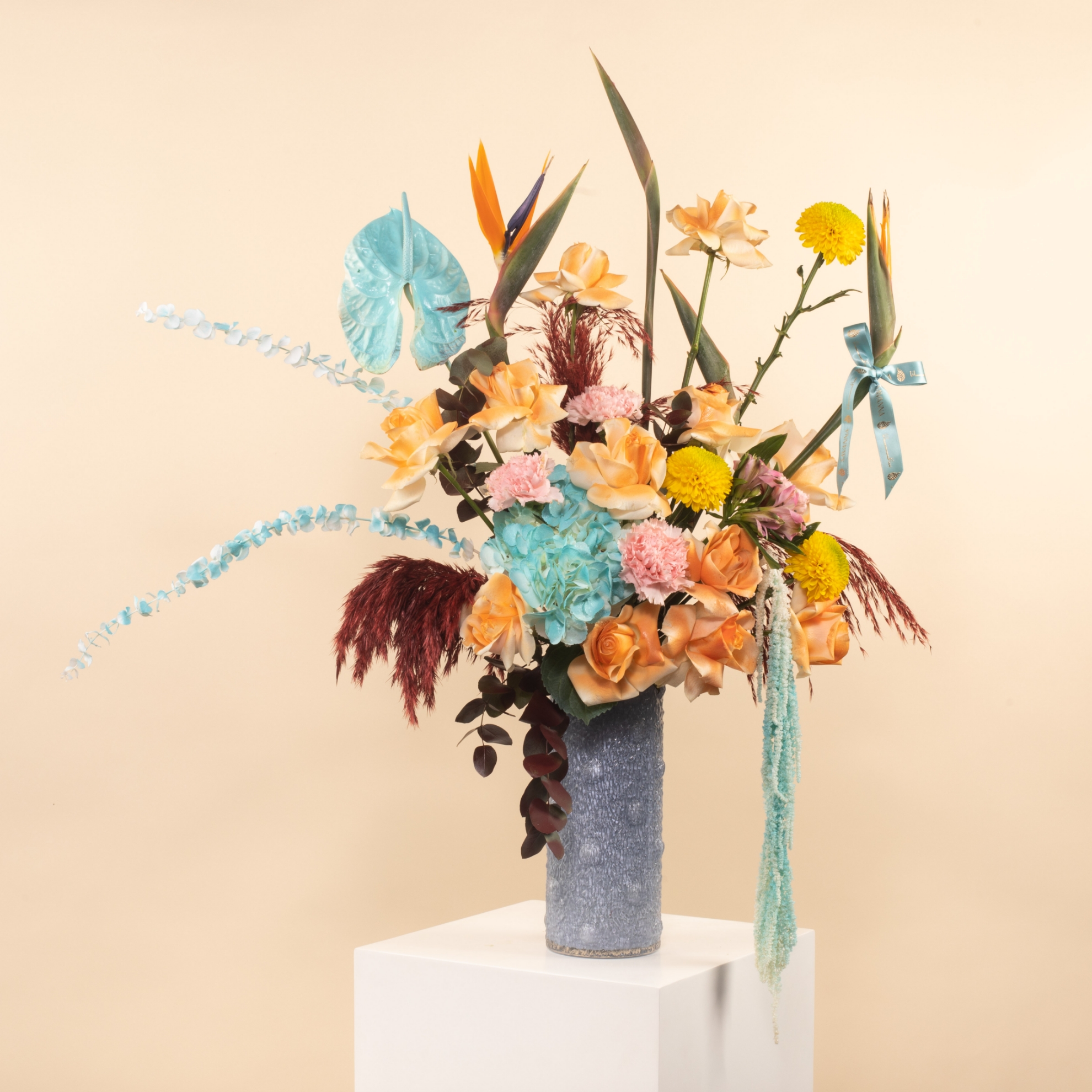 The Grand Elegance Flowers Vase features a luxurious mix of anthurium, amaranthus, bird of paradise, hydrangea, pampas, yellow deco, peach roses, pink carnations, eucalyptus, all beautifully arranged in an elegant vase—perfect for grand occasions