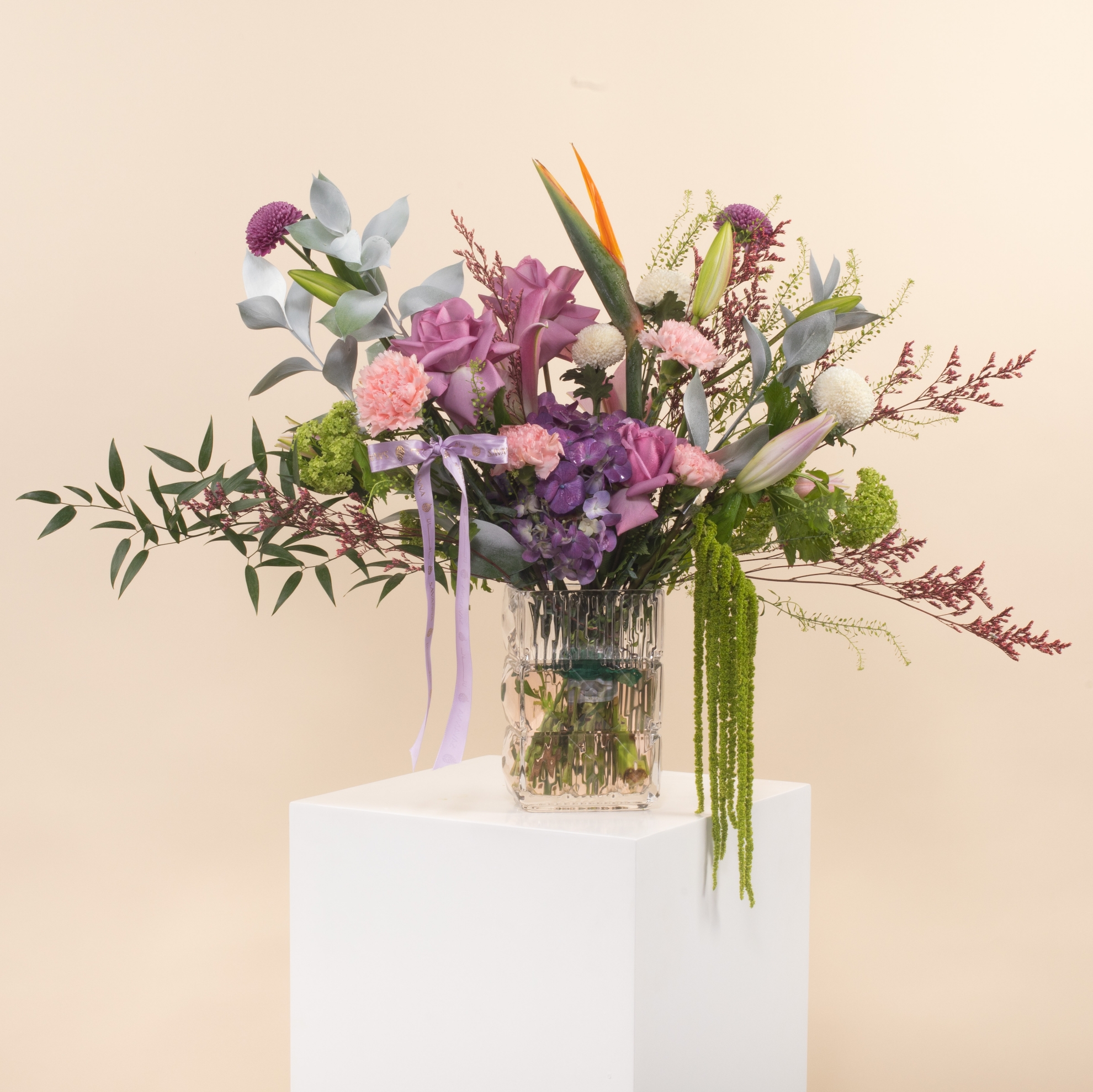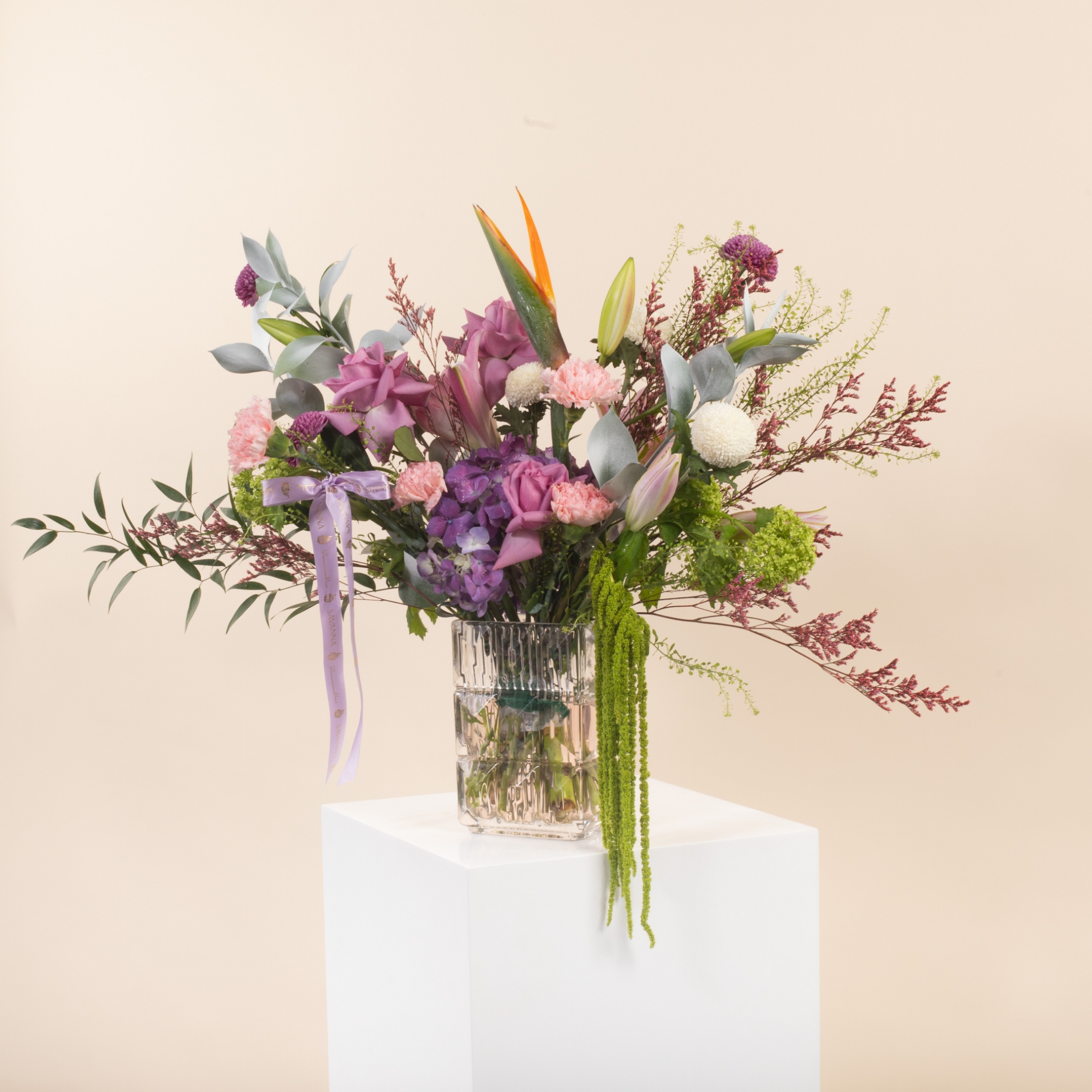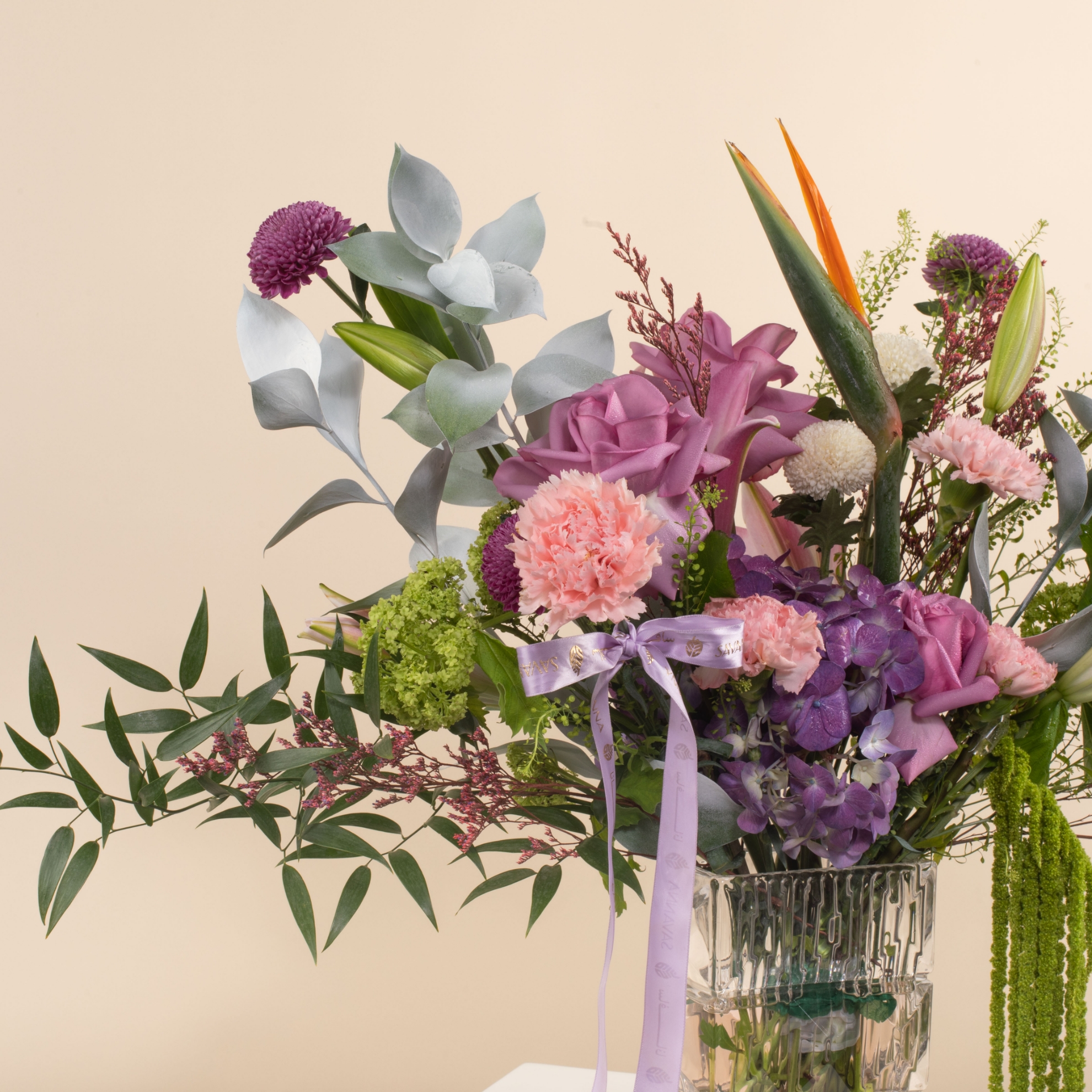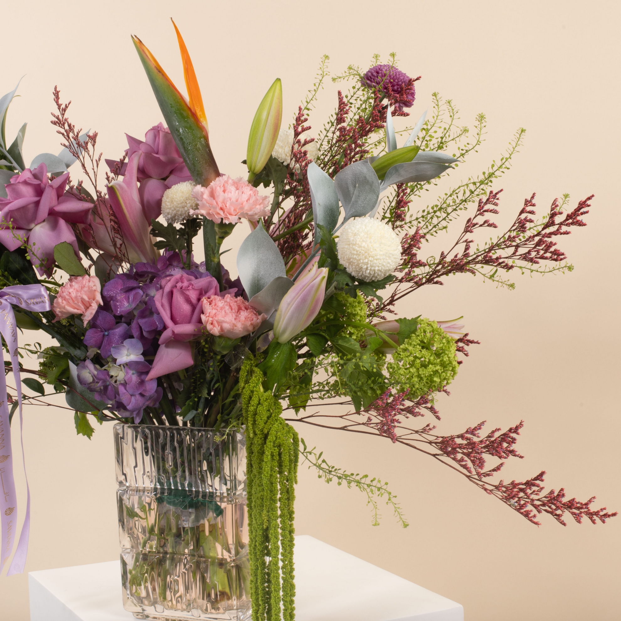 The Premium Glass Flowers Vase features an exquisite mix of bird of paradise, purple roses, pink lilies, purple hydrangea and limonium, white deco, ruscus, Italian ruscus, amaranthus, green bell, and pink carnations. A lush and elegant floral statement