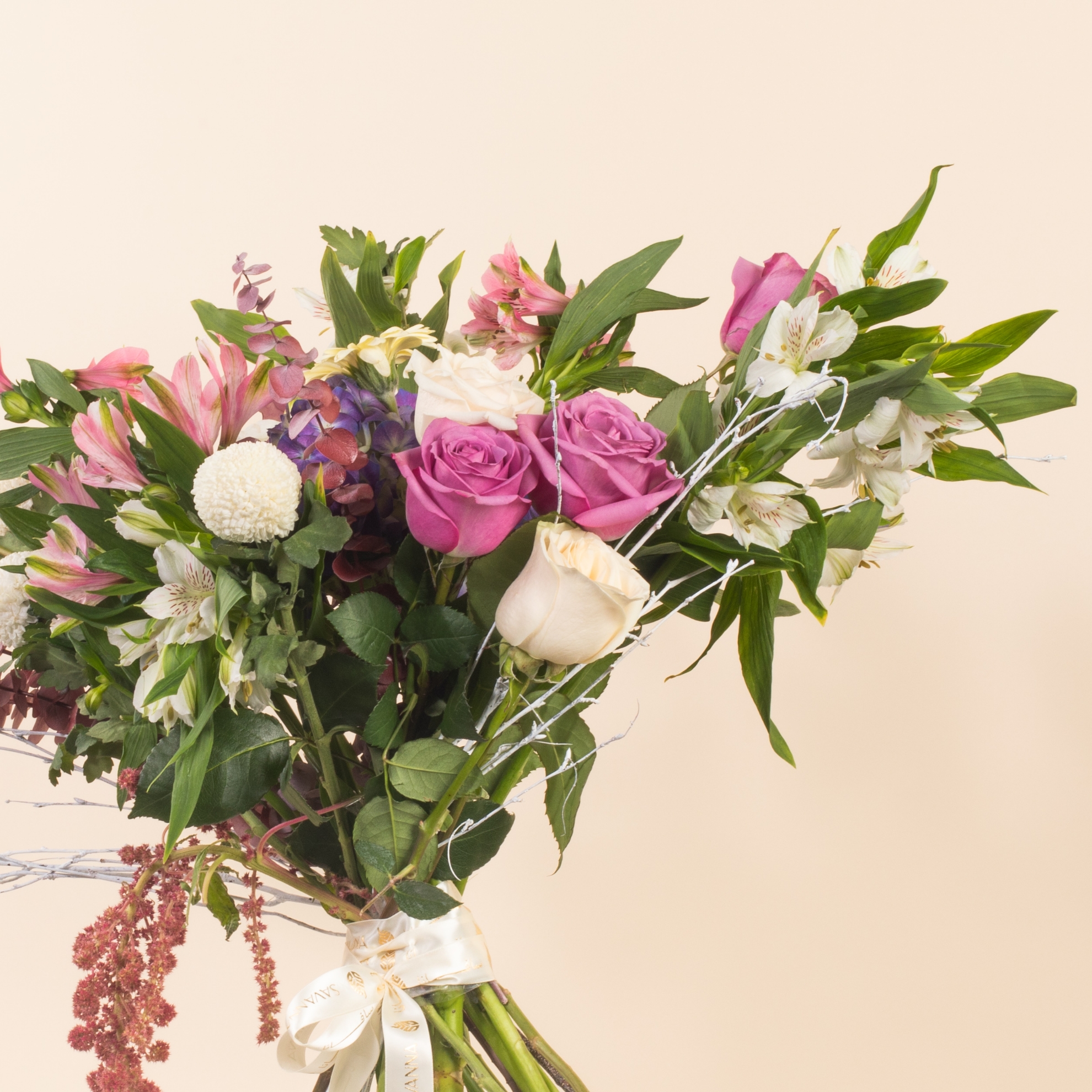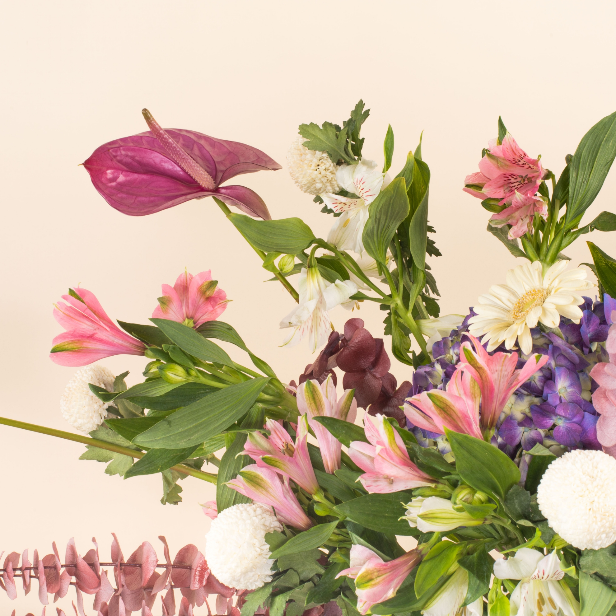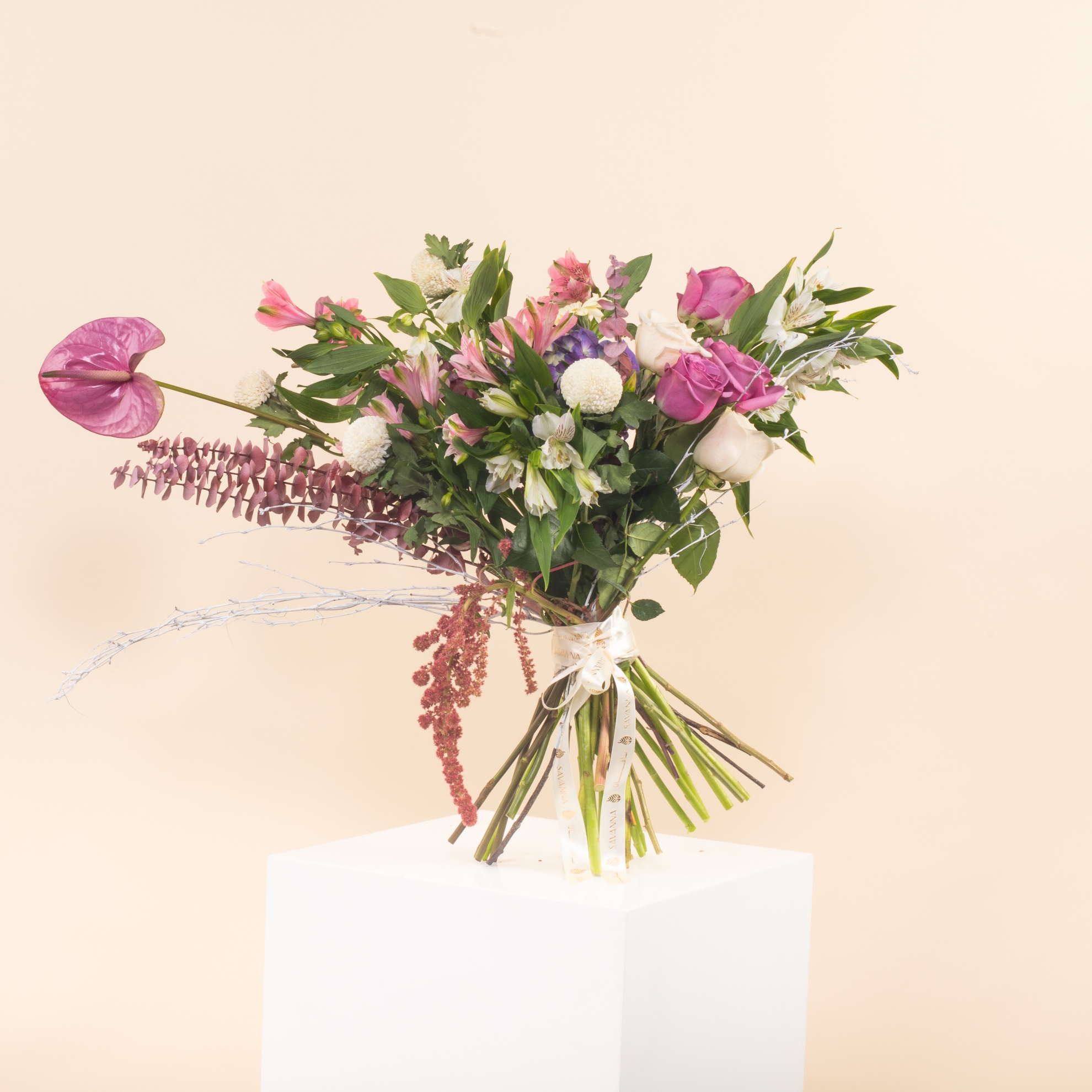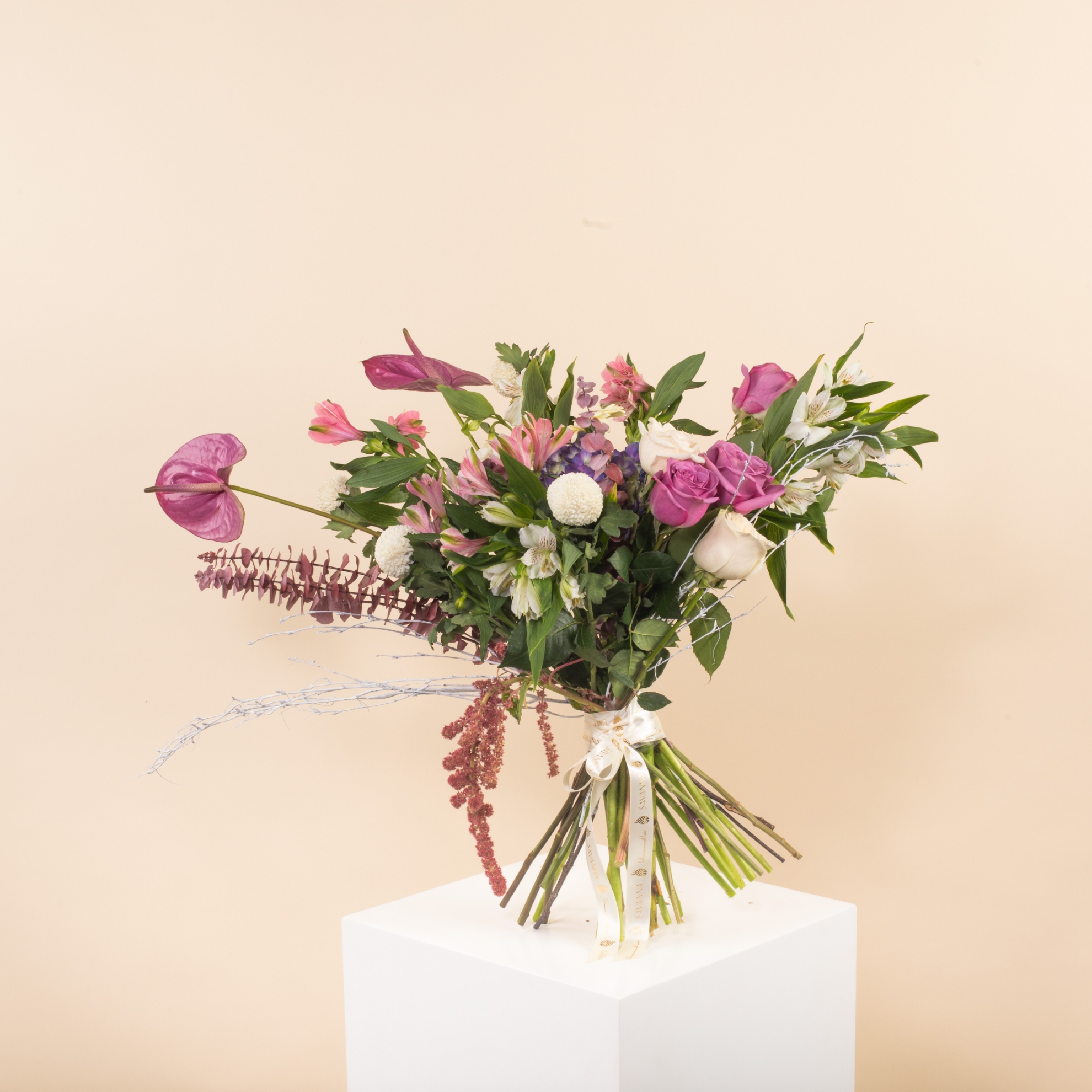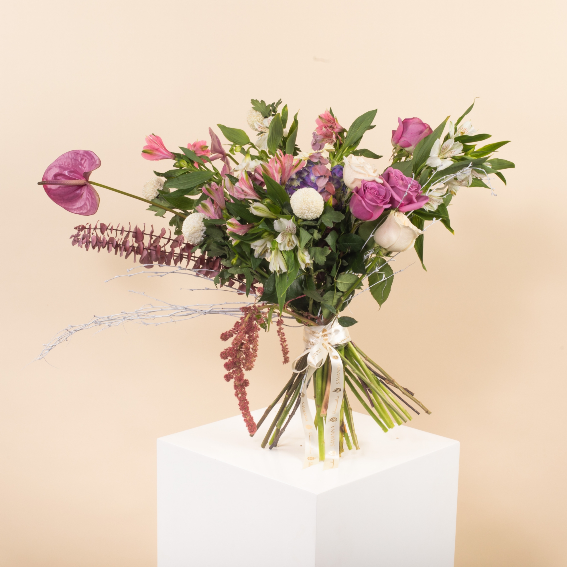 Elevate every occasion with our premium flower bouquet—featuring Anthurium, Purple Roses, Hydrangea, Alstroemeria, Amaranthus, White Roses, Deco White, and Eucalyptus. A luxurious blend of vibrant purples, soft whites, and romantic reds—perfect for gifting or decor