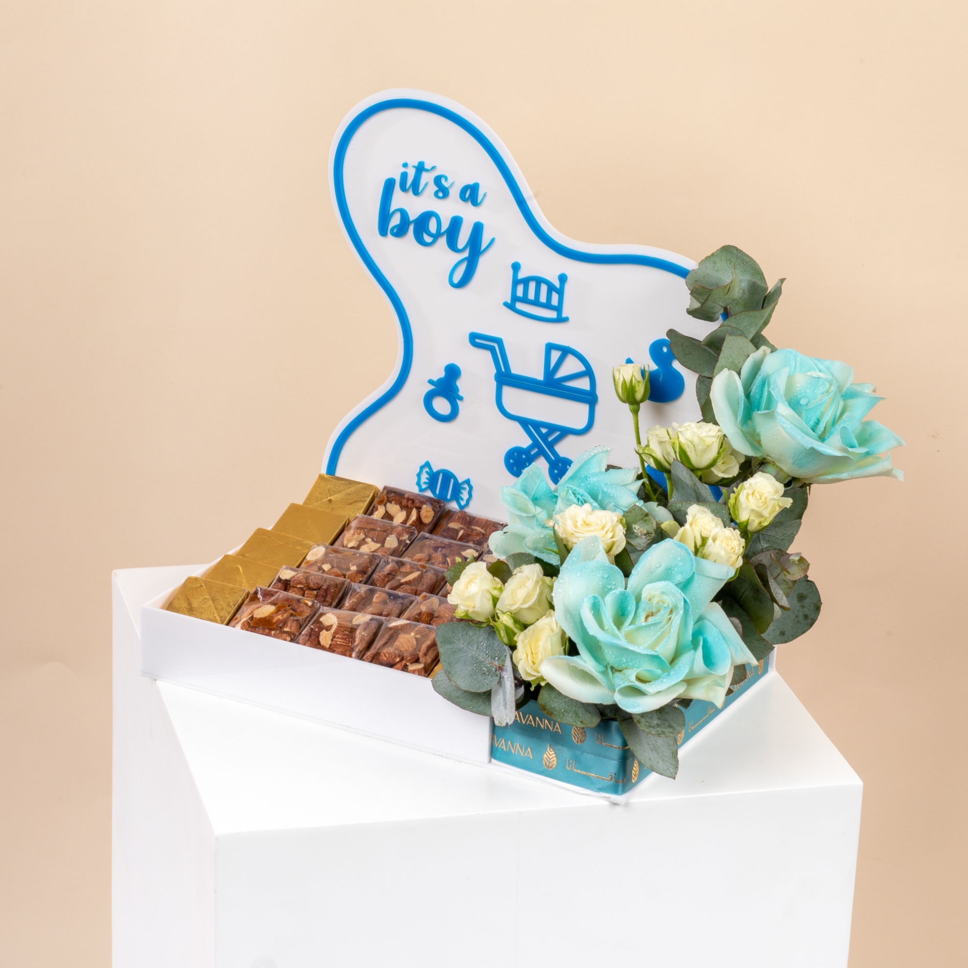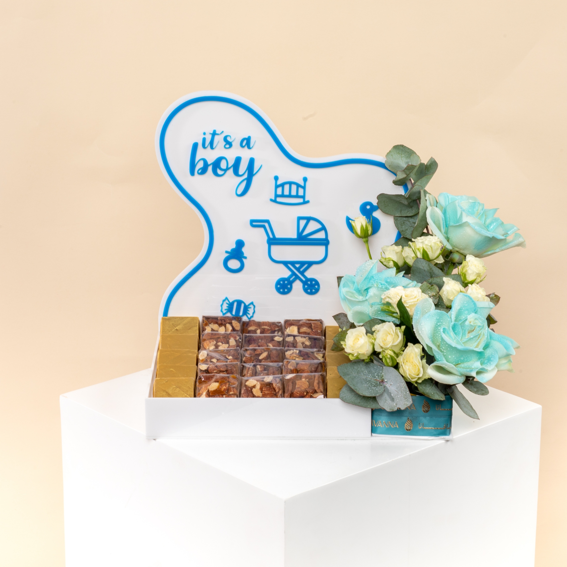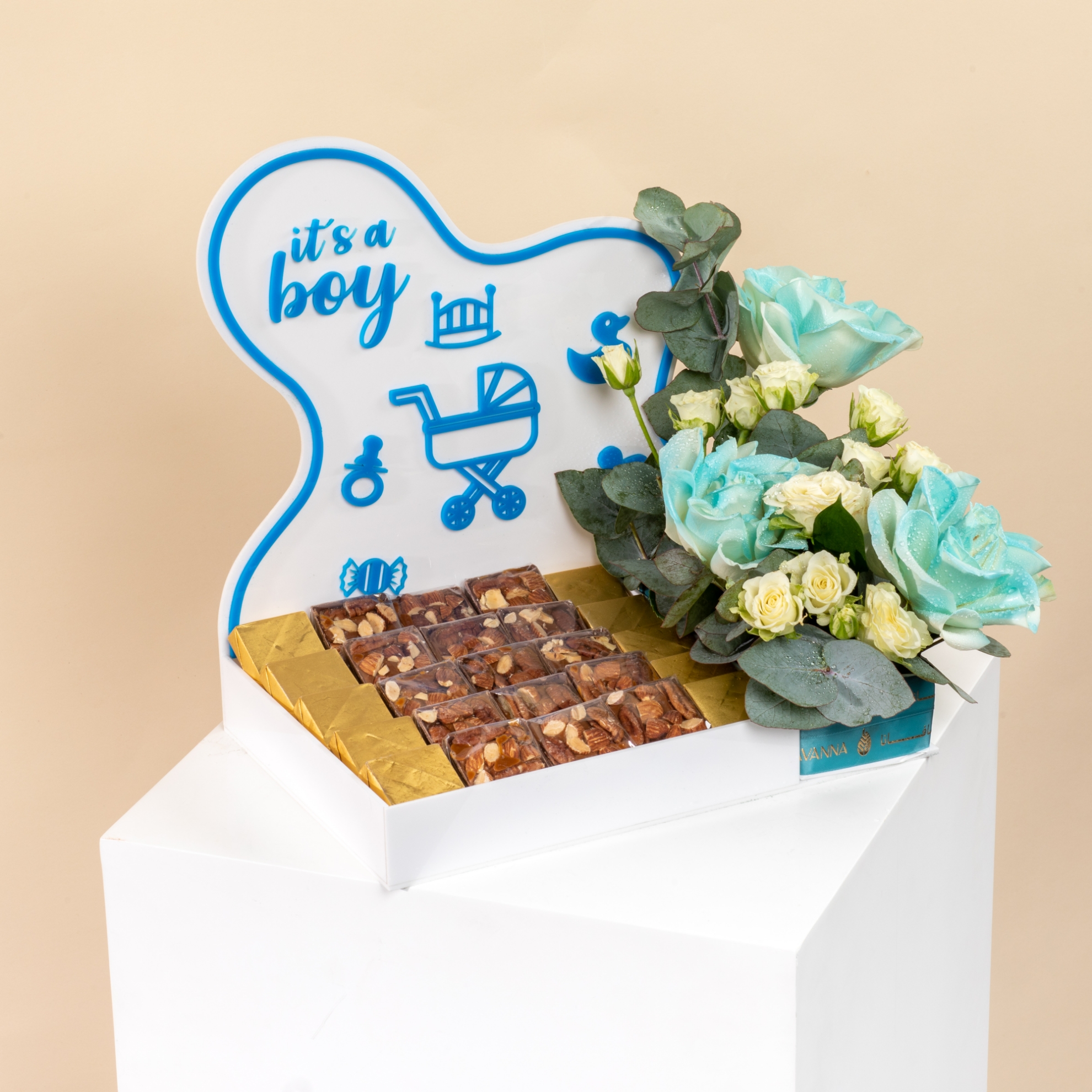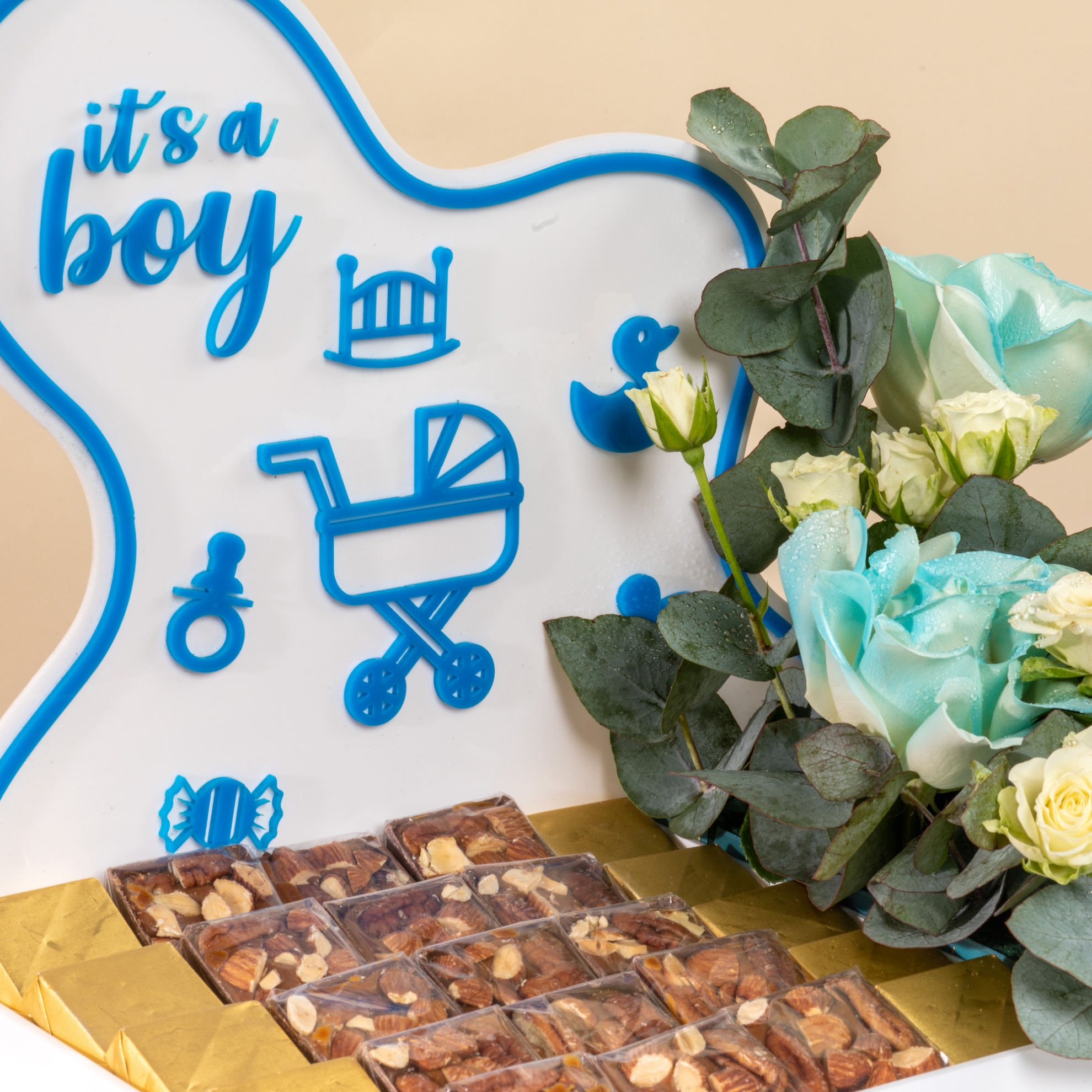 Celebrate your baby boy with our 'It's a Boy' Chocolate Tray – 25 pieces of smooth milk chocolate filled with mixed nuts and coconut, beautifully decorated with white roses and baby white roses. A sweet and elegant gesture to welcome your little prince!