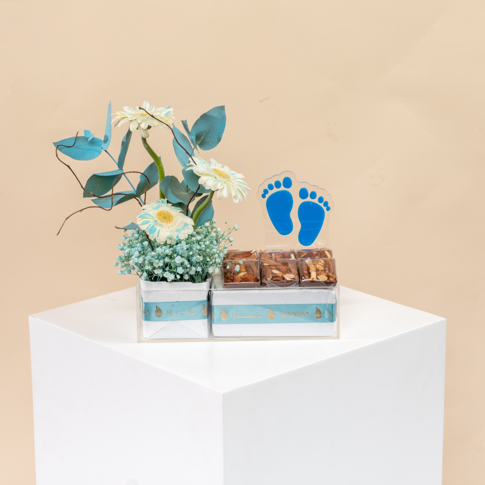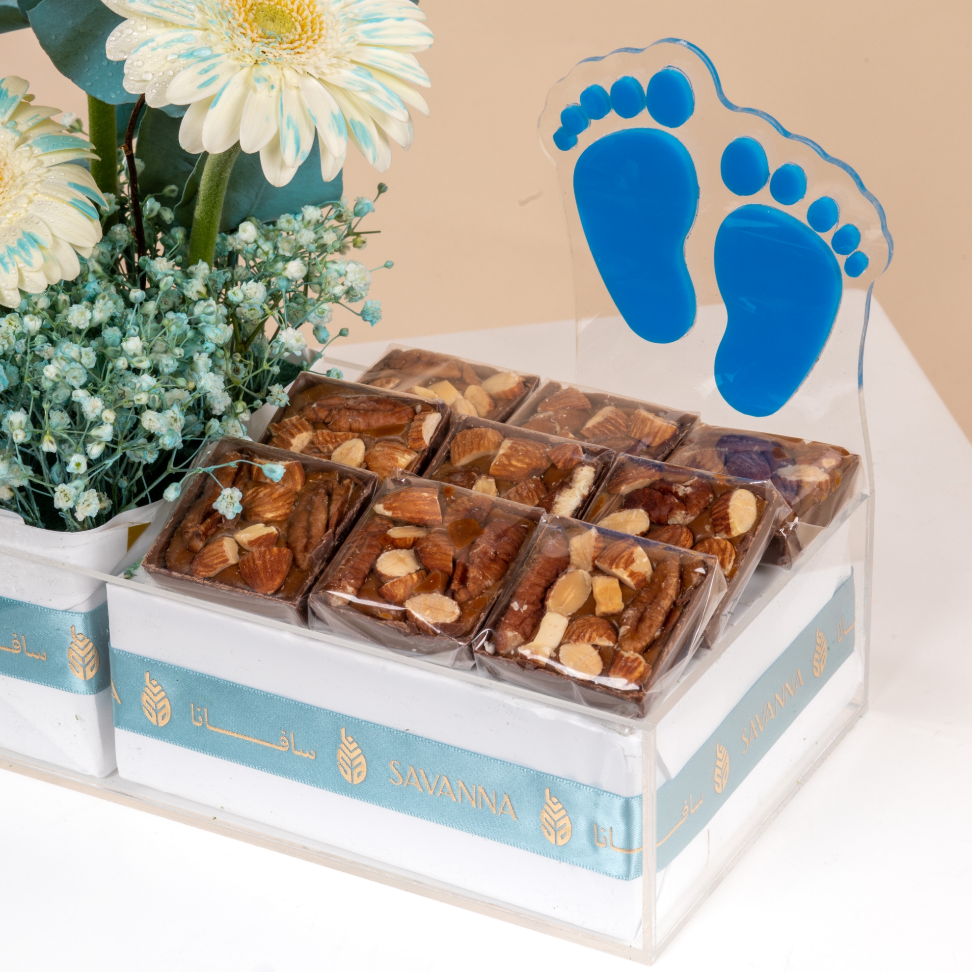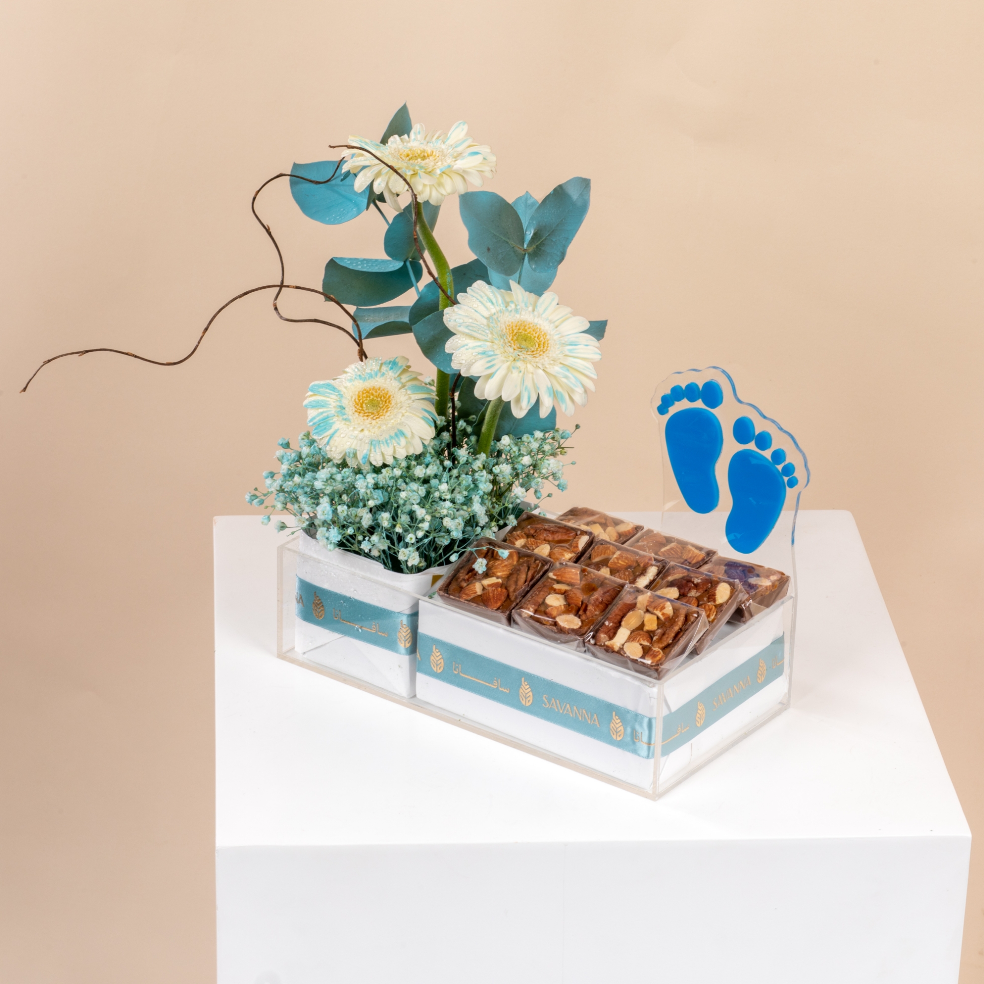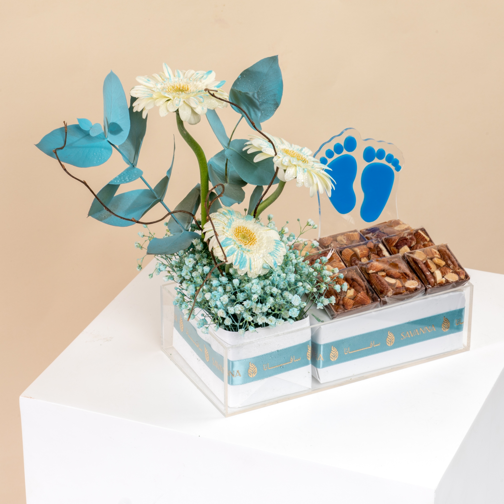 Welcome your baby boy with our elegant 'It's a Boy' Chocolate Tray – 9 pieces of premium chocolate, beautifully arranged with white gerbera, gypsophila, and eucalyptus. A sweet and stylish gift to celebrate the newest addition!"