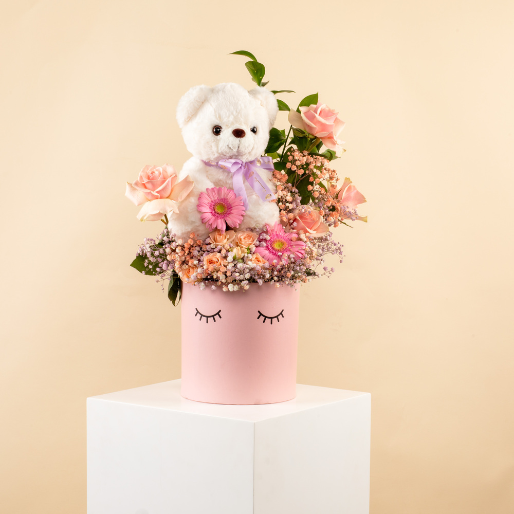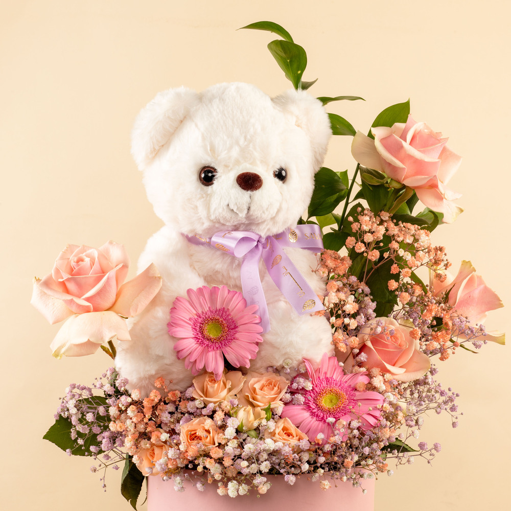 Make someone smile with our Pink Flowers Box – a lovely mix of pink roses, pink gerberas, and pink gypso, paired with an adorable white teddy bear. A sweet and charming gift for any occasion. Now available on our e-commerce platform!"