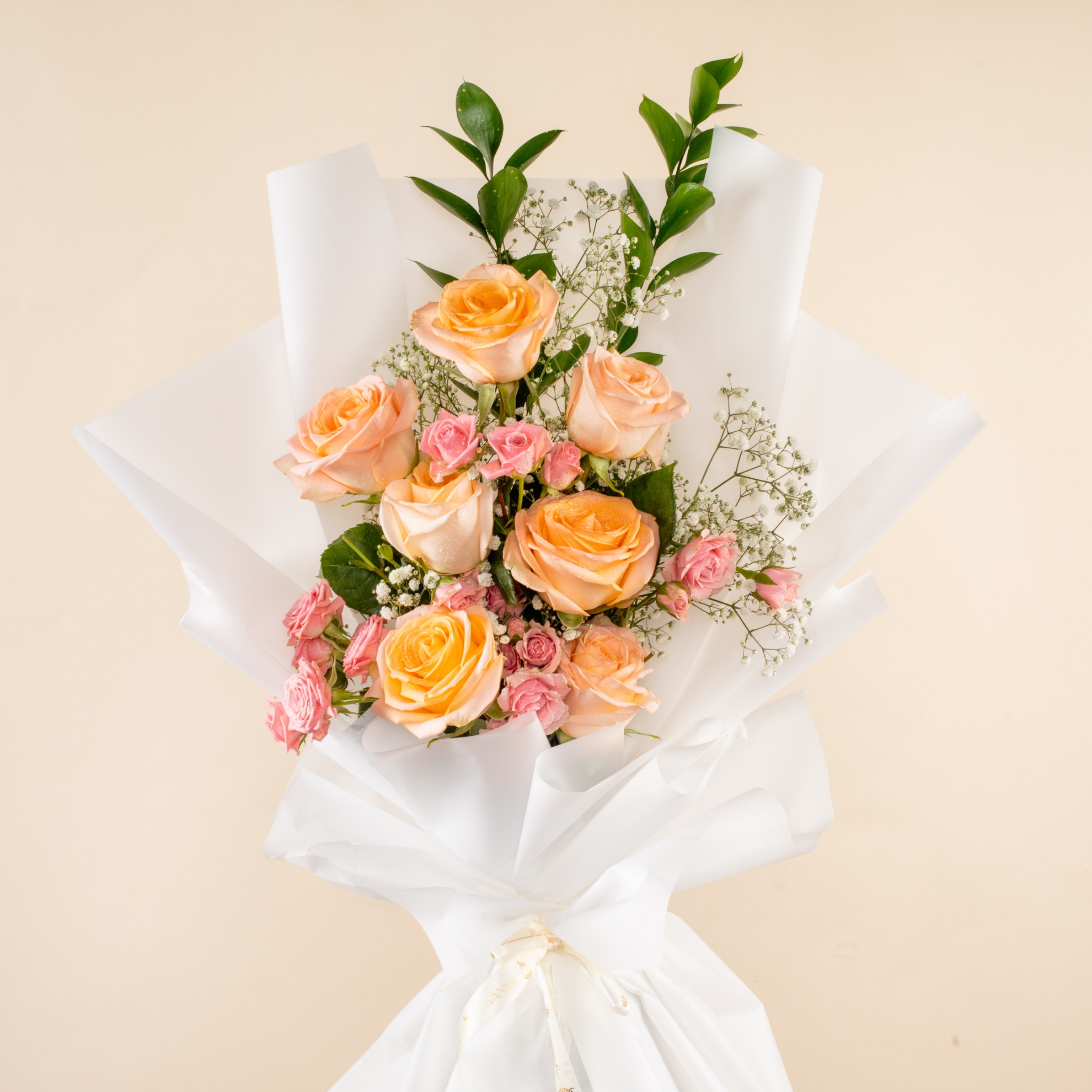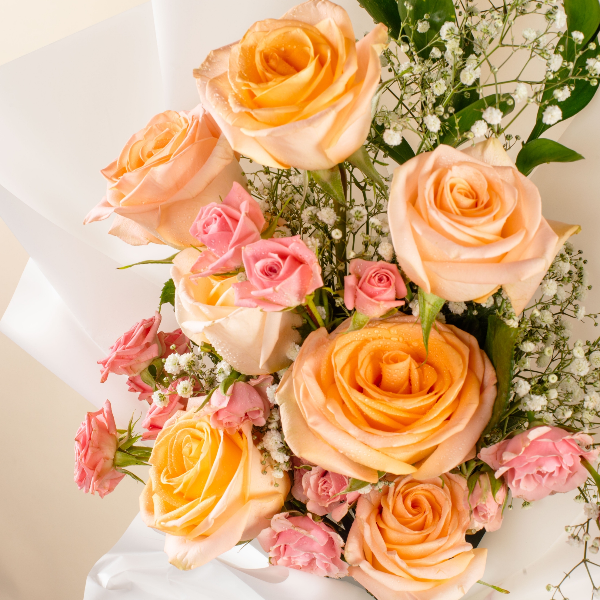 Pink Peach Harmony Hand BouquetA delicate blend of peach roses and pink baby roses, wrapped in elegant white. A soft and graceful bouquet perfect for heartfelt moments.