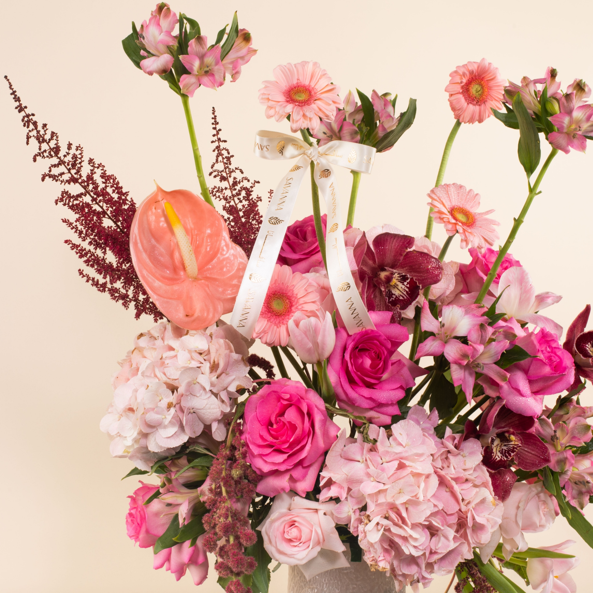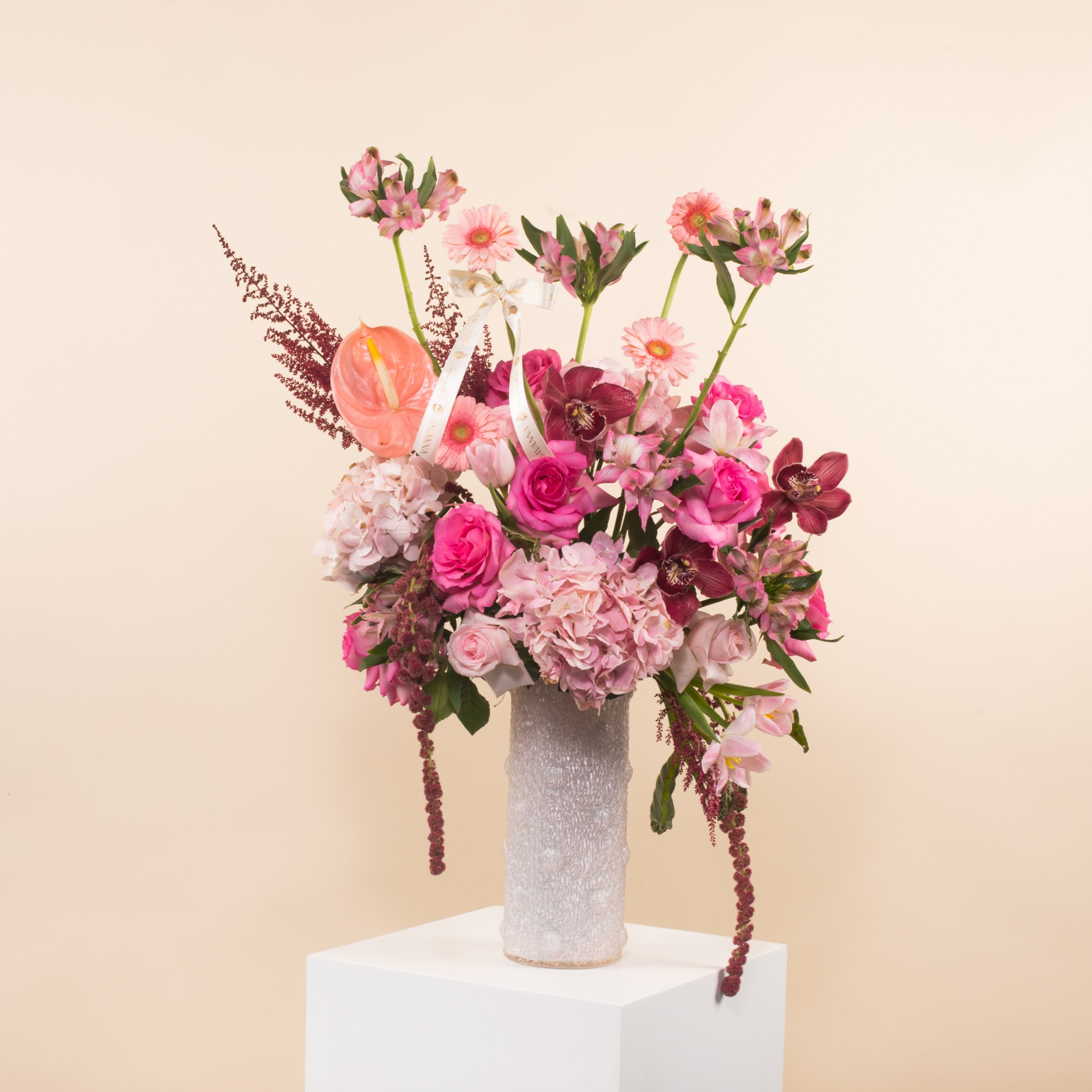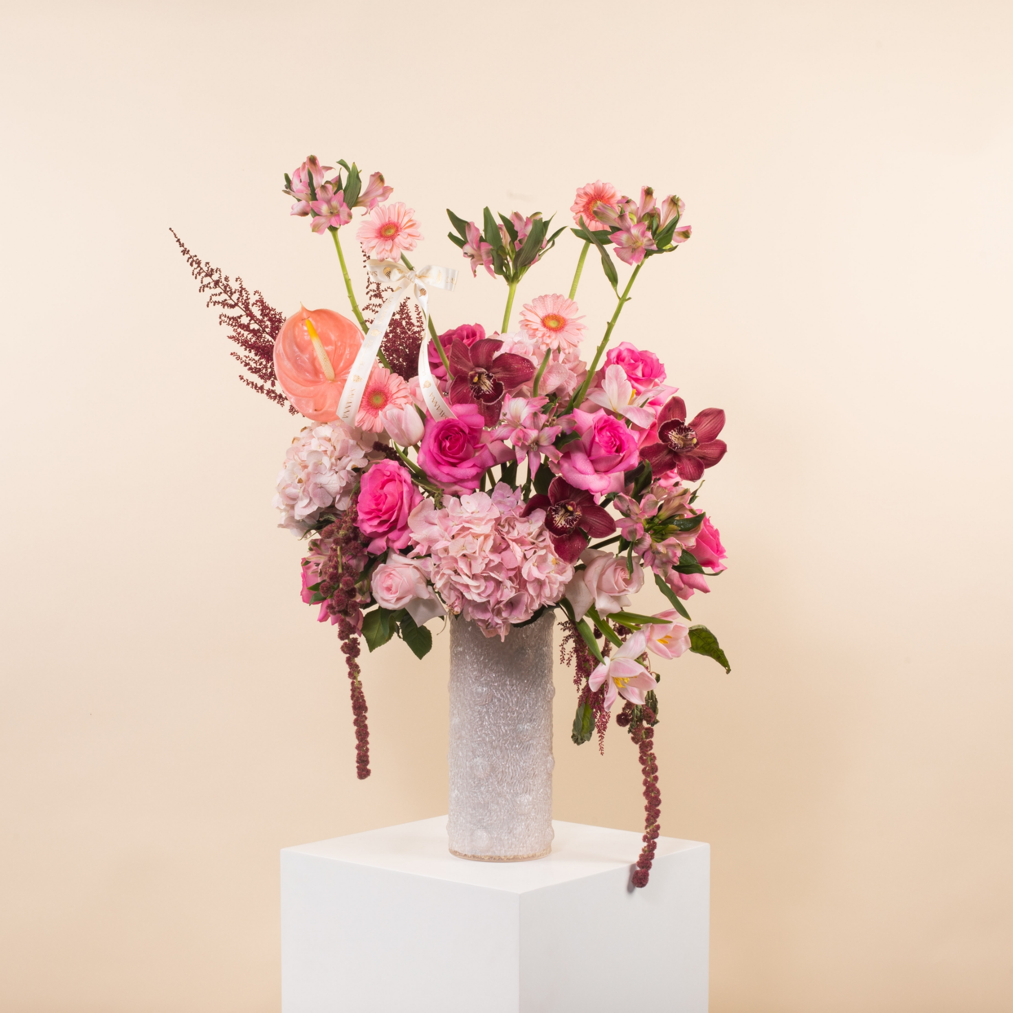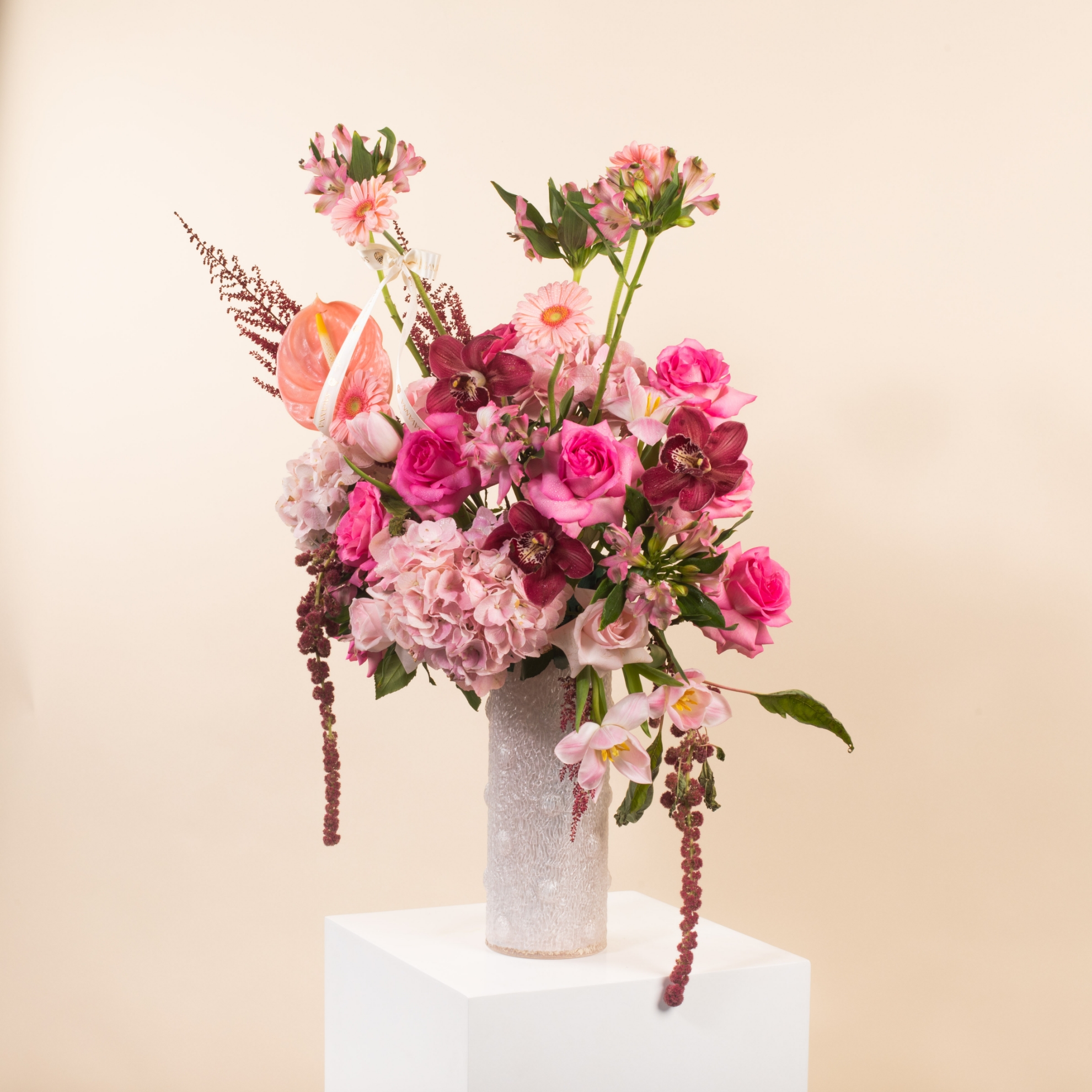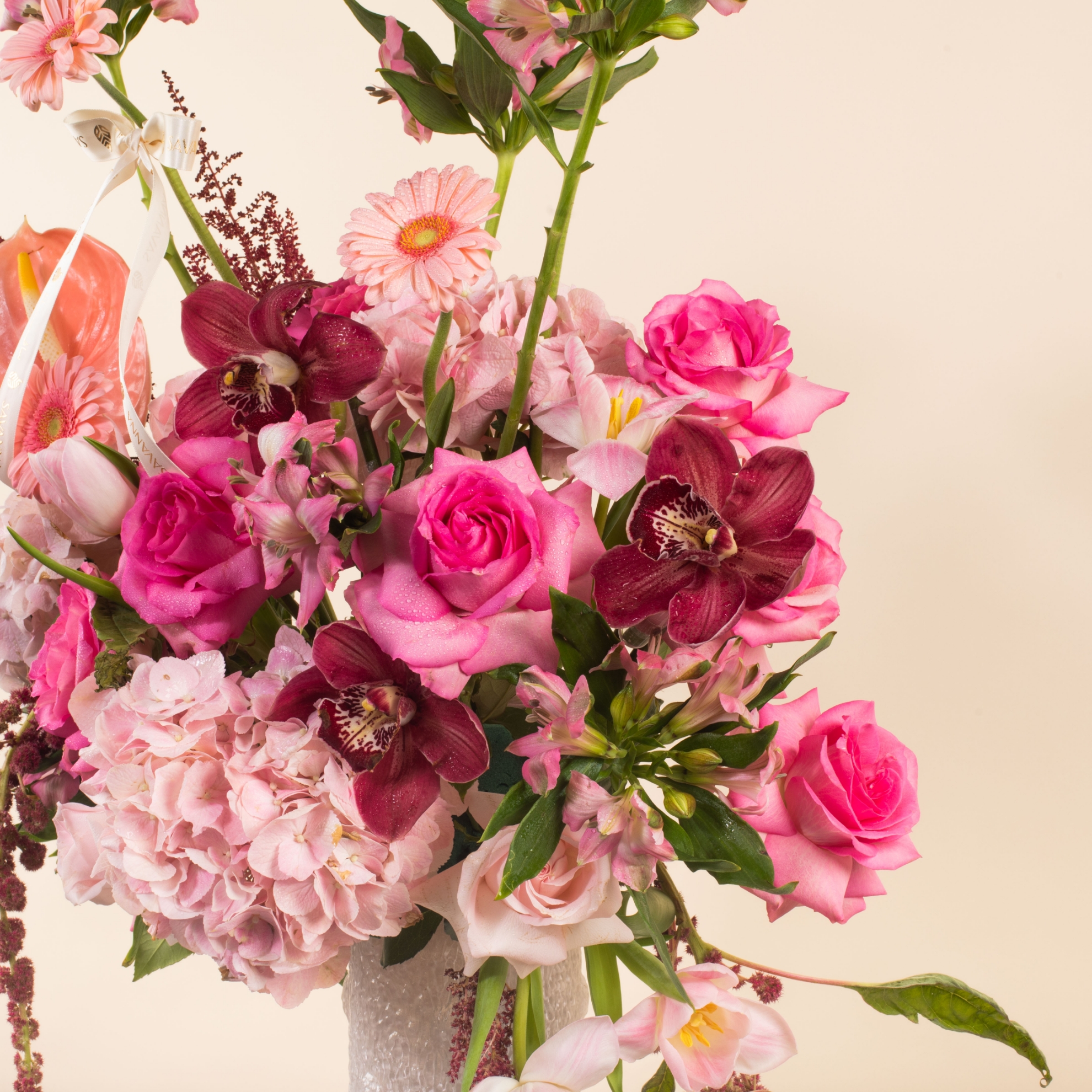 The Luxury Glass Vase blooms with elegance—featuring pink anthurium, hydrangea, tulips, gerbera, alstroemeria, pink and fuchsia roses, red amaranthus, purple cymbidium, astilbe, and more. A graceful statement piece in every petal
