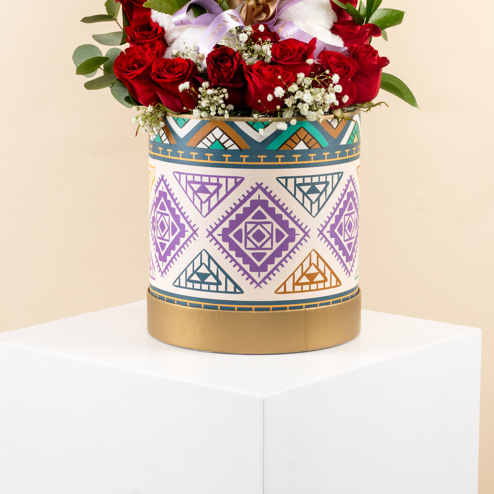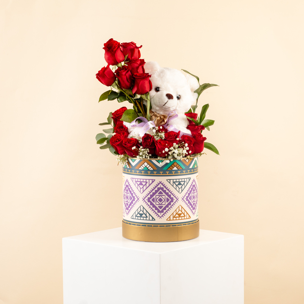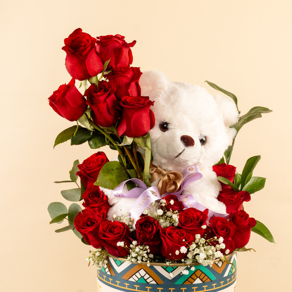 Celebrate love and warmth with our Savanna Red Flowers Box, featuring elegant red blooms paired with a cuddly Teddy Bear. A perfect gift to express affection on any occasion. Order now and spread joy!