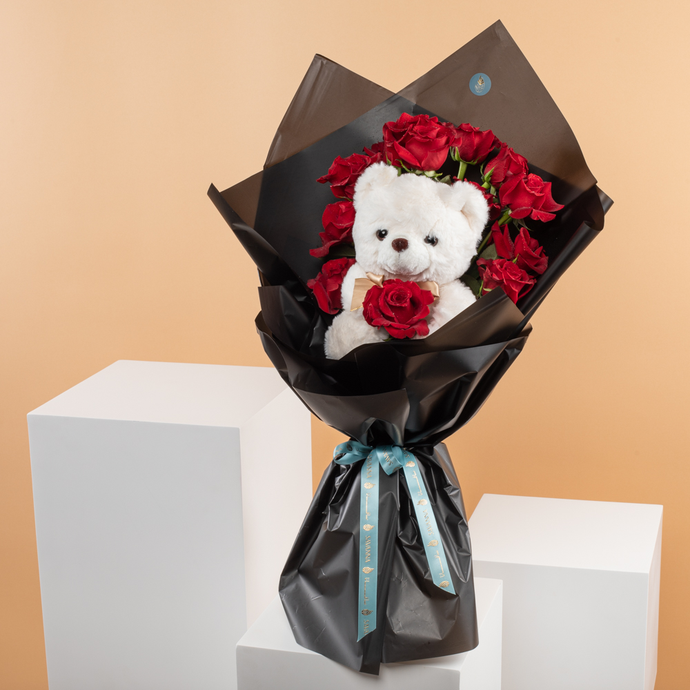 Surprise Someone Special With Savanna’S Bouquet, Featuring 10 Red Roses And A Soft Teddy Bear, All Wrapped In Elegant Black. A Perfect Gift To Express Love And Warmth. Order Now On Savanna And Make Any Occasion Unforgettable With This Charming And Thoughtful Gift!