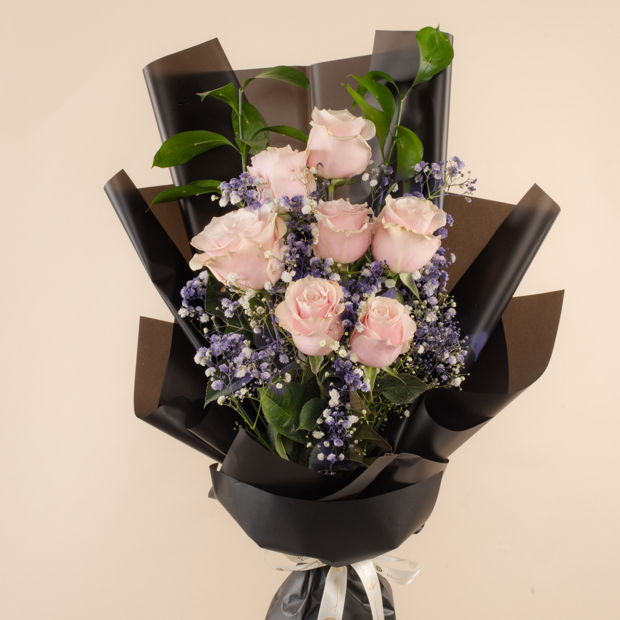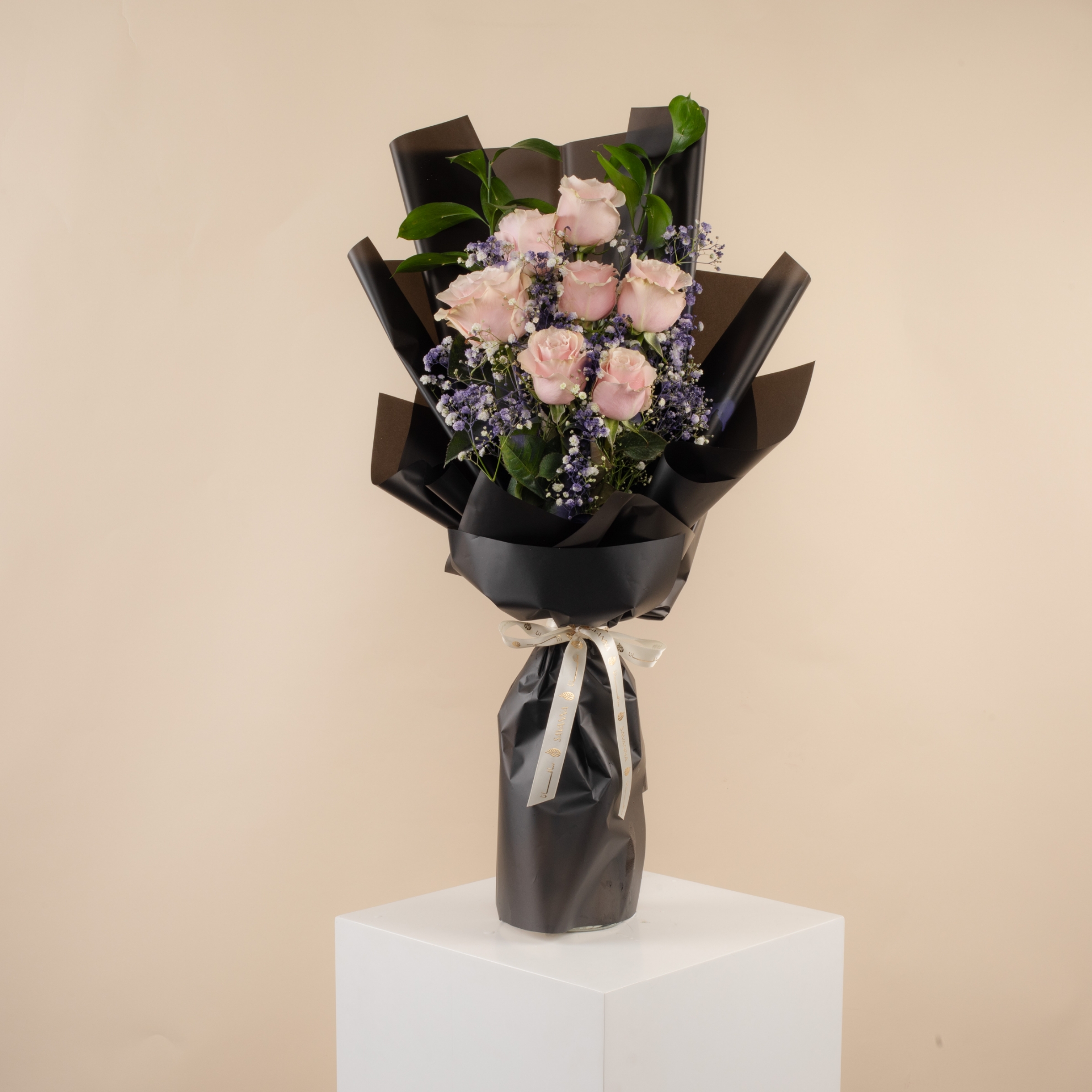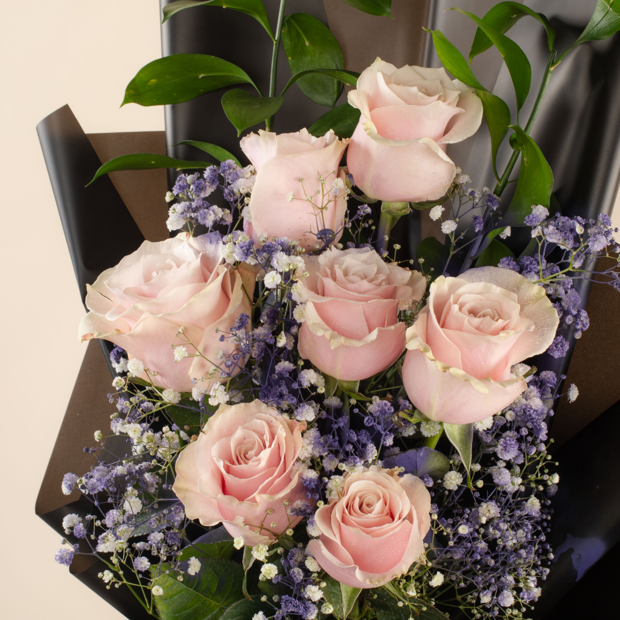 Savanna Pink Roses Bouquet | Purple GypsoA graceful bouquet featuring soft pink roses and vibrant purple gypsophila, elegantly wrapped in black. A perfect blend of charm and elegance for any occasion.