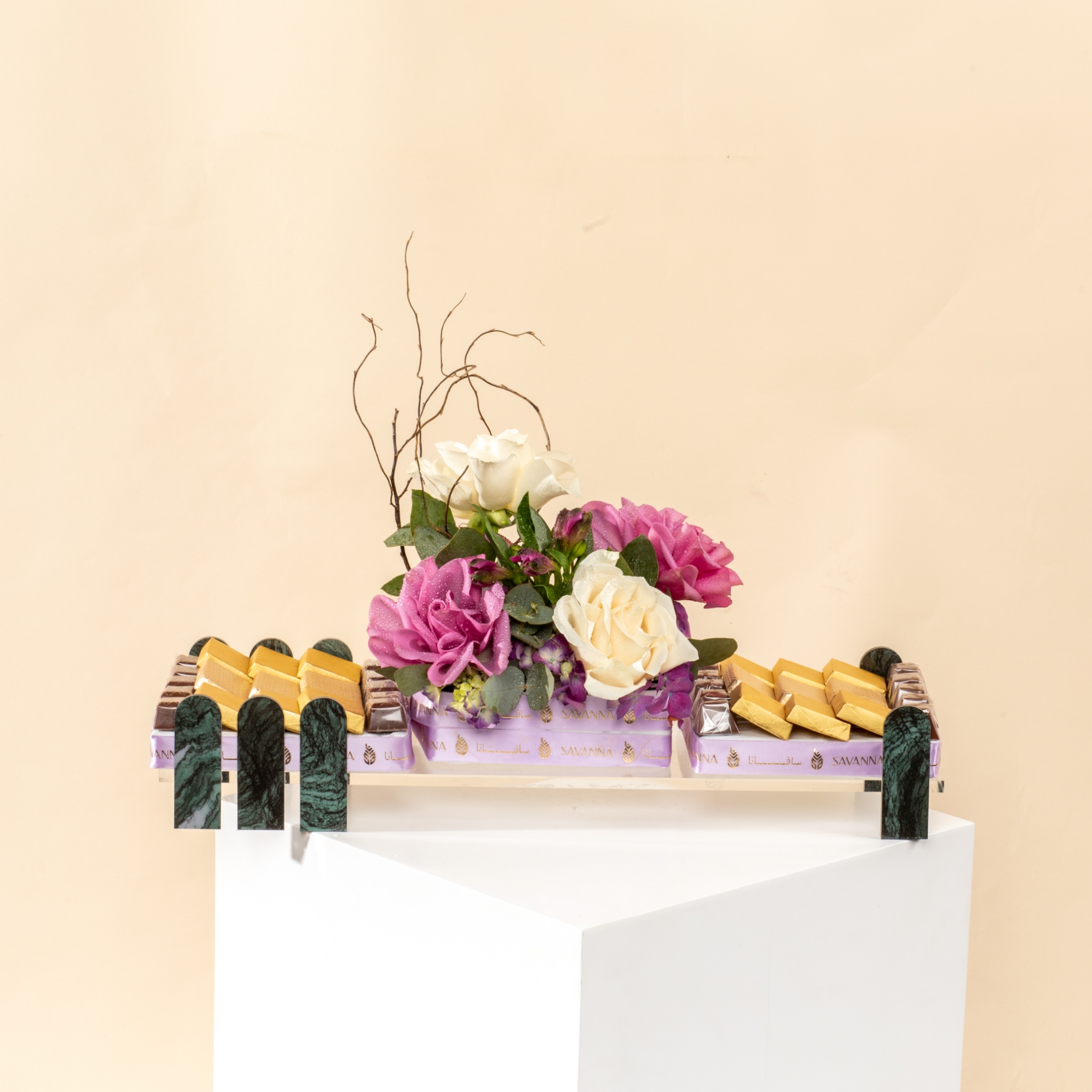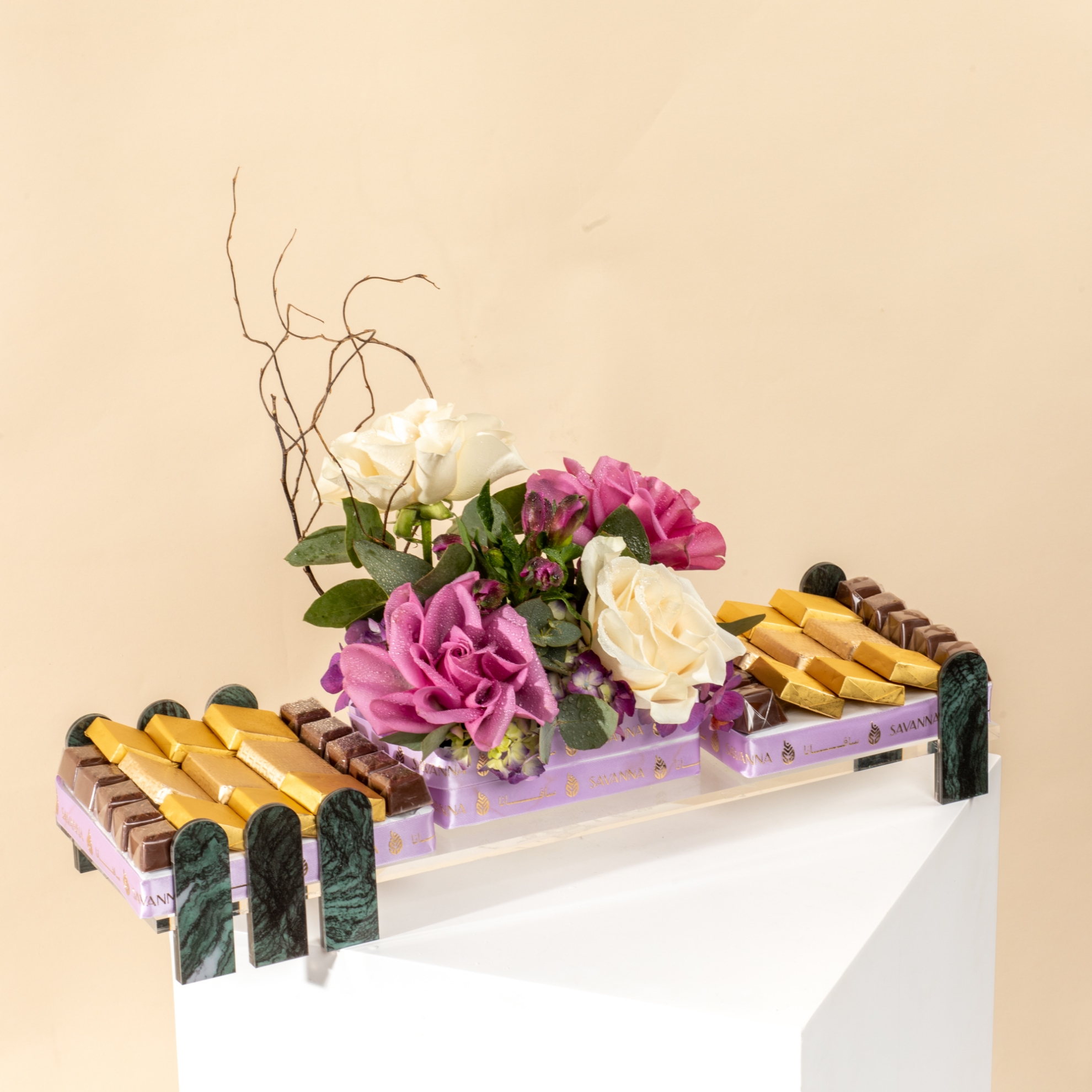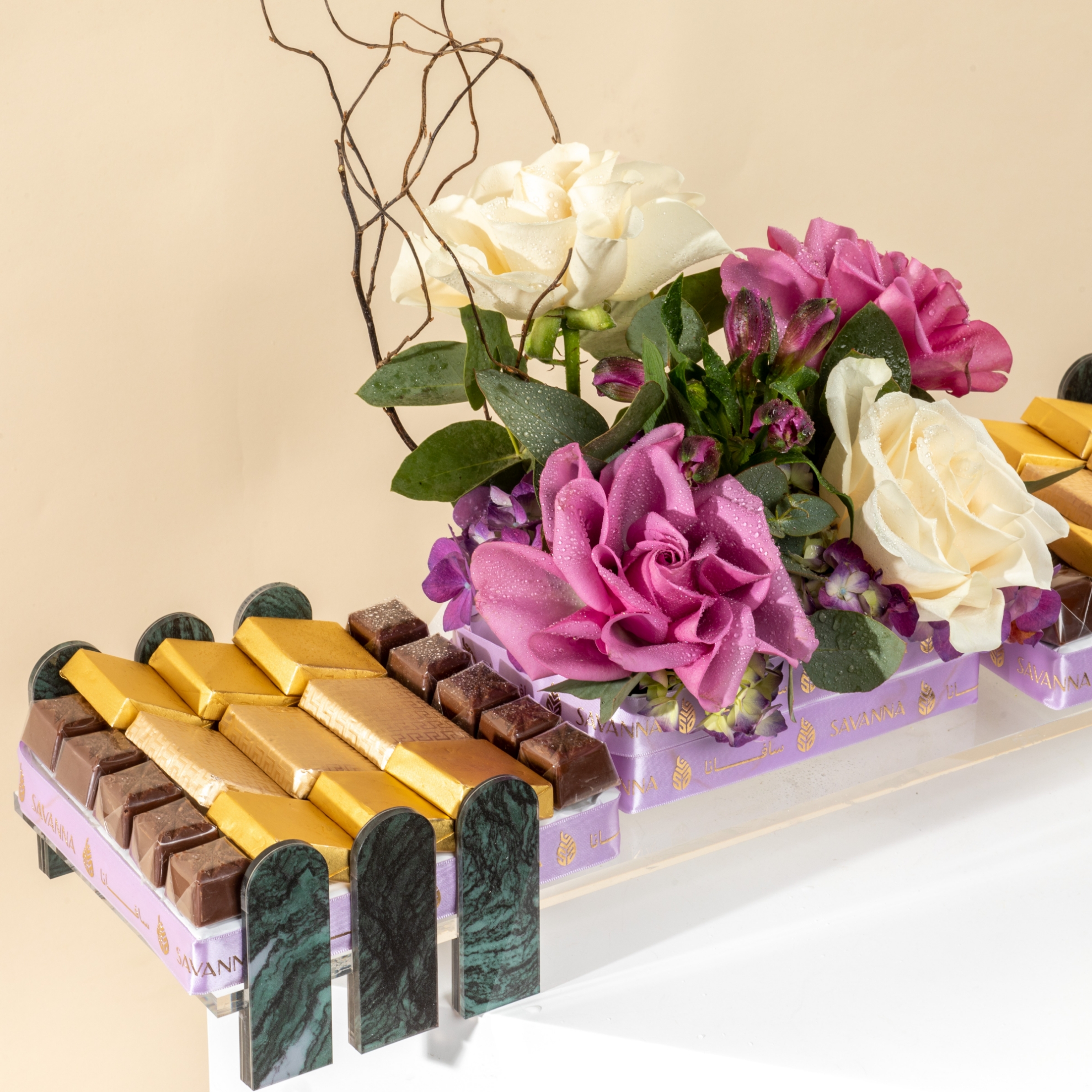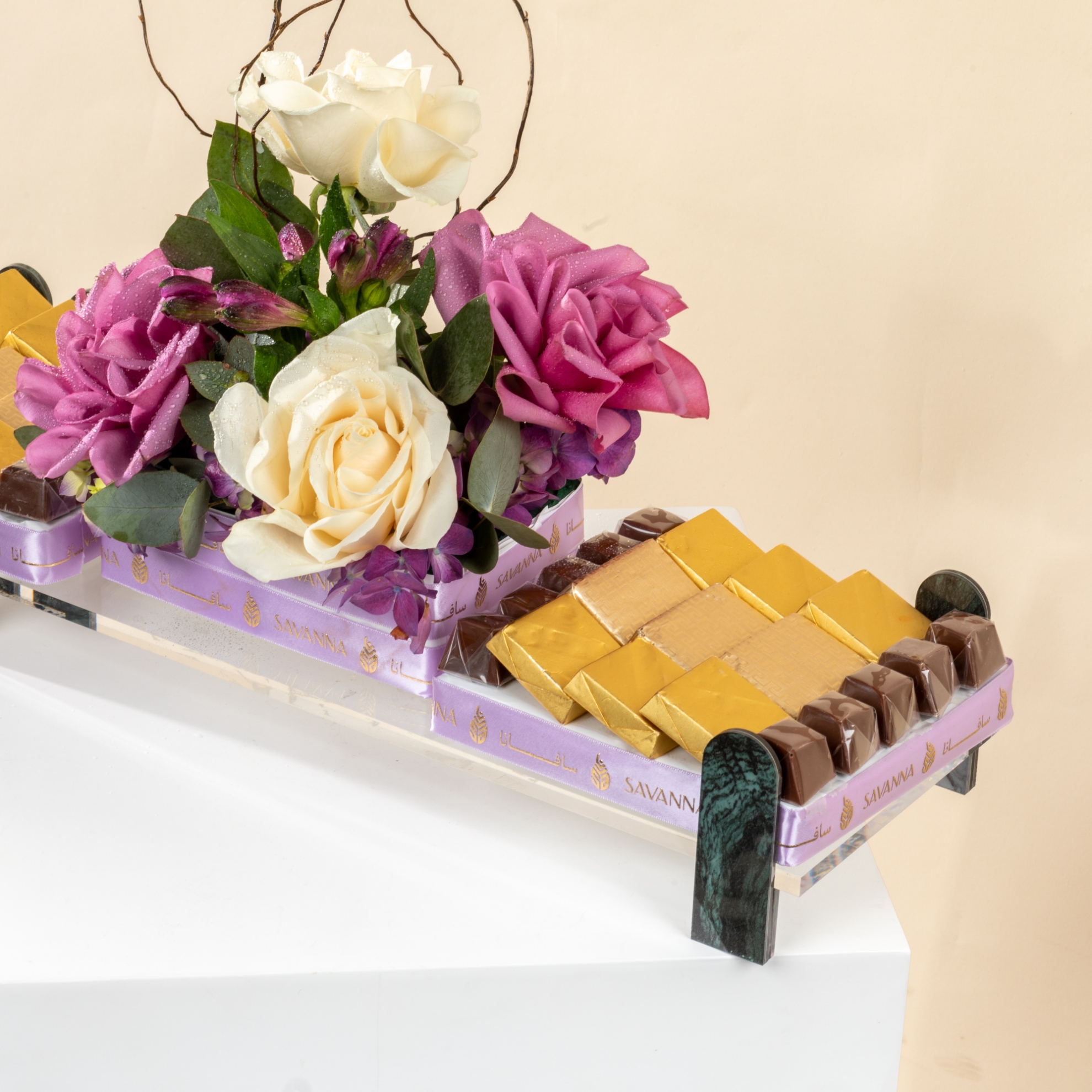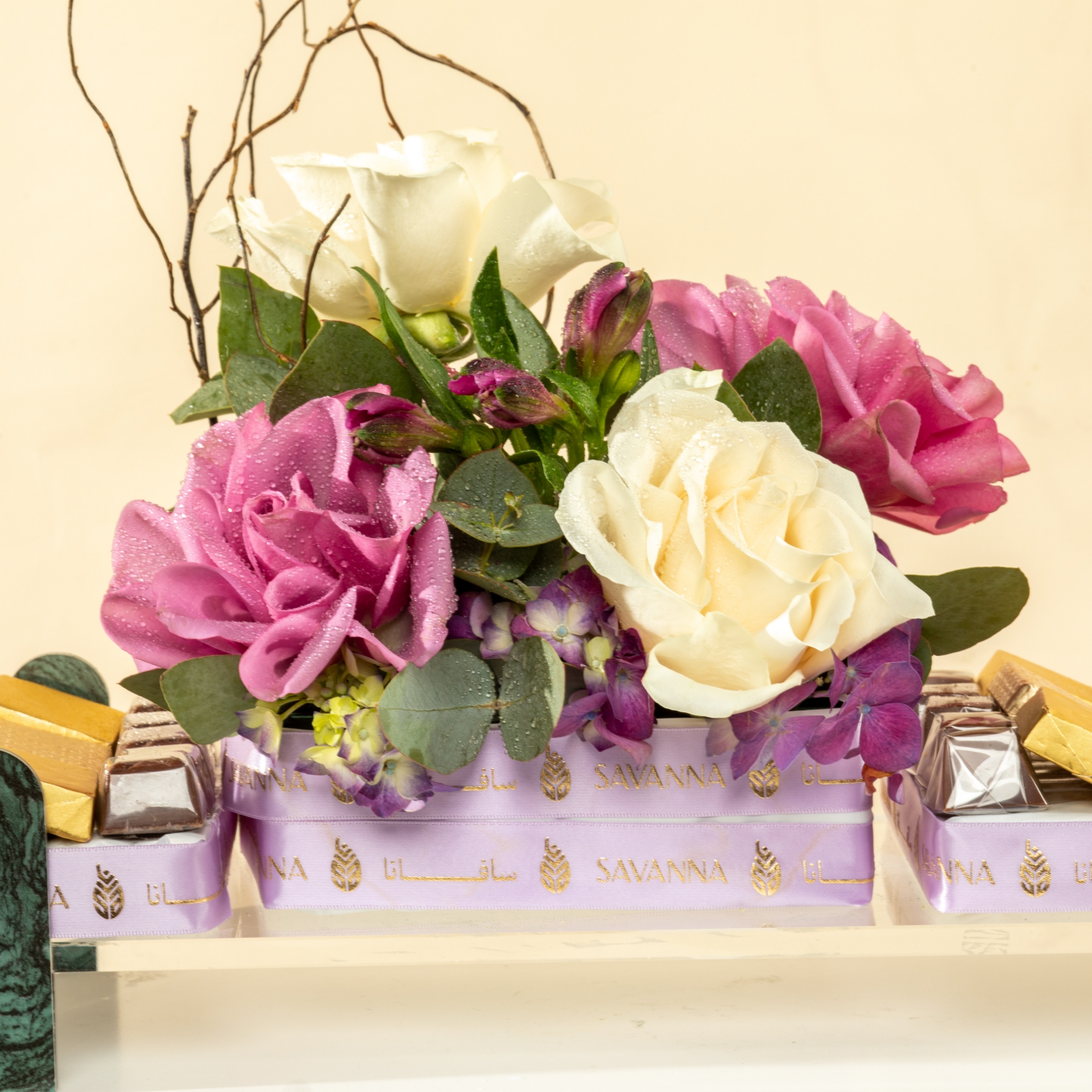 Savanna Chocolate Tray – 38 PcsMilk chocolates with mixed nuts, hazelnut, and caramel flavors, elegantly presented with purple and white roses. A luxurious treat to sweeten your Eid celebration.