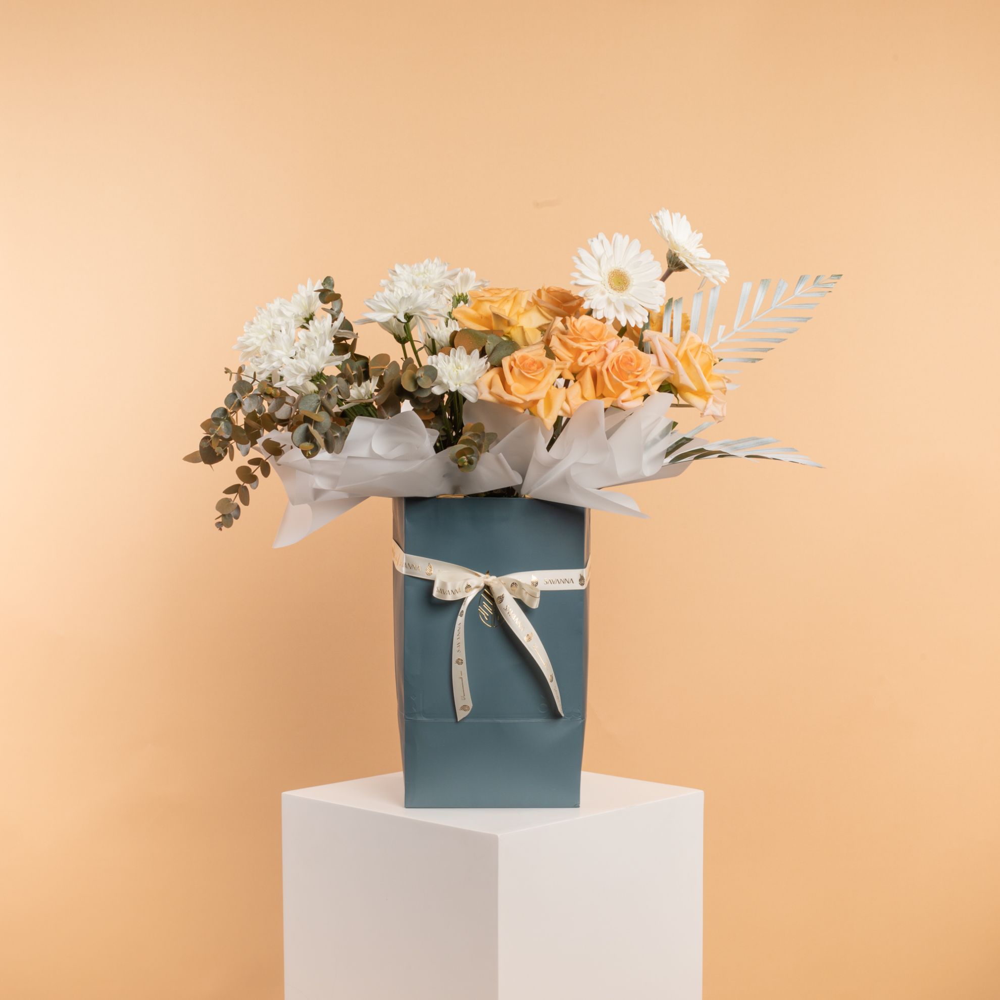 Savanna Eid Flowers Box – Celebrate Eid with a beautiful and fresh floral arrangement! This elegant box contains 7 peach roses, 3 eucalyptus stems, 2 white gerberas, 4 white chrysanthemums, 1 palm leaf, and an Eid Mubarak stick to complete the festive touch. A perfect gift to share the joy of Eid. Available now at Savanna Boutique!