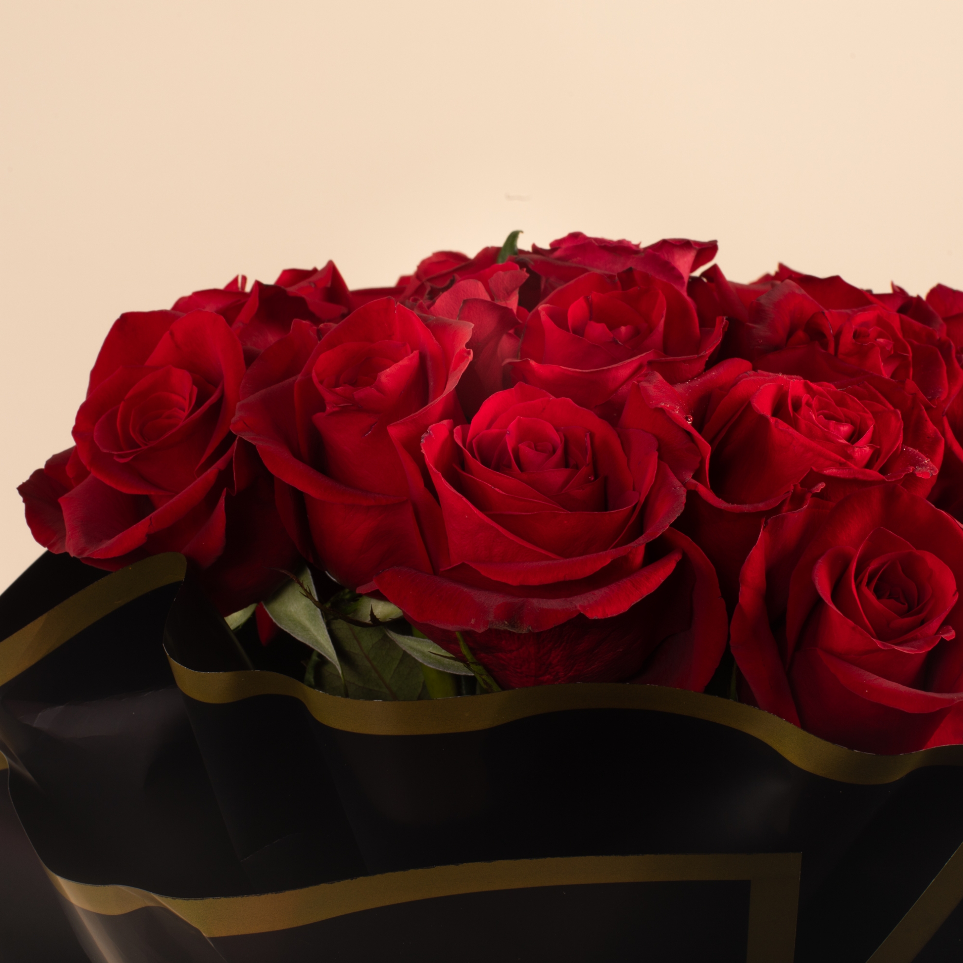 Timeless elegance and passion.This exquisite hand bouquet features 25 deep red roses, wrapped in a luxurious premium black wrap. The perfect expression of love, romance, or admiration. Available now on savanna.