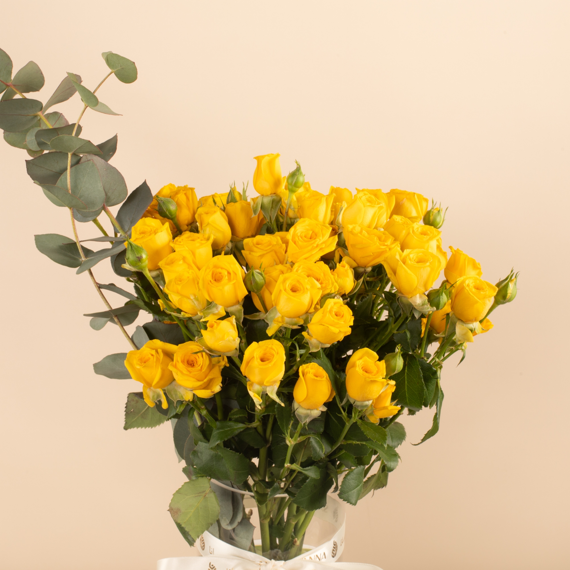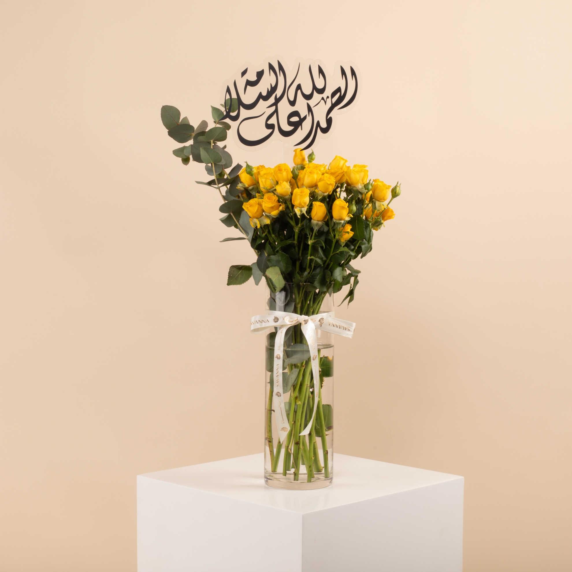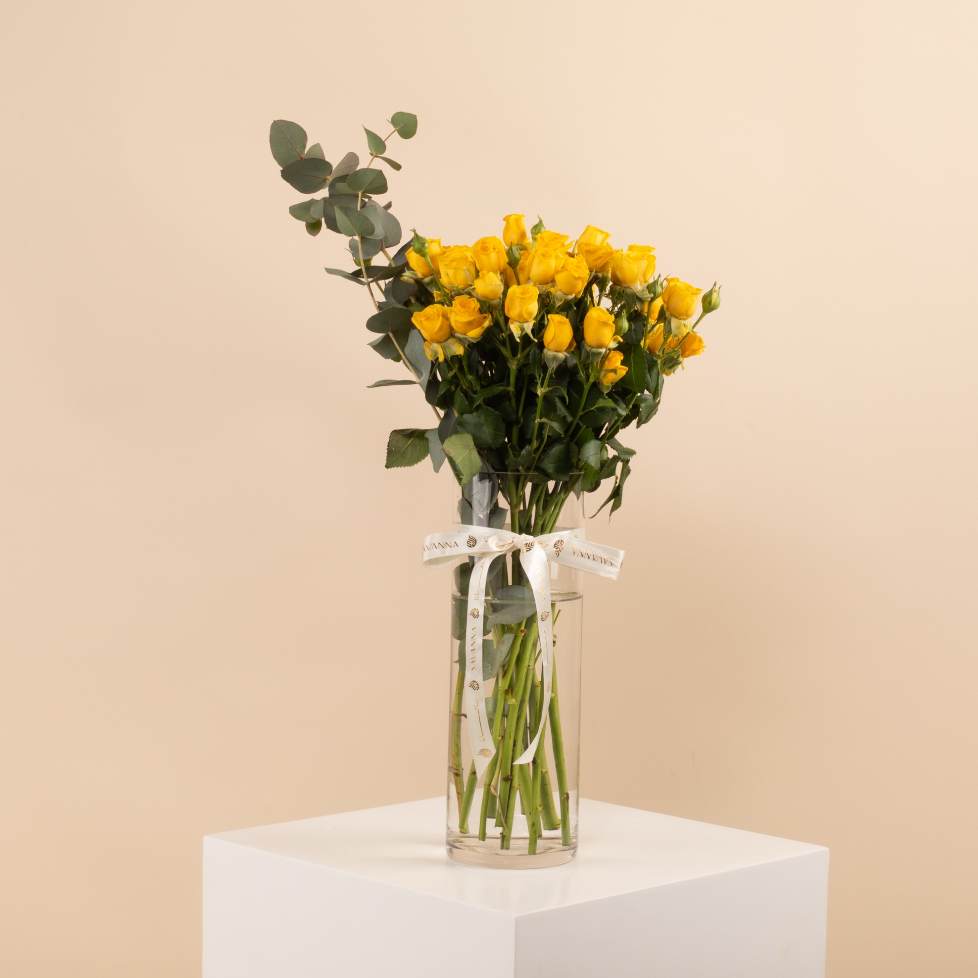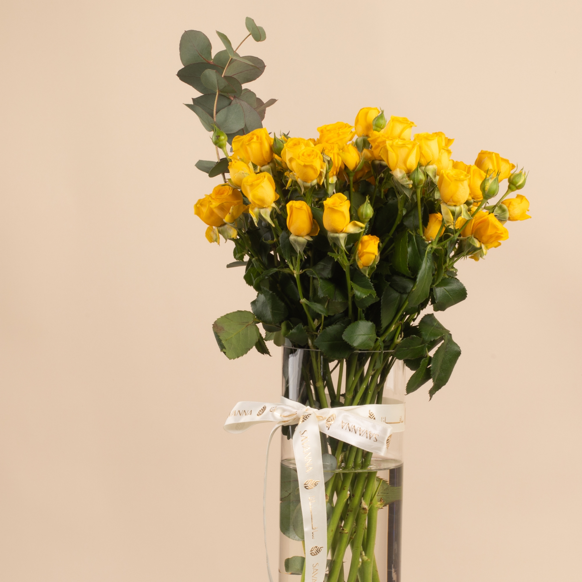 Savanna flowers vase featuring bright and cheerful yellow baby roses beautifully arranged in a clear glass vase – a perfect symbol of joy and positivity. Ideal for gifts or home décor. Order now on savanna and add sunshine to any space!