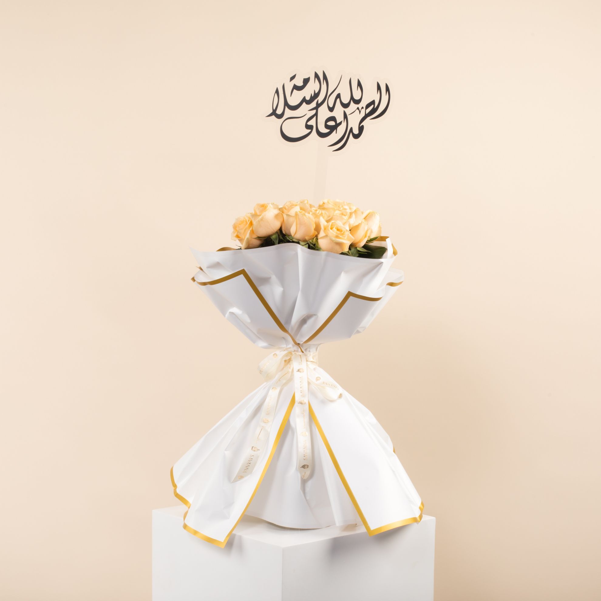 This hand bouquet of 25 peach roses, wrapped in elegant white, is the perfect gesture to lift someone’s spirits and wish them a speedy recovery. Thoughtful, fresh, and full of warmth—exclusively on Savanna.