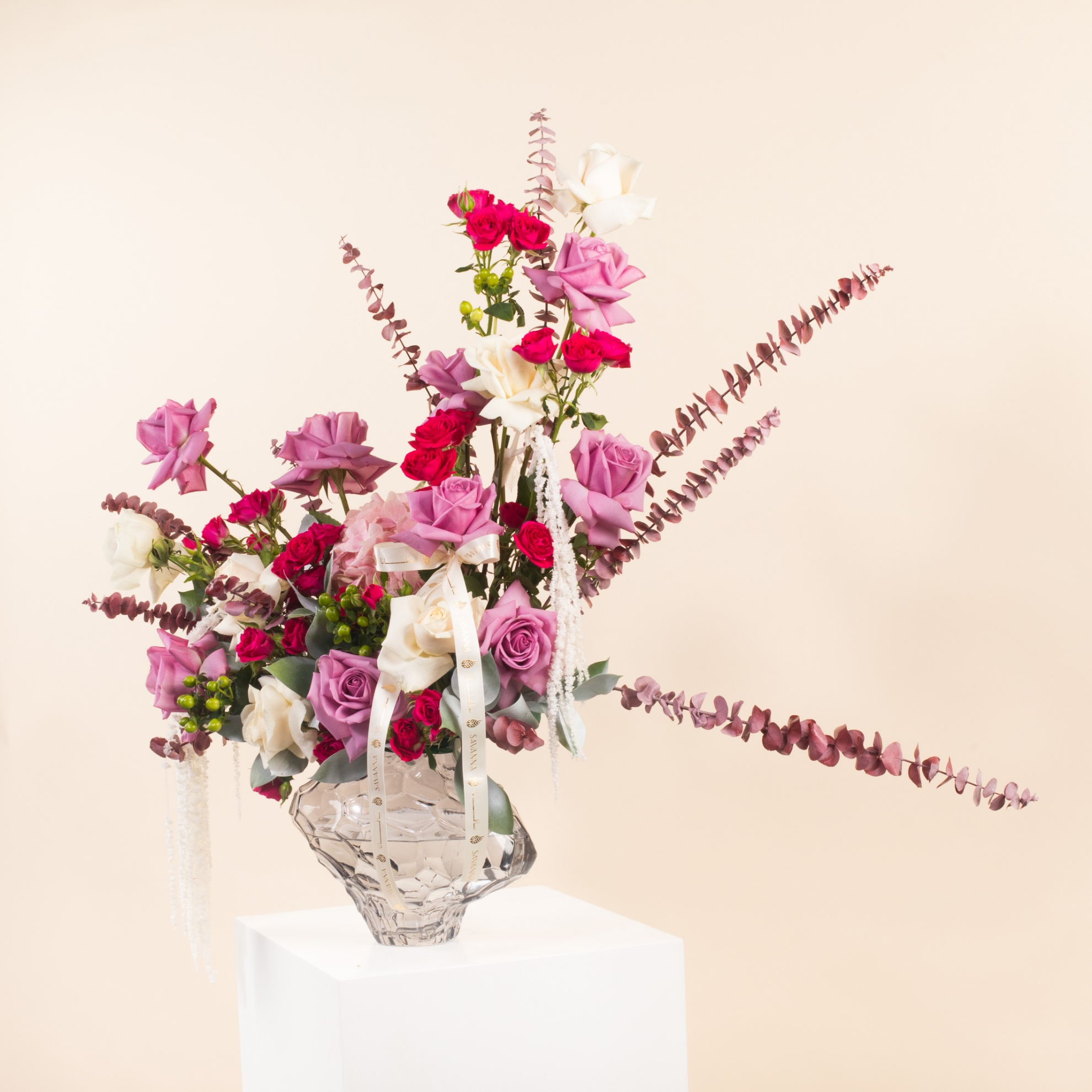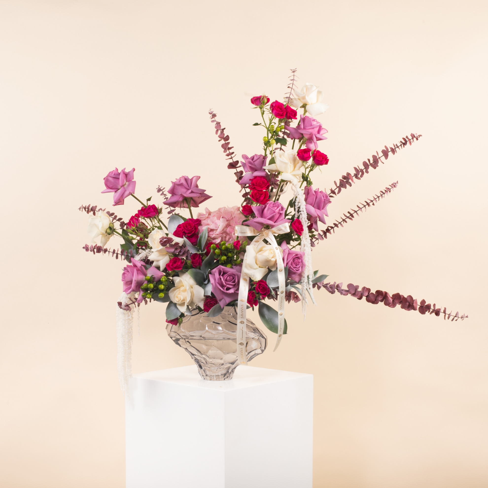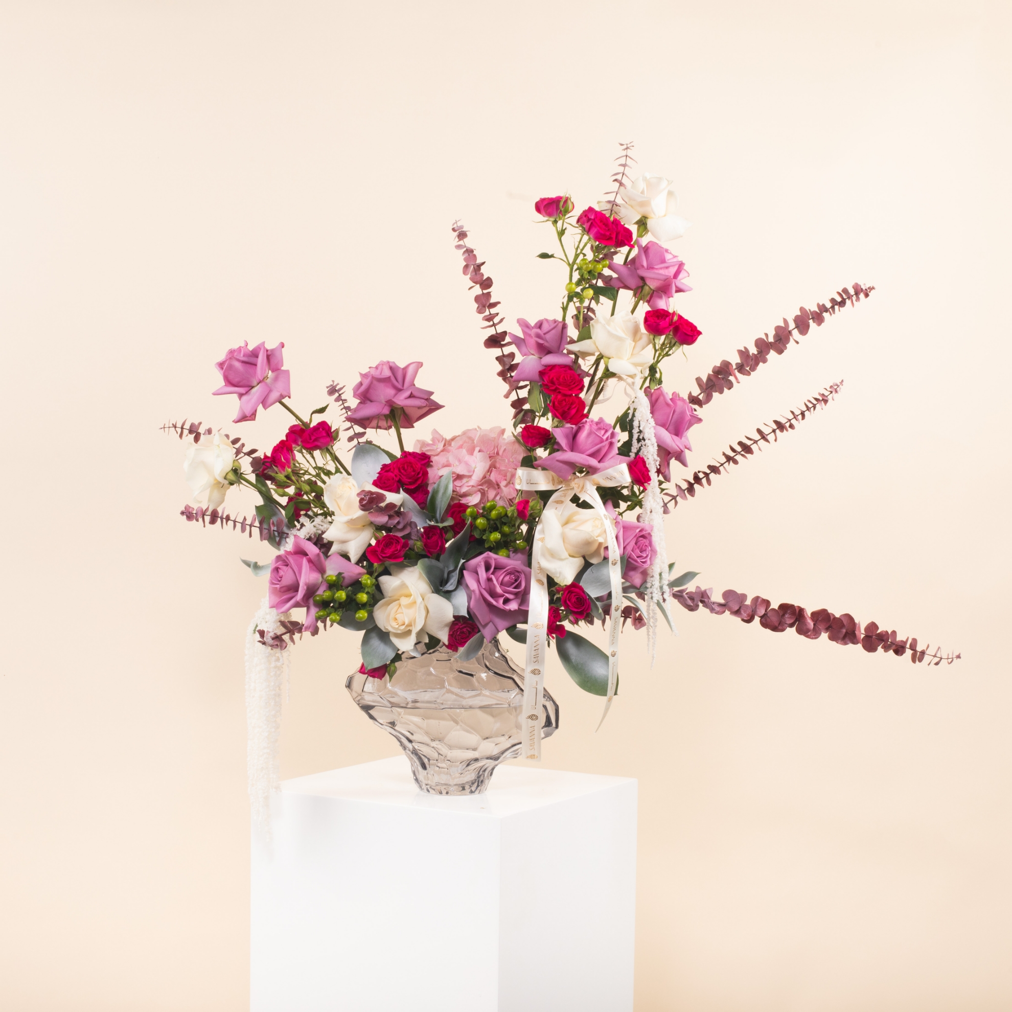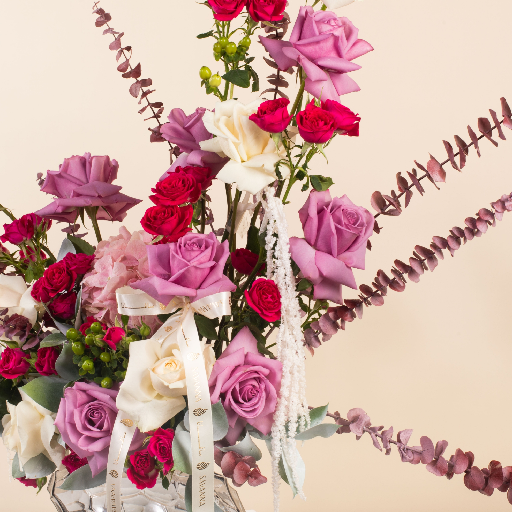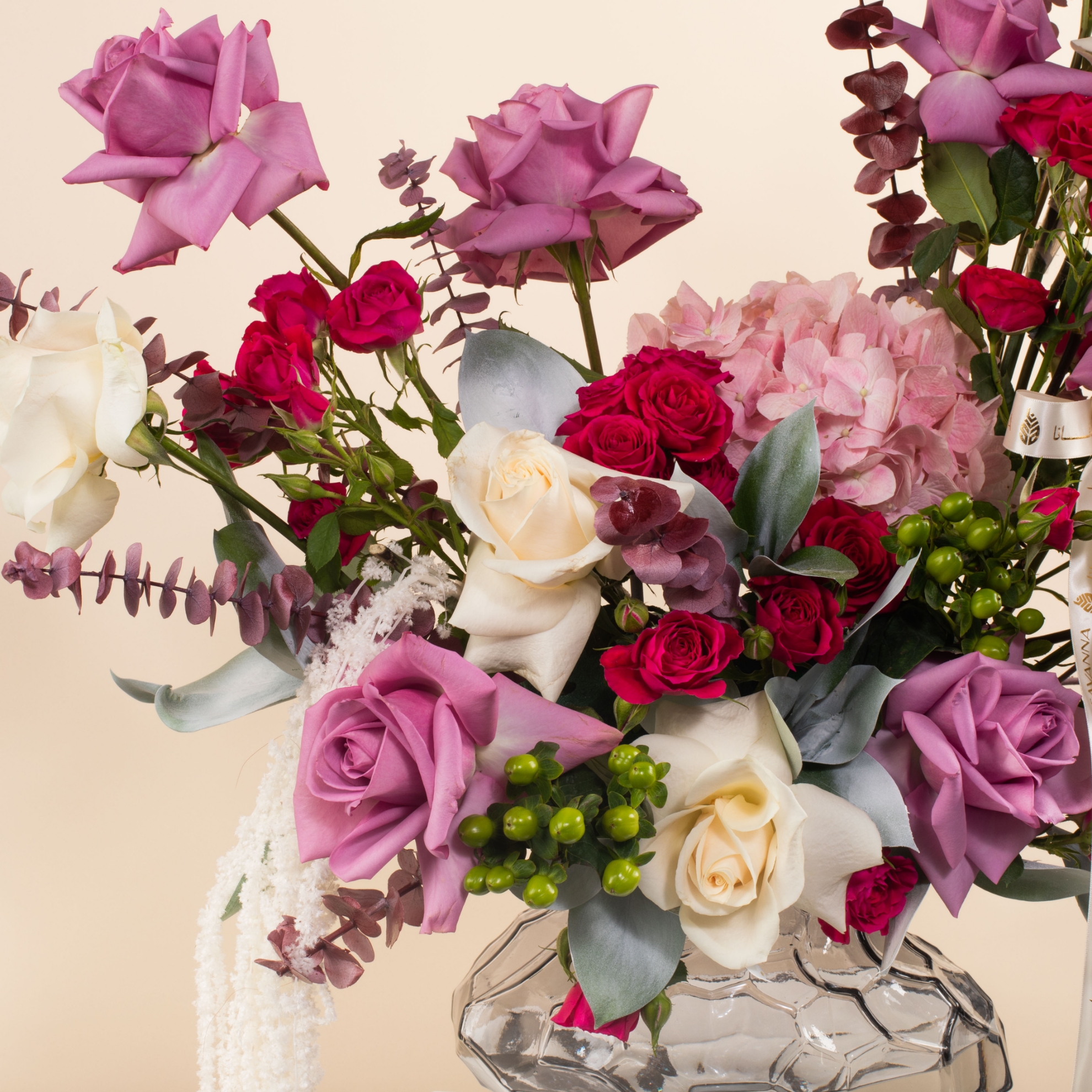 A charming mix of purple and white roses, pink hydrangea, fuchsia baby roses, green hypericum, eucalyptus, and amaranthus—perfectly arranged for a touch of elegance and color
