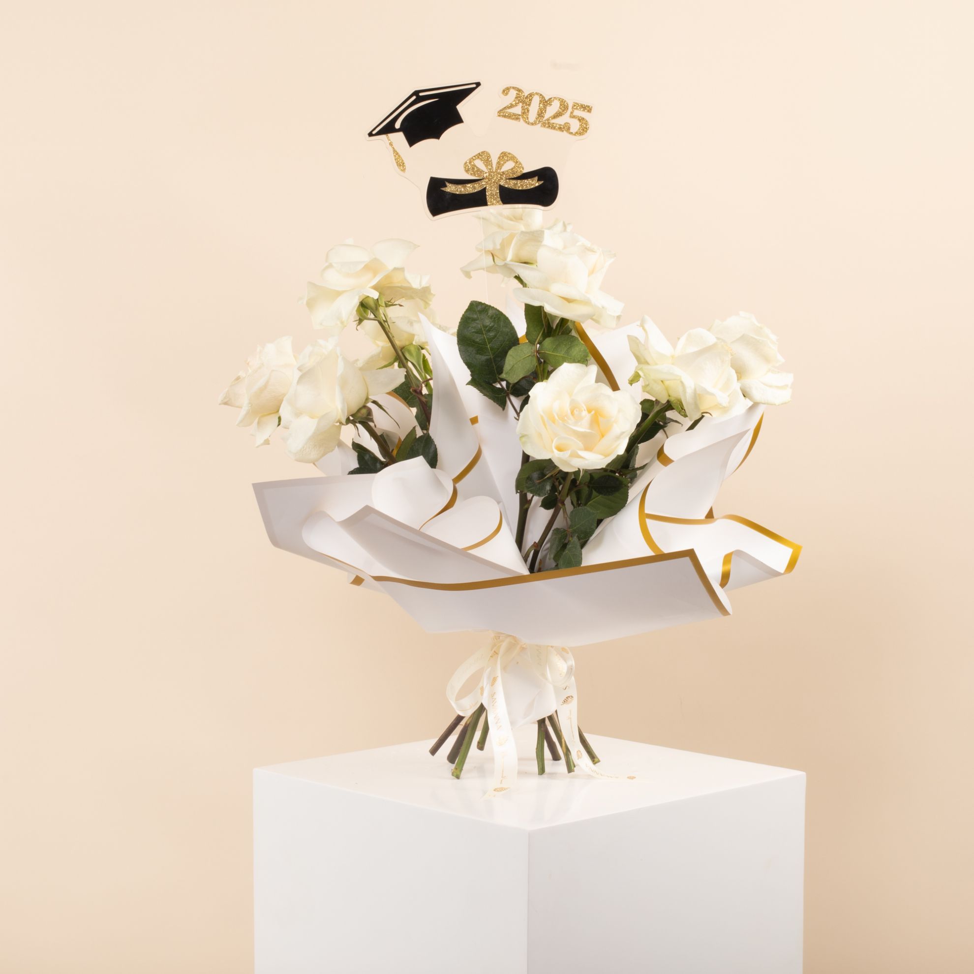 Celebrate graduation with our Hand Bouquet of 10 White Roses! Elegant and timeless, this bouquet symbolizes purity, new beginnings, and achievement. A perfect gift to mark this special occasion with grace and beauty. Order now and make their graduation day even more memorable!